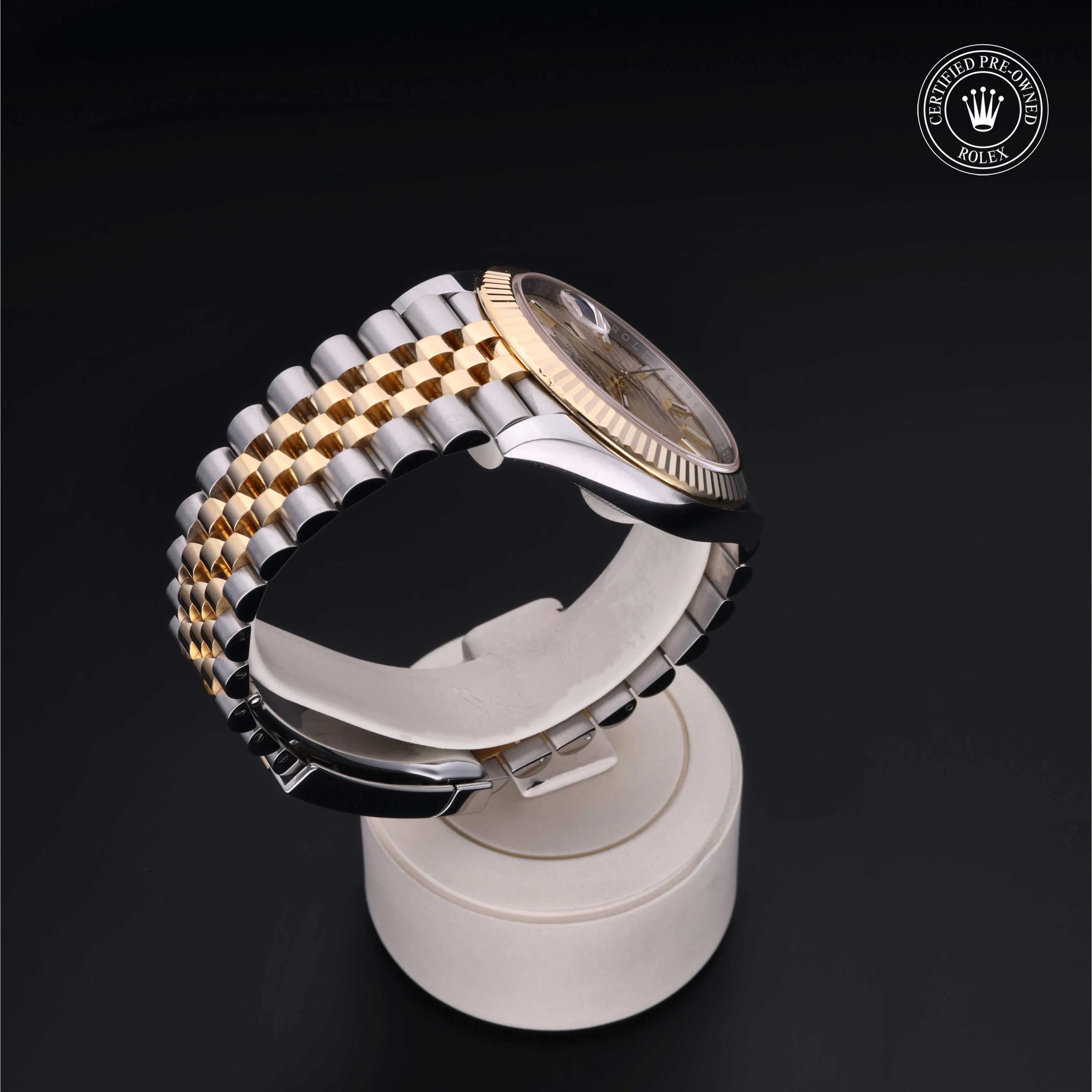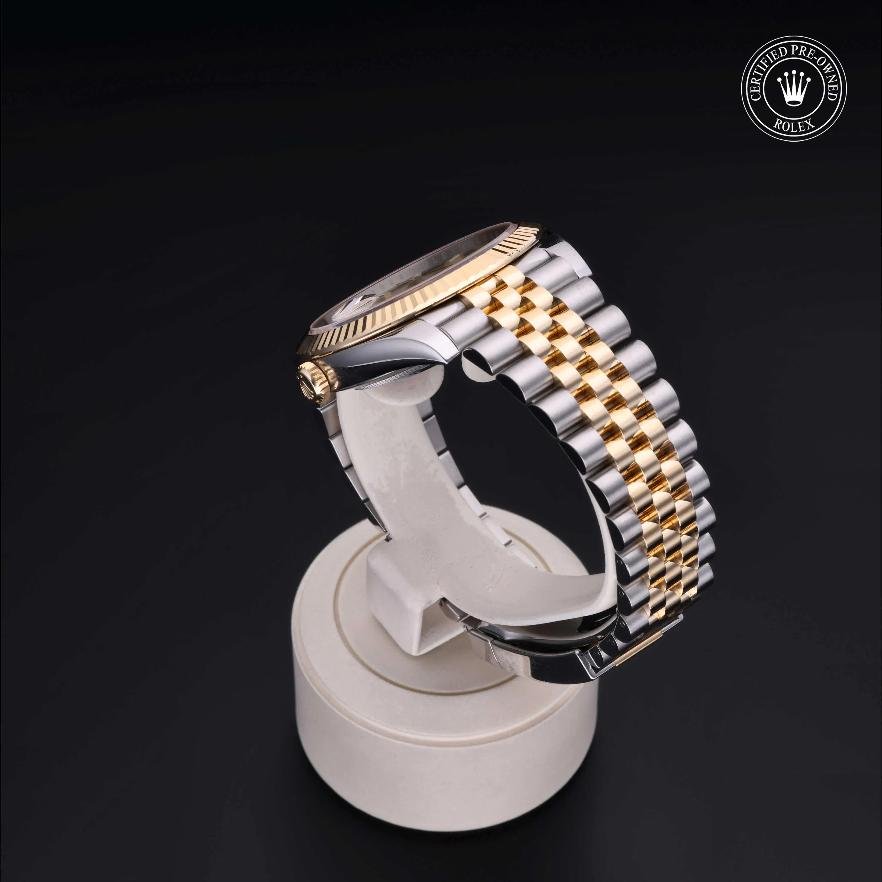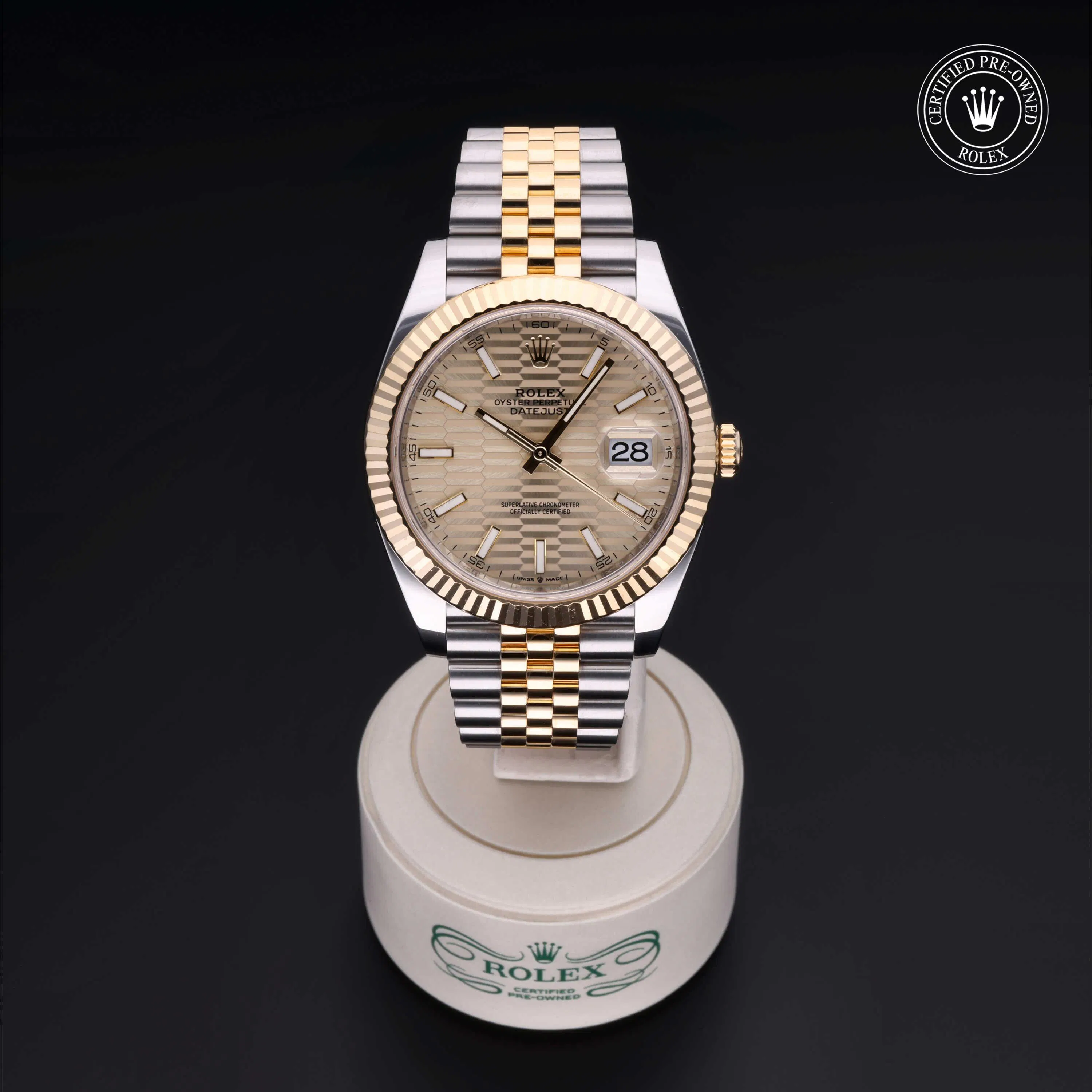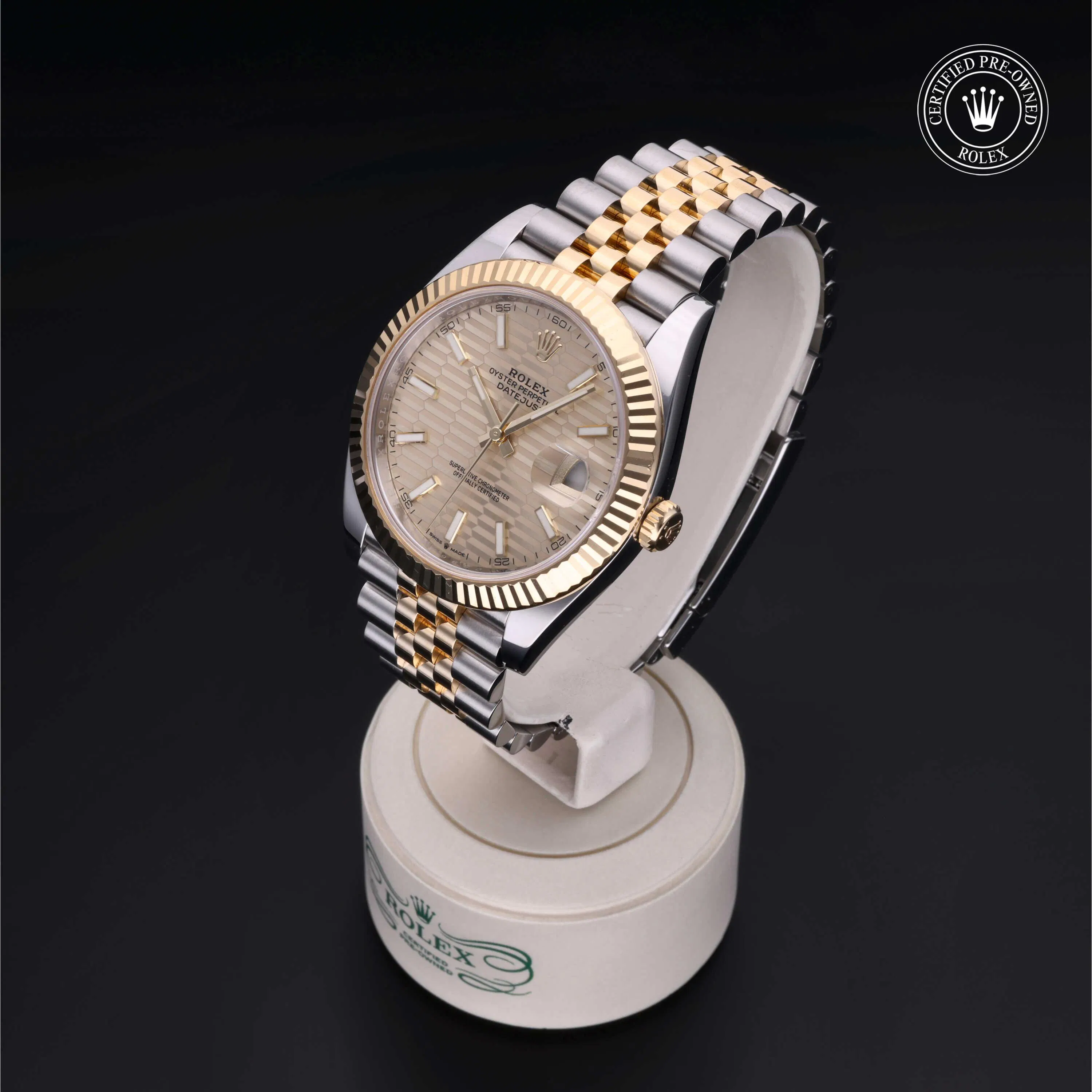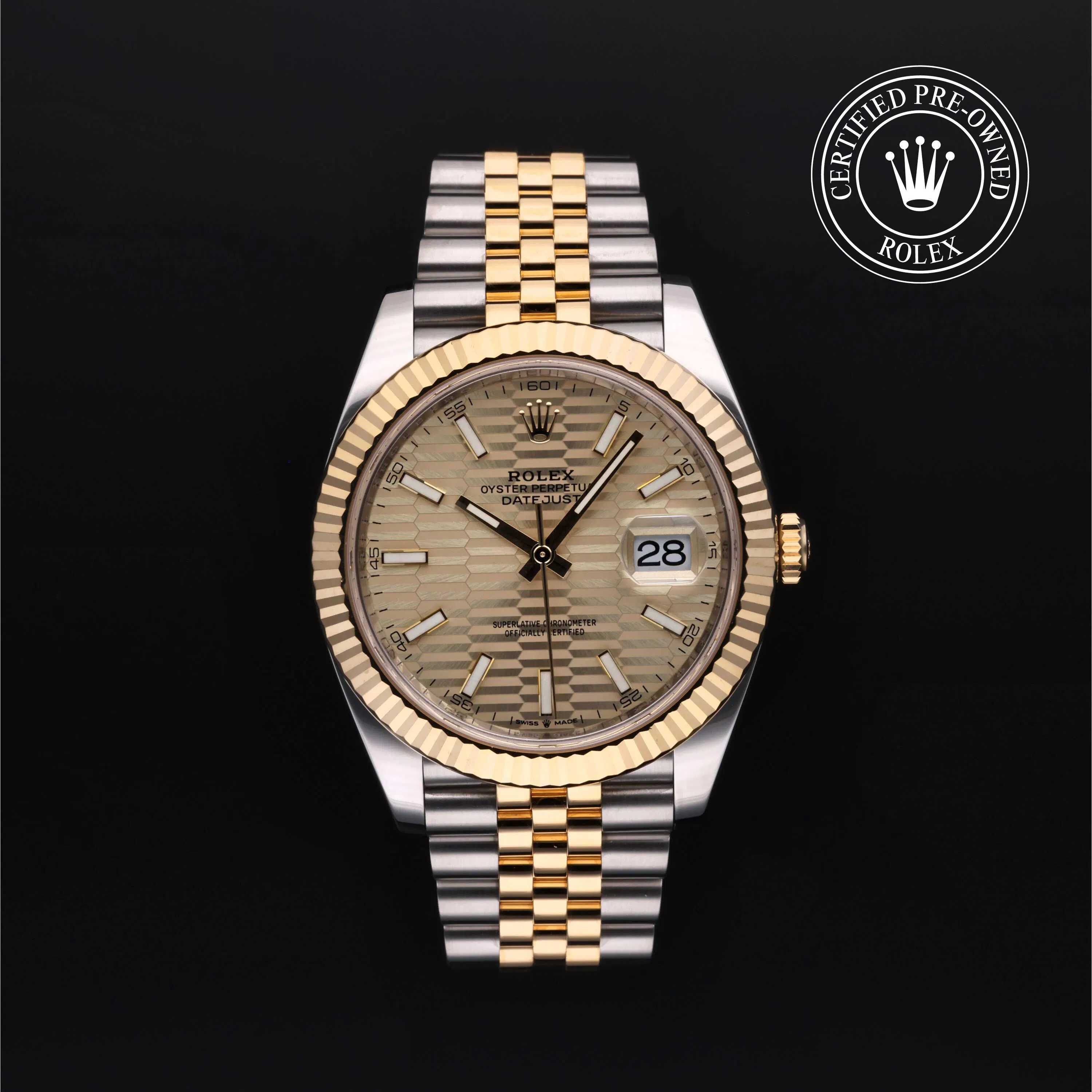Rolex Certified Pre-Owned Datejust (126333) self - winding automatic watch, features a 41mm stainless steel case with an 18k yellow gold fluted bezel surrounding a golden-color fluted-motif index dial. The watch is secured on a stainless steel and 18k yellow gold Jubilee bracelet complete with a folding buckle. Functions include hours, minutes, seconds and date. This watch has been serviced by an authorized service center and certified by Rolex. It does not come with the original box or papers, but includes a custom Rolex Certified Pre-Owned hang tag, travel pouch and international warranty card.