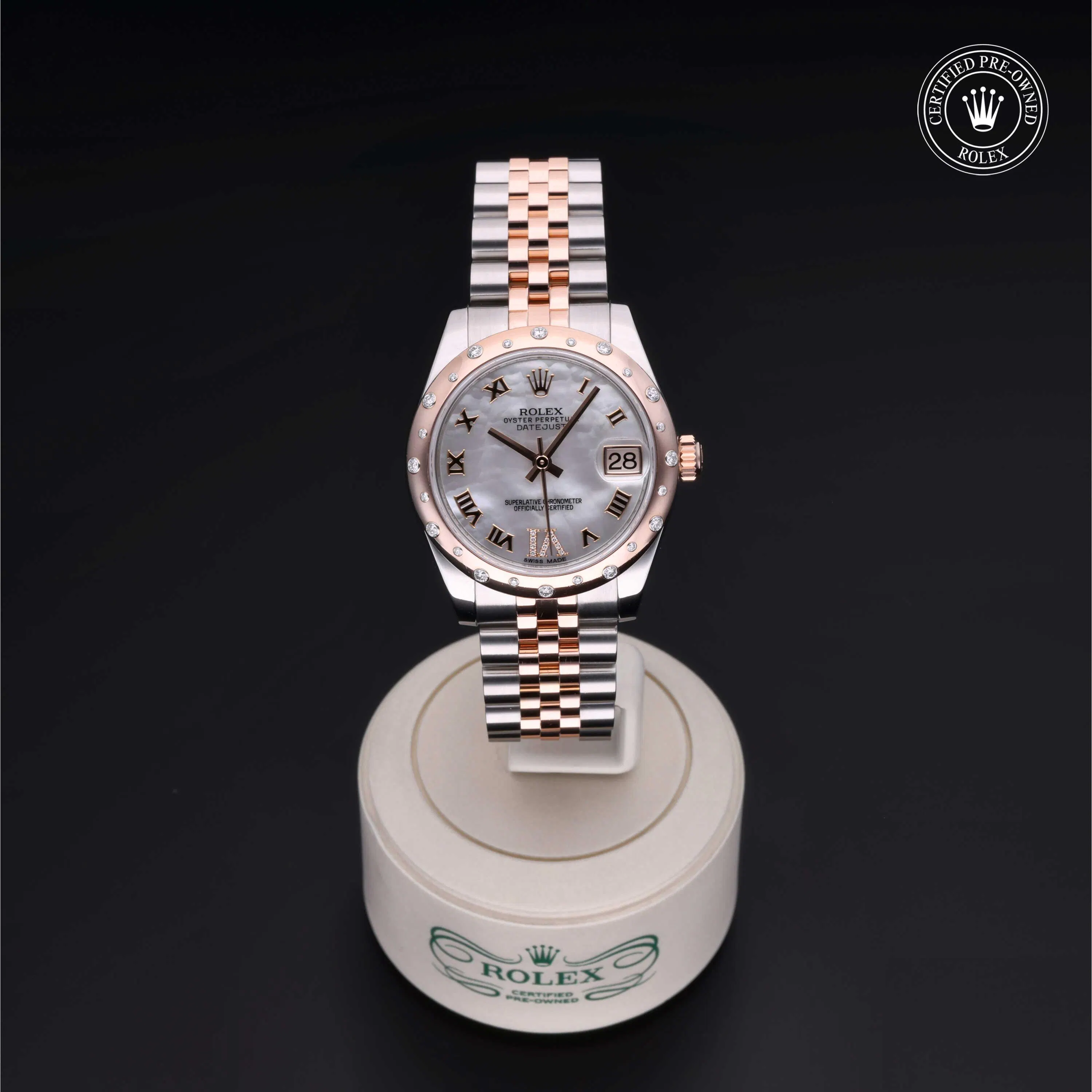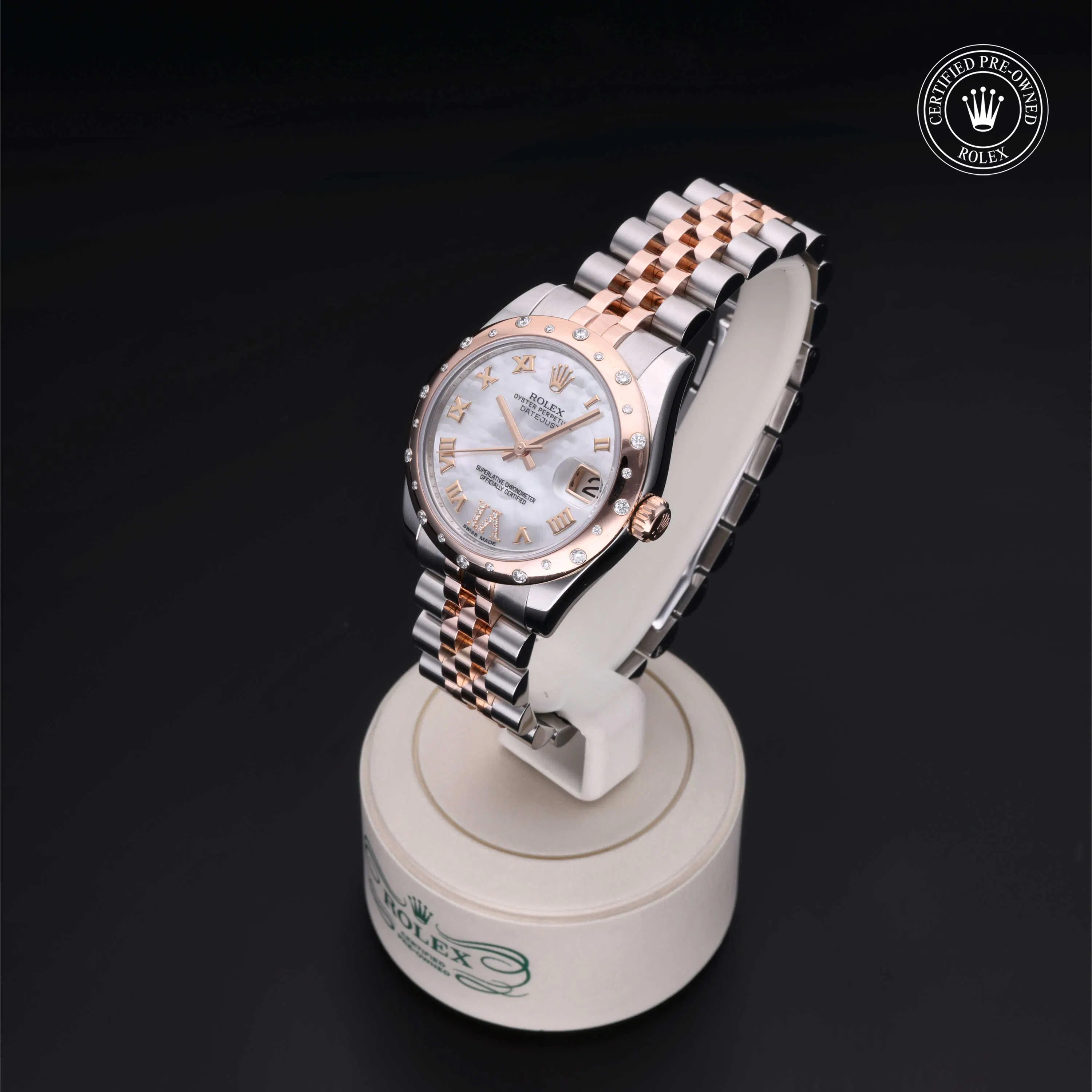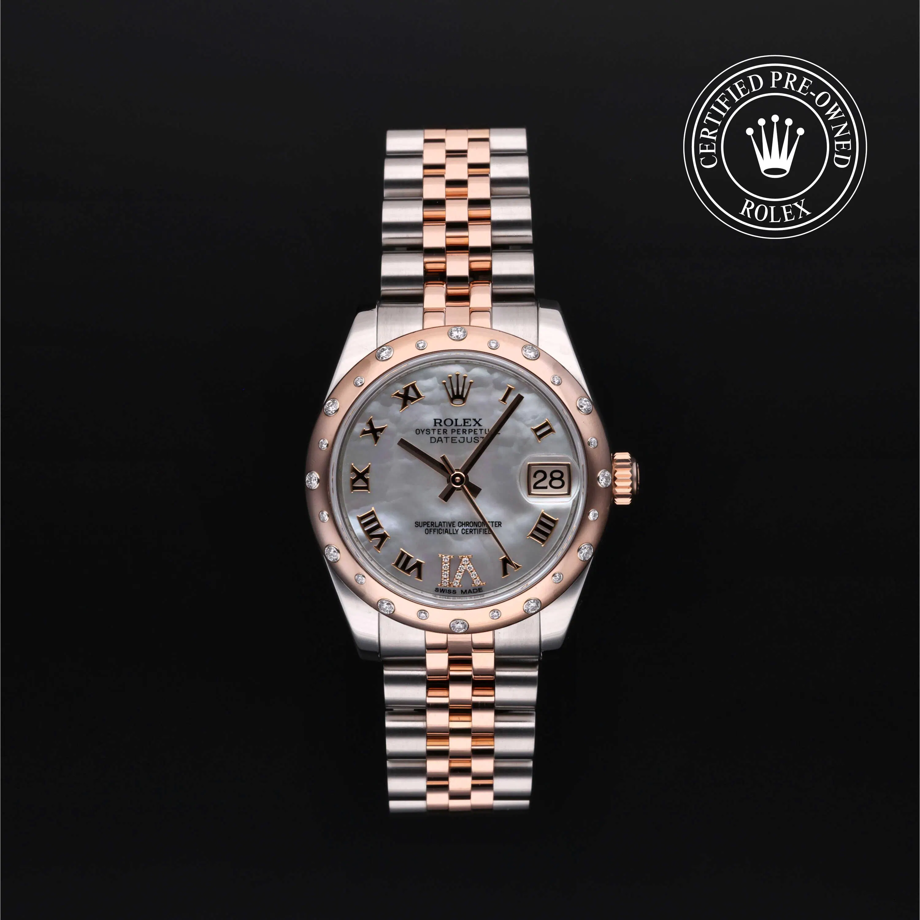 Rolex Certified Pre-Owned Datejust (178341) automatic watch, features a 31mm stainless steel case with an 18k rose gold diamond set bezel surrounding a white, mother or pearl diamond set dial on a stainless steel and 18k rose gold jubilee bracelet. Functions include hours, minutes, seconds and date. This watch has received Rolex-authorized service and certification. It does not come with the original box or papers, but includes a custom Rolex Certified Pre-Owned hang tag, travel pouch and RCPO international warranty card.