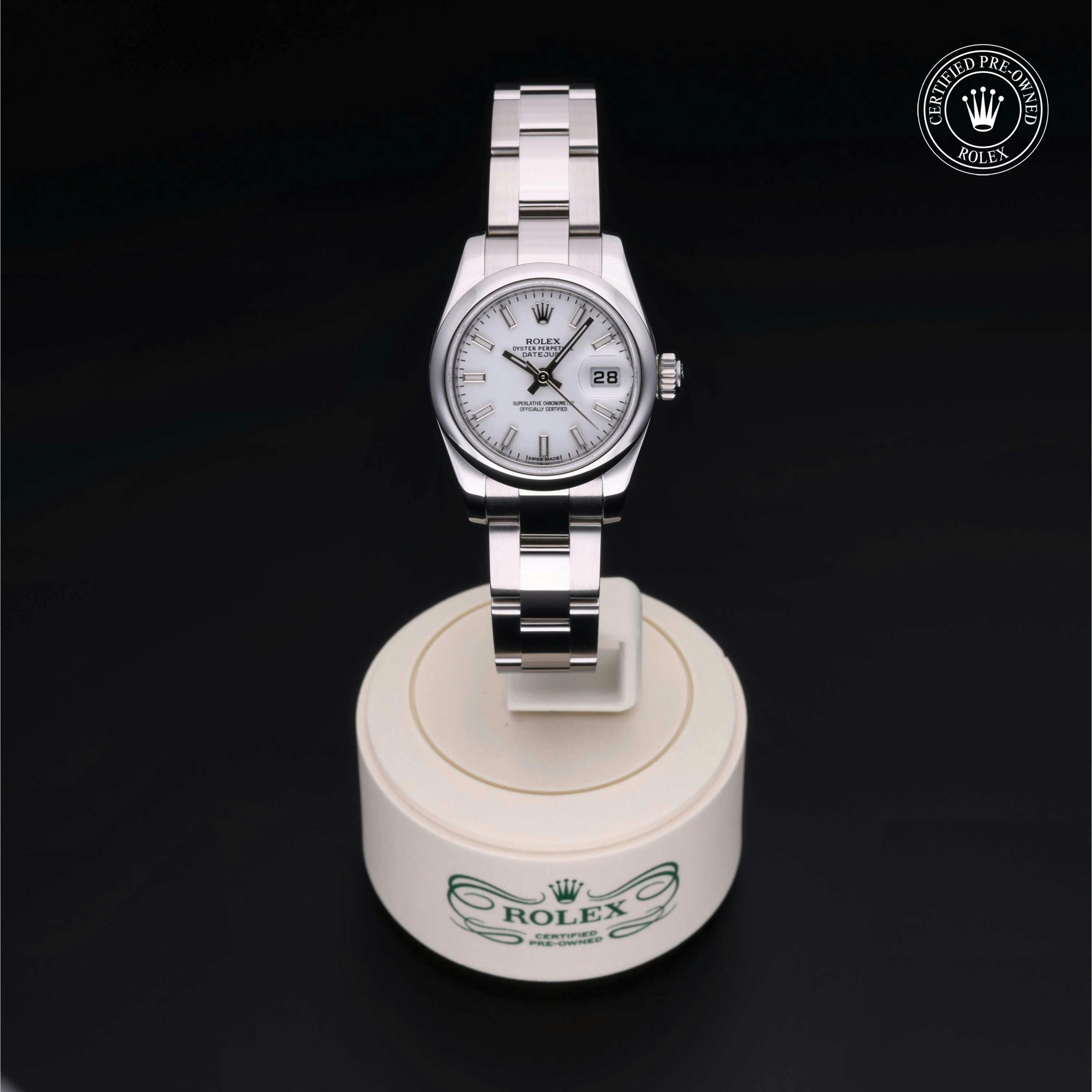 Rolex Certified Pre-Owned Datejust (179160) self - winding automatic watch, features a 26mm stainless steel case and domed bezel surrounding a white dial on a stainless steel oyster bracelet. Functions include hours, minutes, seconds and date. This watch has received Rolex-authorized service and certification. It does not come with the original box or papers, but includes a custom Rolex Certified Pre-Owned hang tag, travel pouch and RCPO international warranty card.