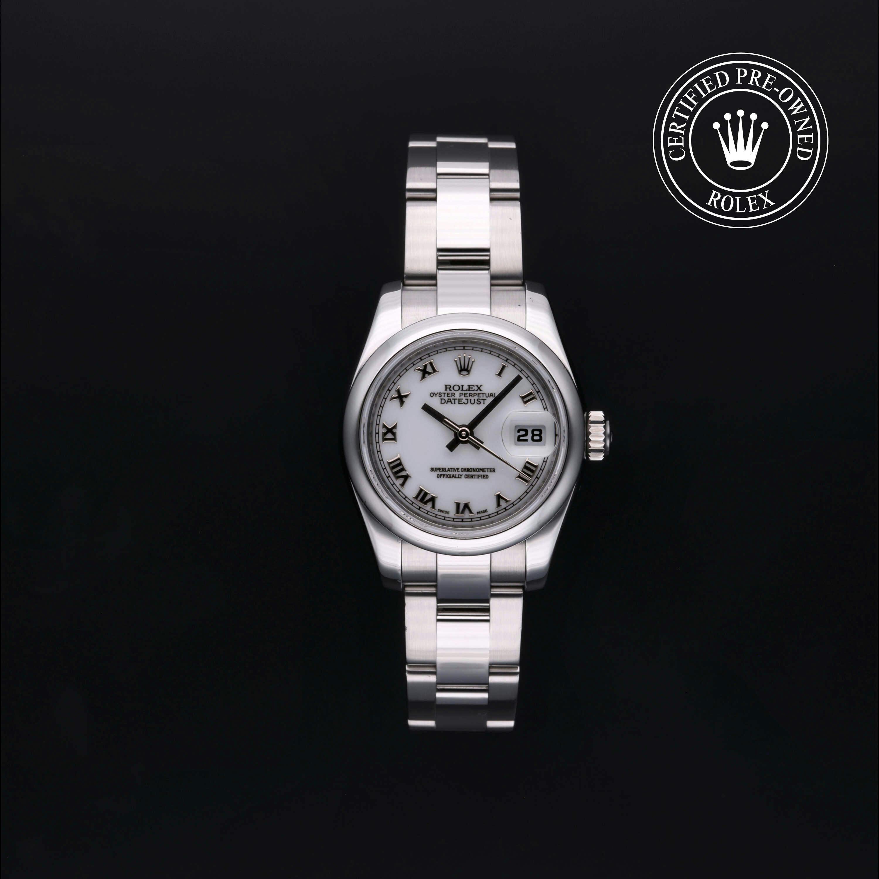 Rolex Certified Pre-Owned Datejust (179160) self - winding automatic watch, features a 26mm stainless steel case and domed bezel surrounding a white dial on a stainless steel oyster bracelet. Functions include hours, minutes, seconds and date. This watch has received Rolex-authorized service and certification. It comes with the original papers, and includes a custom Rolex Certified Pre-Owned hang tag, travel pouch and RCPO international warranty card.