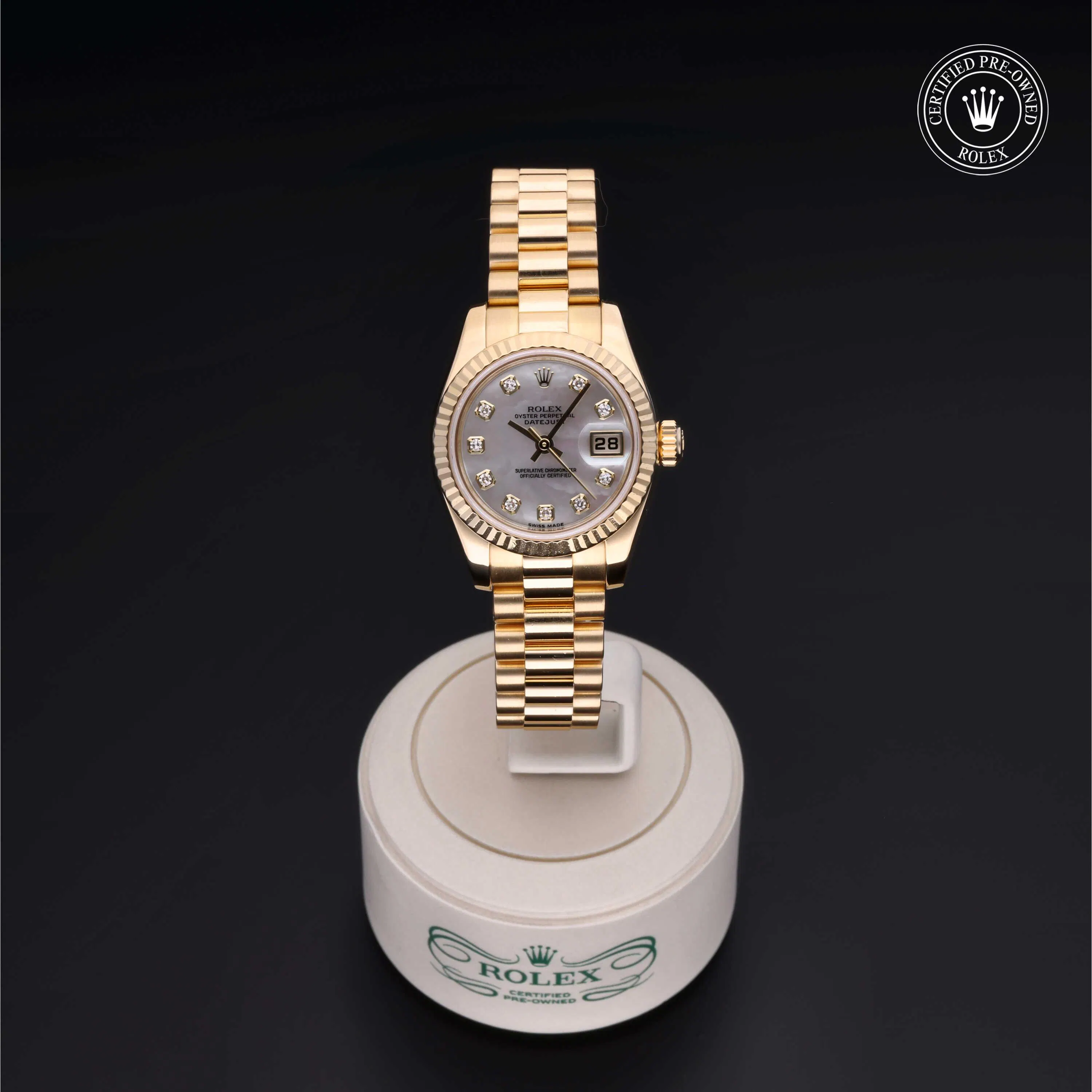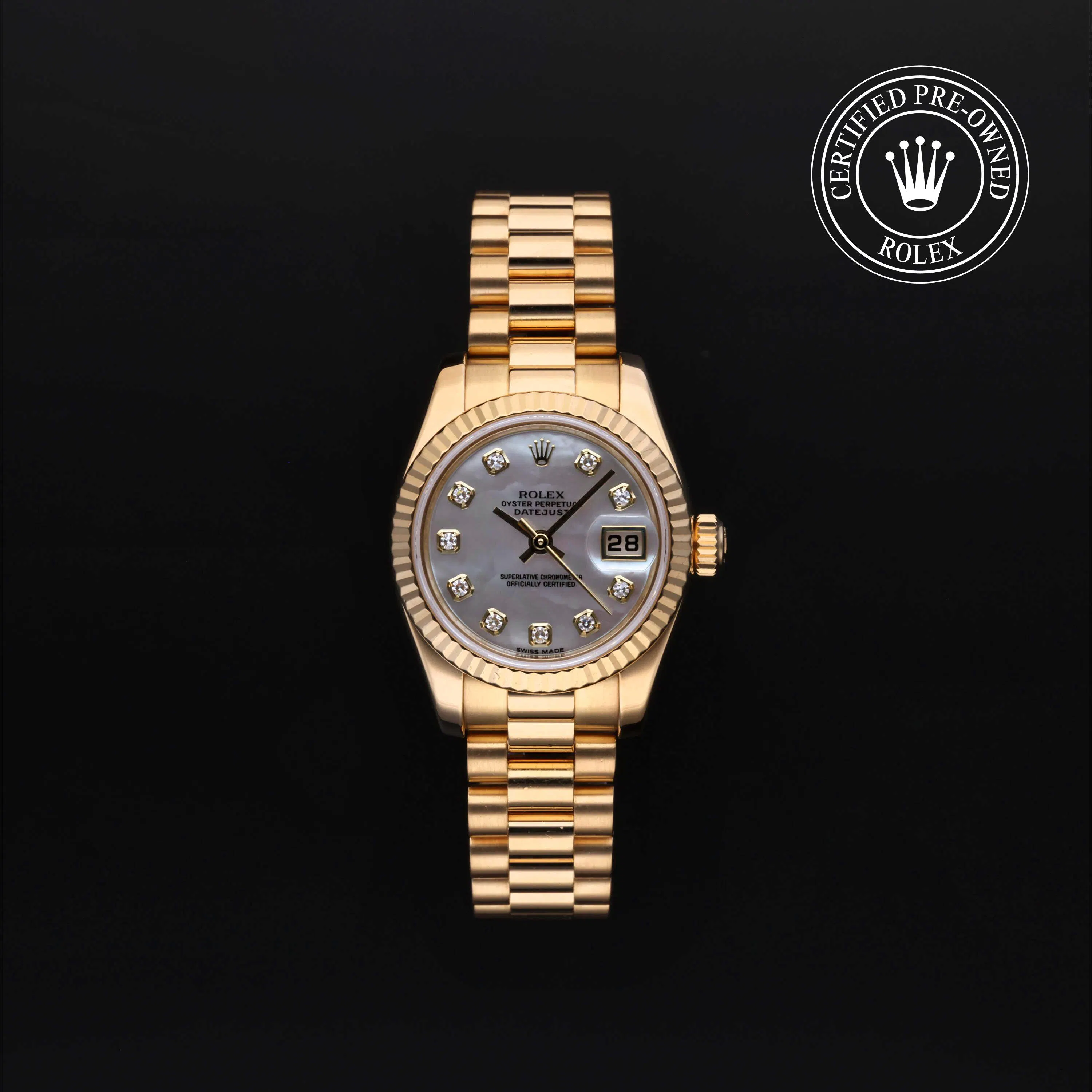 Rolex Certified Pre-Owned Datejust (179178) self - winding automatic watch, features a 26mm 18k yellow gold case and fluted bezel surrounding a white, mother of pearl diamond set dial on an 18k yellow gold president bracelet. Functions include hours, minutes, seconds and date. This watch has received Rolex-authorized service and certification. It comes with the original box and papers, and includes a custom Rolex Certified Pre-Owned hang tag, travel pouch and RCPO international warranty card.