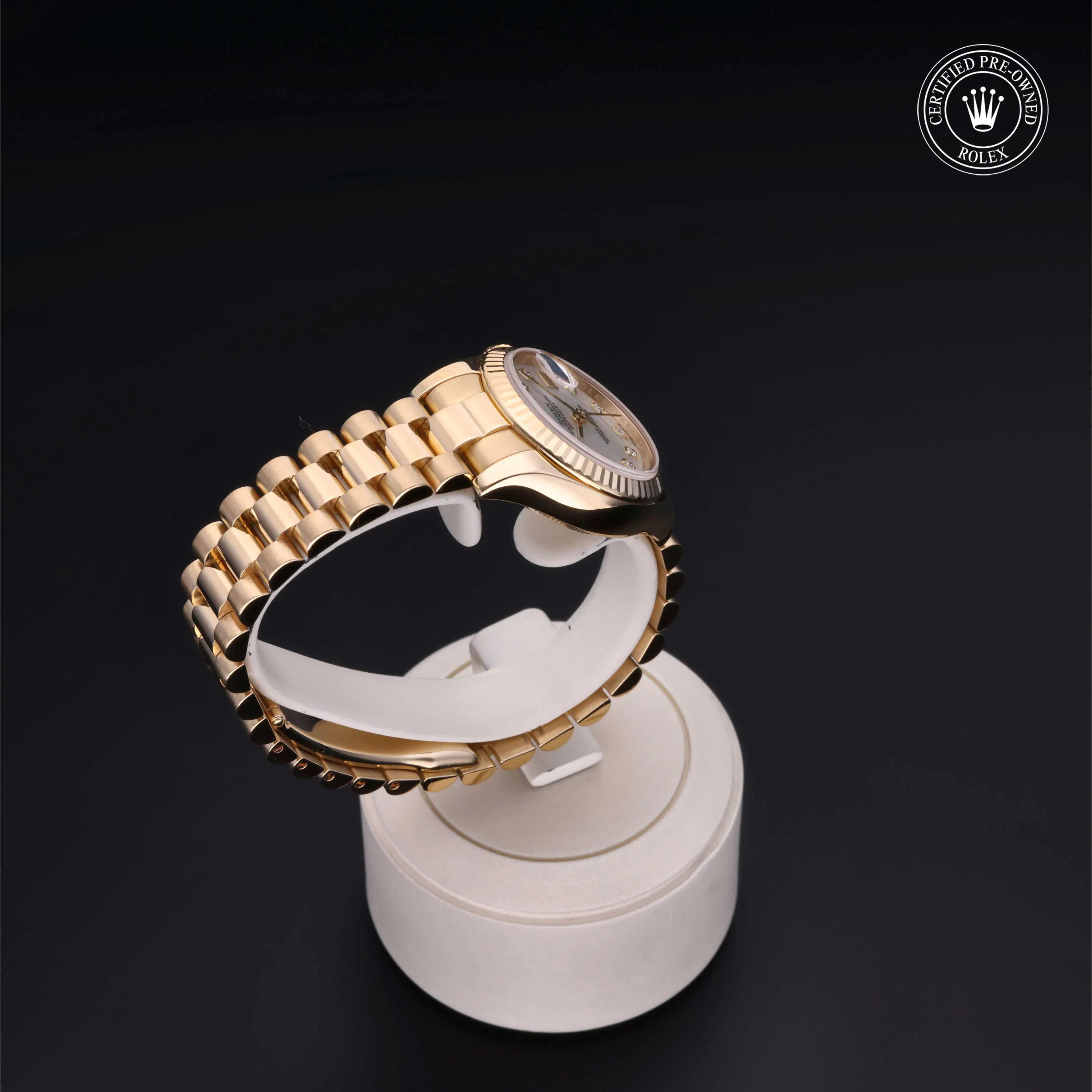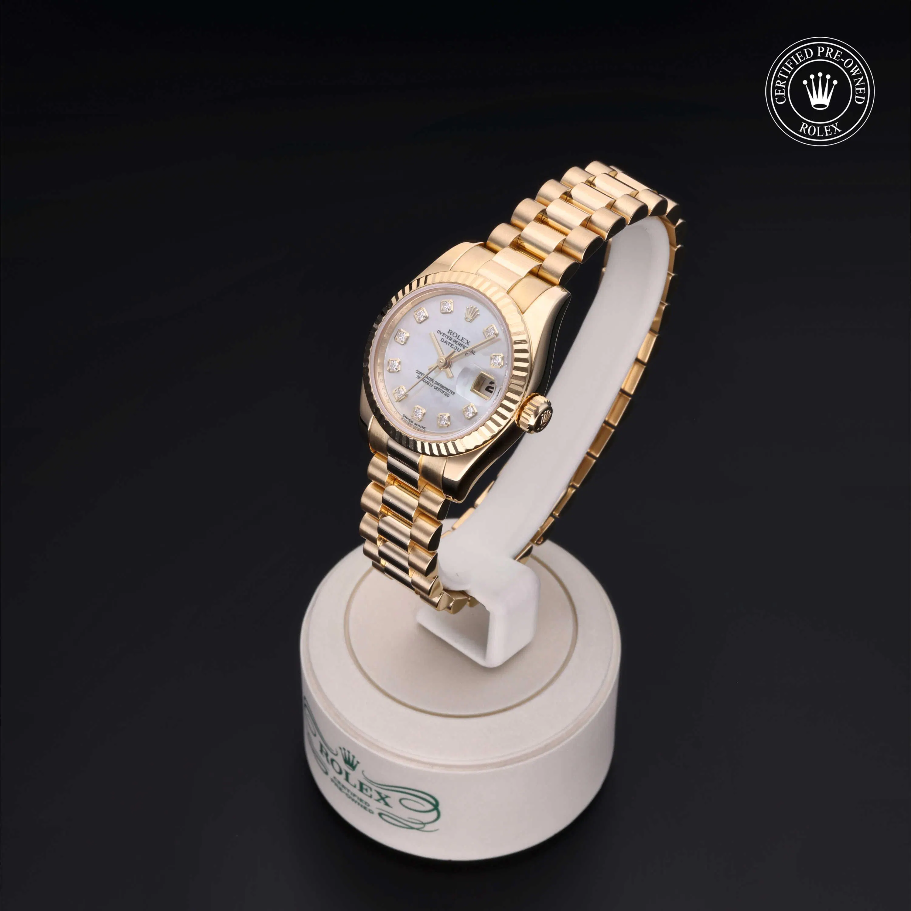 Rolex Certified Pre-Owned Datejust (179178) self - winding automatic watch, features a 26mm 18k yellow gold case and fluted bezel surrounding a white, mother of pearl diamond set dial on an 18k yellow gold president bracelet. Functions include hours, minutes, seconds and date. This watch has received Rolex-authorized service and certification. It comes with the original box and papers, and includes a custom Rolex Certified Pre-Owned hang tag, travel pouch and RCPO international warranty card.
