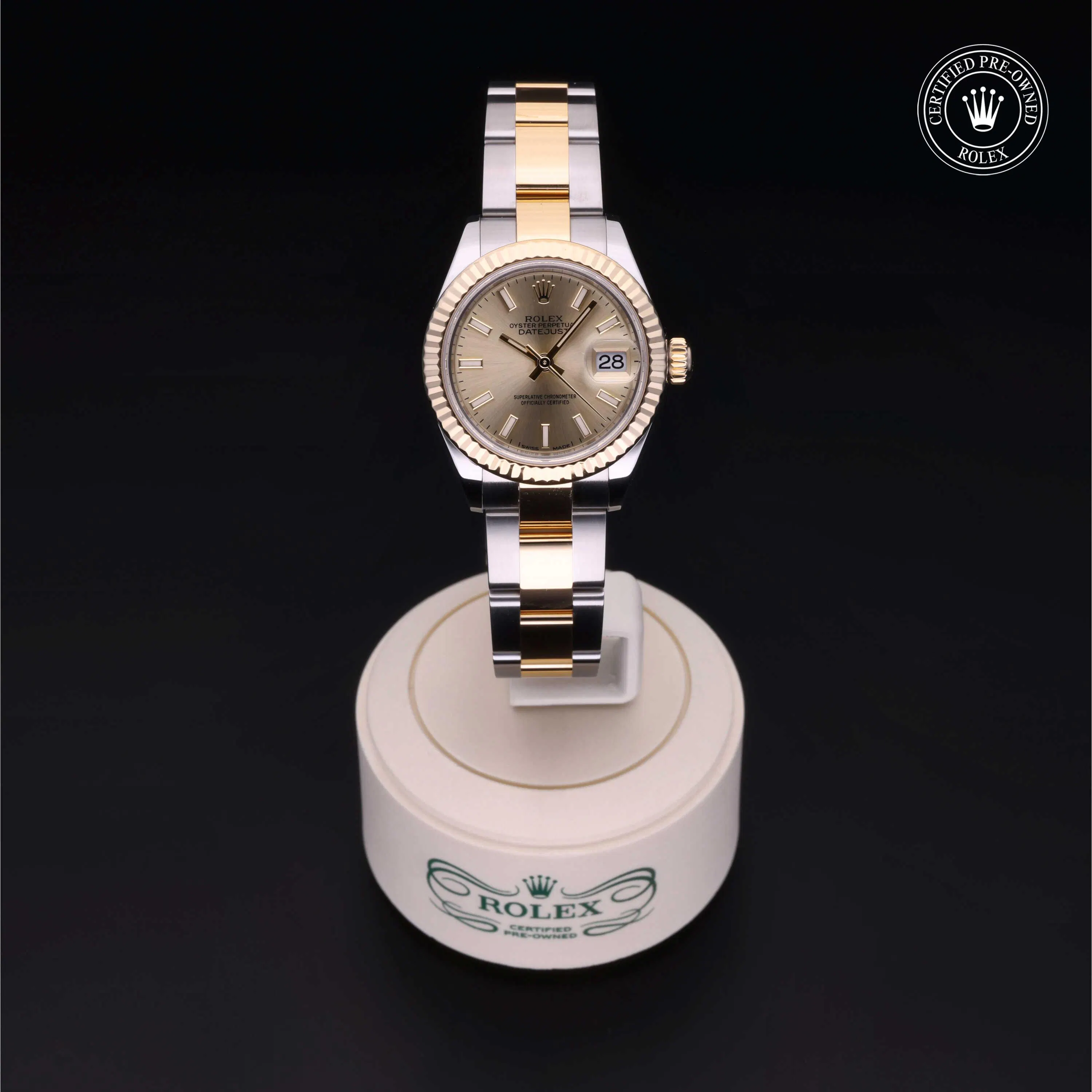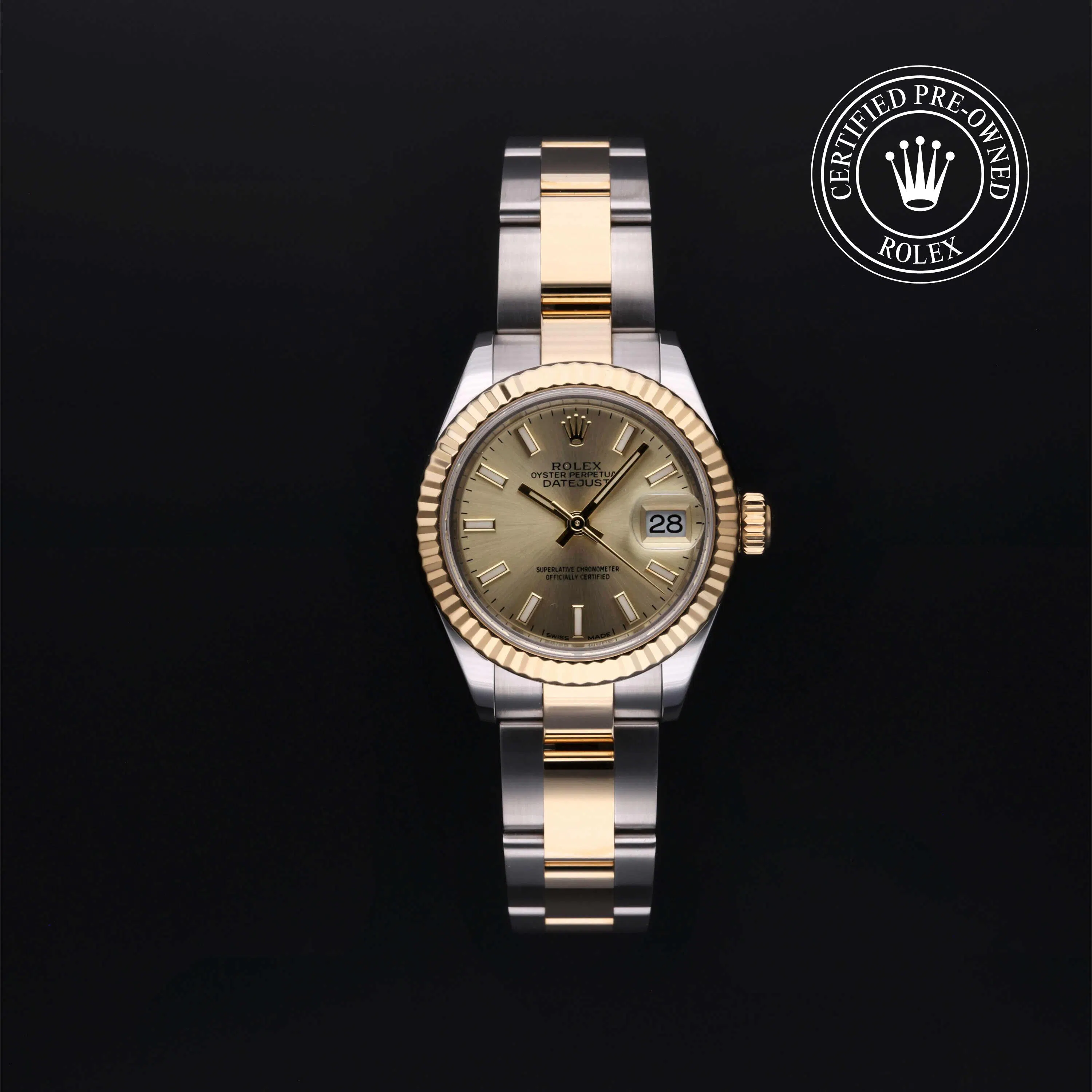 Rolex Certified Pre-Owned Datejust (279173) self - winding automatic watch, features a 28mm stainless steel case with an 18k yellow gold fluted bezel surrounding a champagne dial on a stainless steel and 18k yellow gold oyster bracelet. Functions include hours, minutes, seconds and date. This watch has received Rolex-authorized service and certification. It comes with the original papers, and includes a custom Rolex Certified Pre-Owned hang tag, travel pouch and RCPO international warranty card.