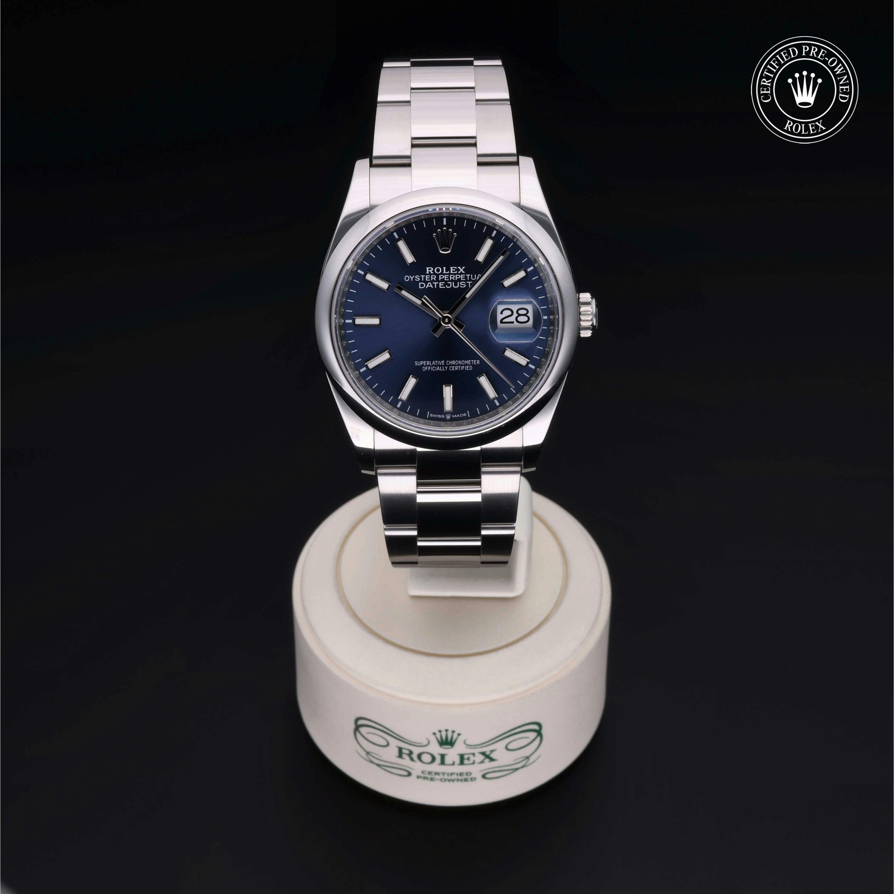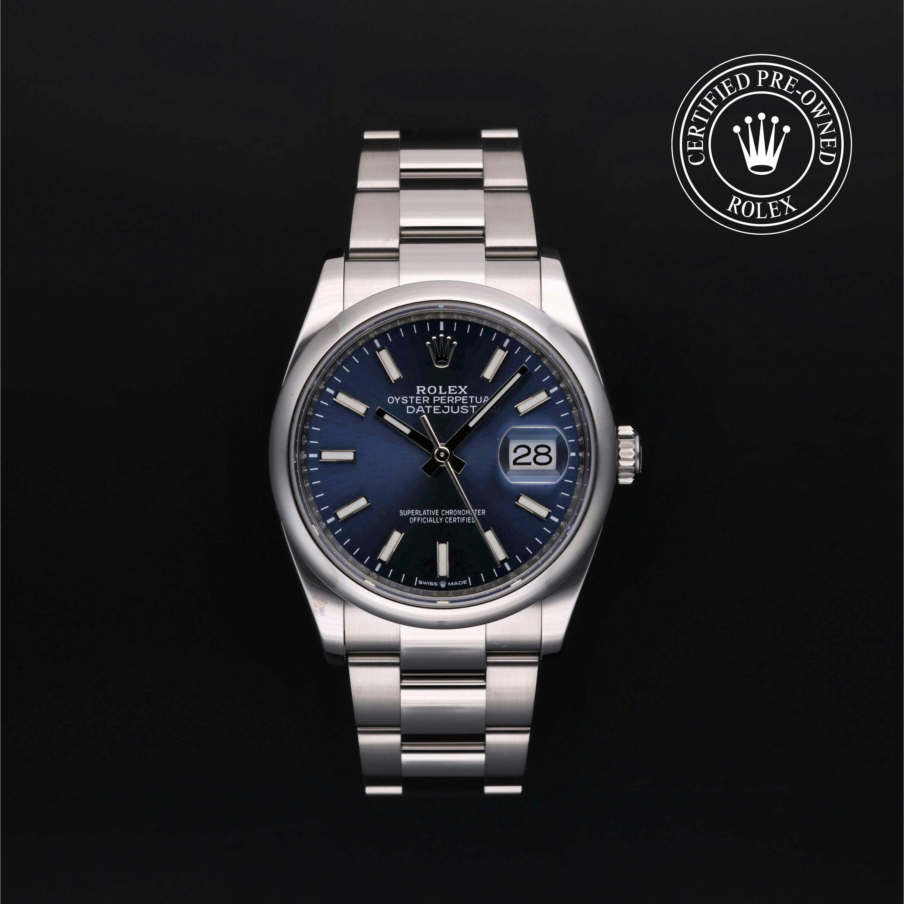 Rolex Certified Pre-Owned Datejust (126200) self - winding automatic watch, features a 36mm stainless steel case and domed bezel surrounding a bright blue dial on a stainless steel oyster bracelet. Functions include hours, minutes, seconds and date. This watch has received Rolex-authorized service and certification. It comes with the original box and papers, and includes a custom Rolex Certified Pre-Owned hang tag, travel pouch and RCPO international warranty card.