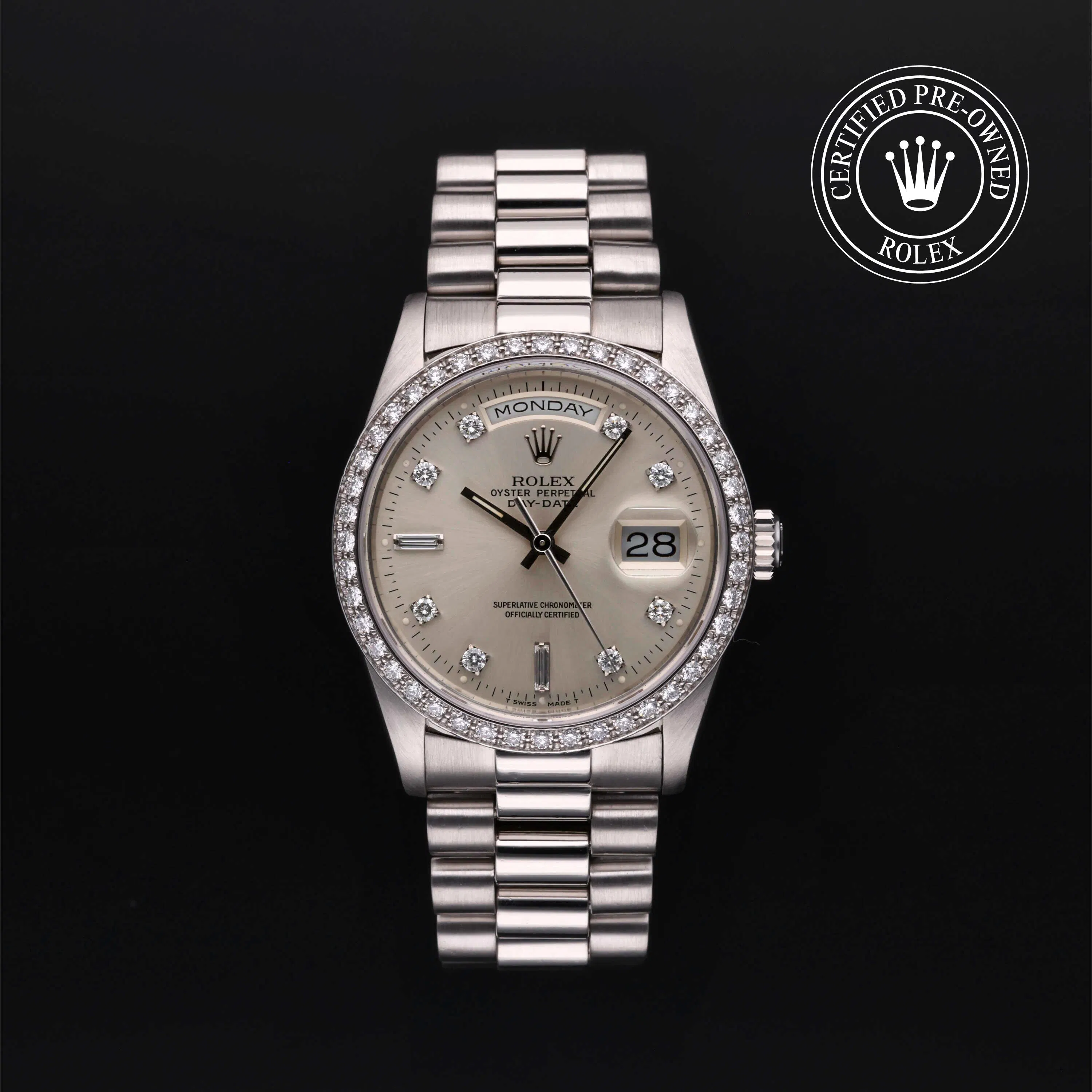 Shop our selection of Rolex Certified Pre-Owned Day-Date watches — including sought-after used Rolex President models in yellow gold, white gold, and platinum. Explore popular 36mm and 40mm Day-Date references available online and in-store. Among the many outstanding watches in the Rolex catalogue, the Day-Date is the watch that celebrates achievement. There are a few characteristics of this piece that set it apart from the rest of the line-up. First and foremost is the "day" indication at 12 o'clock.