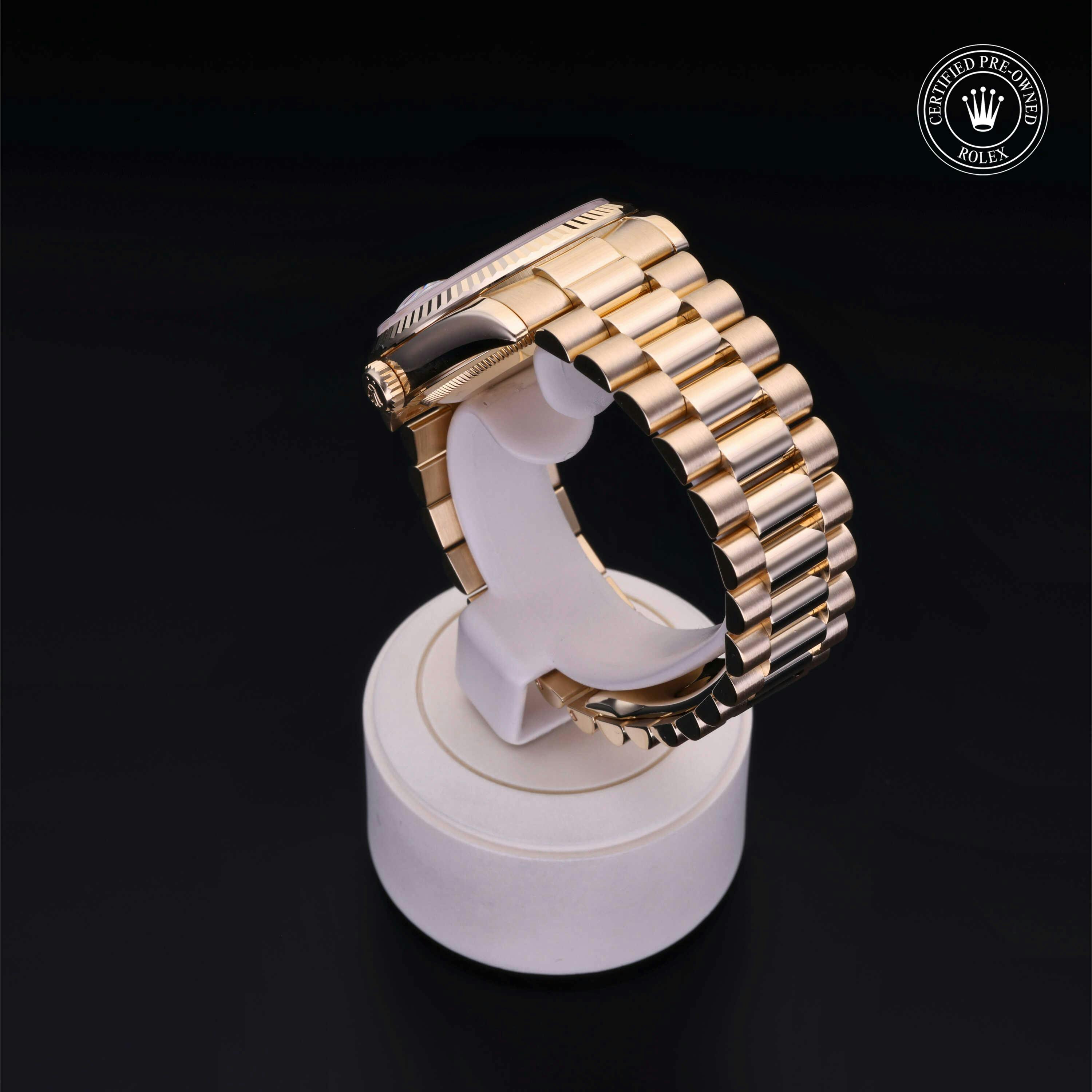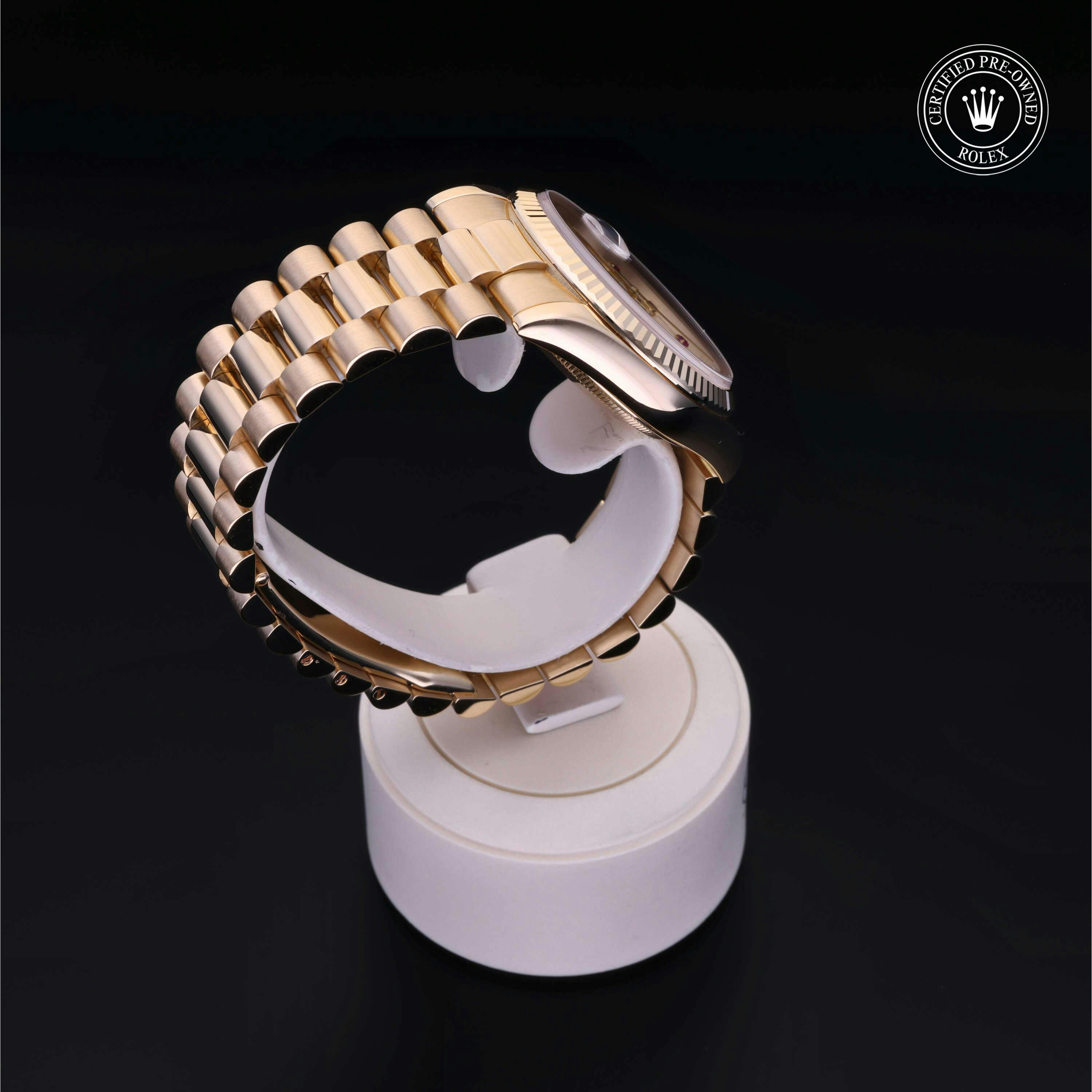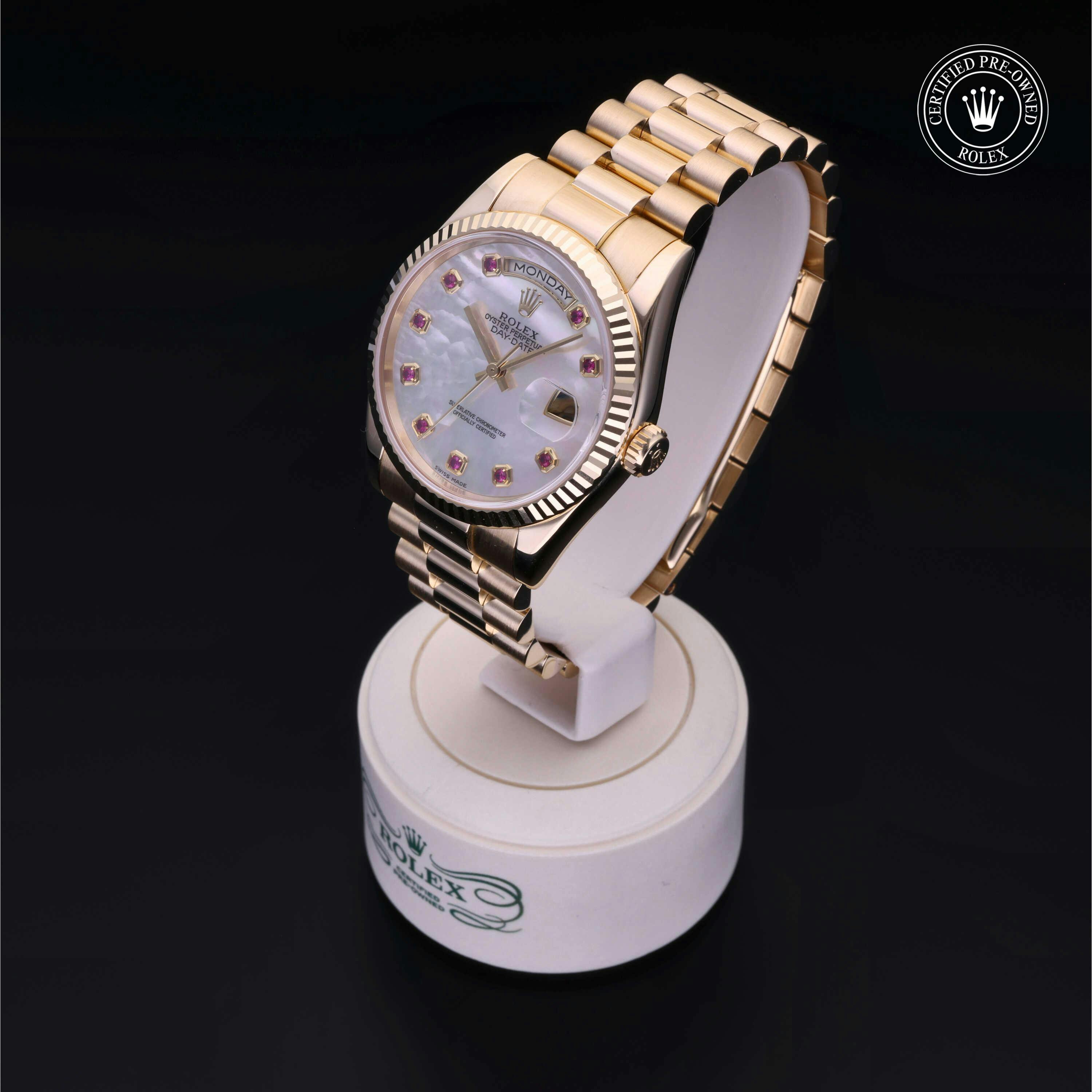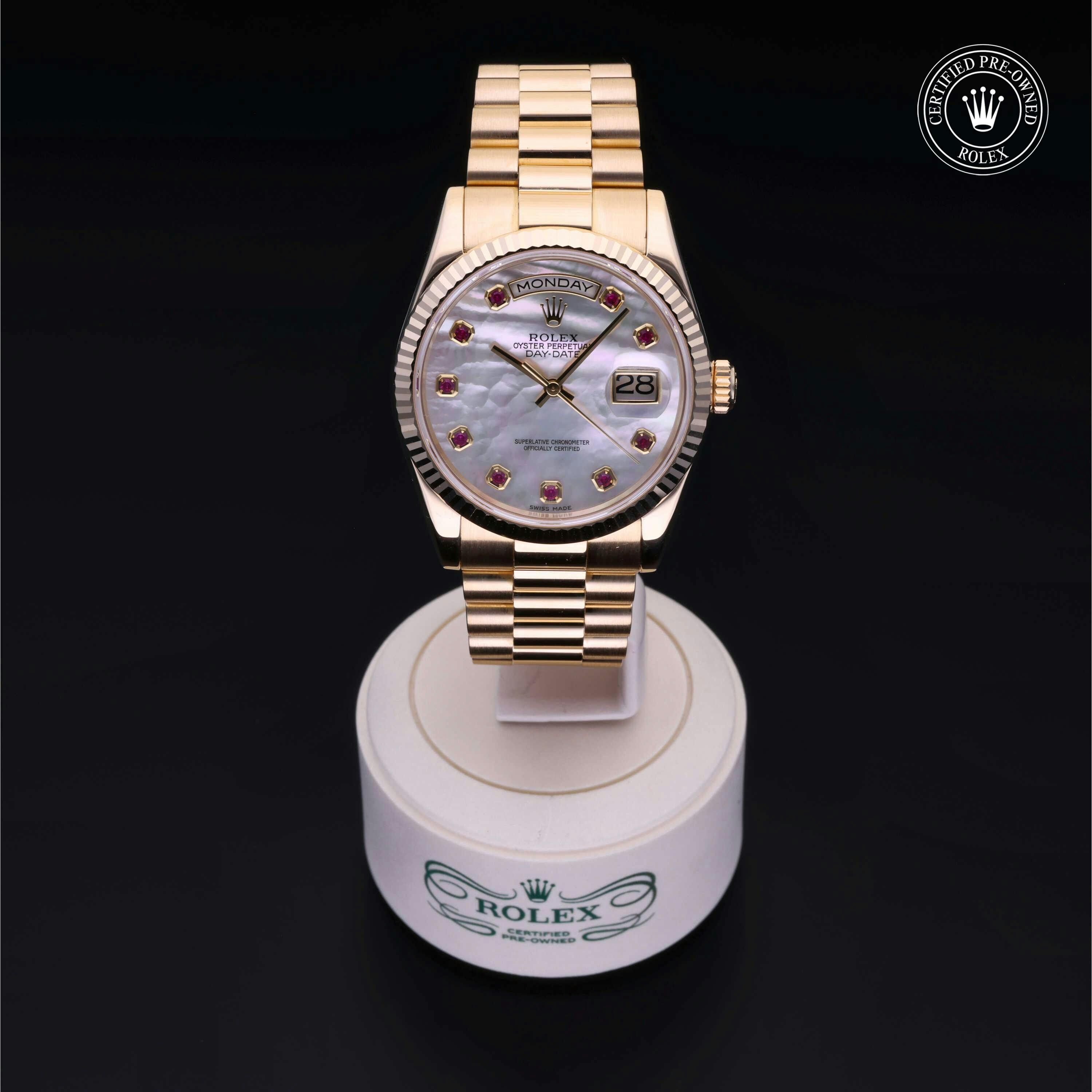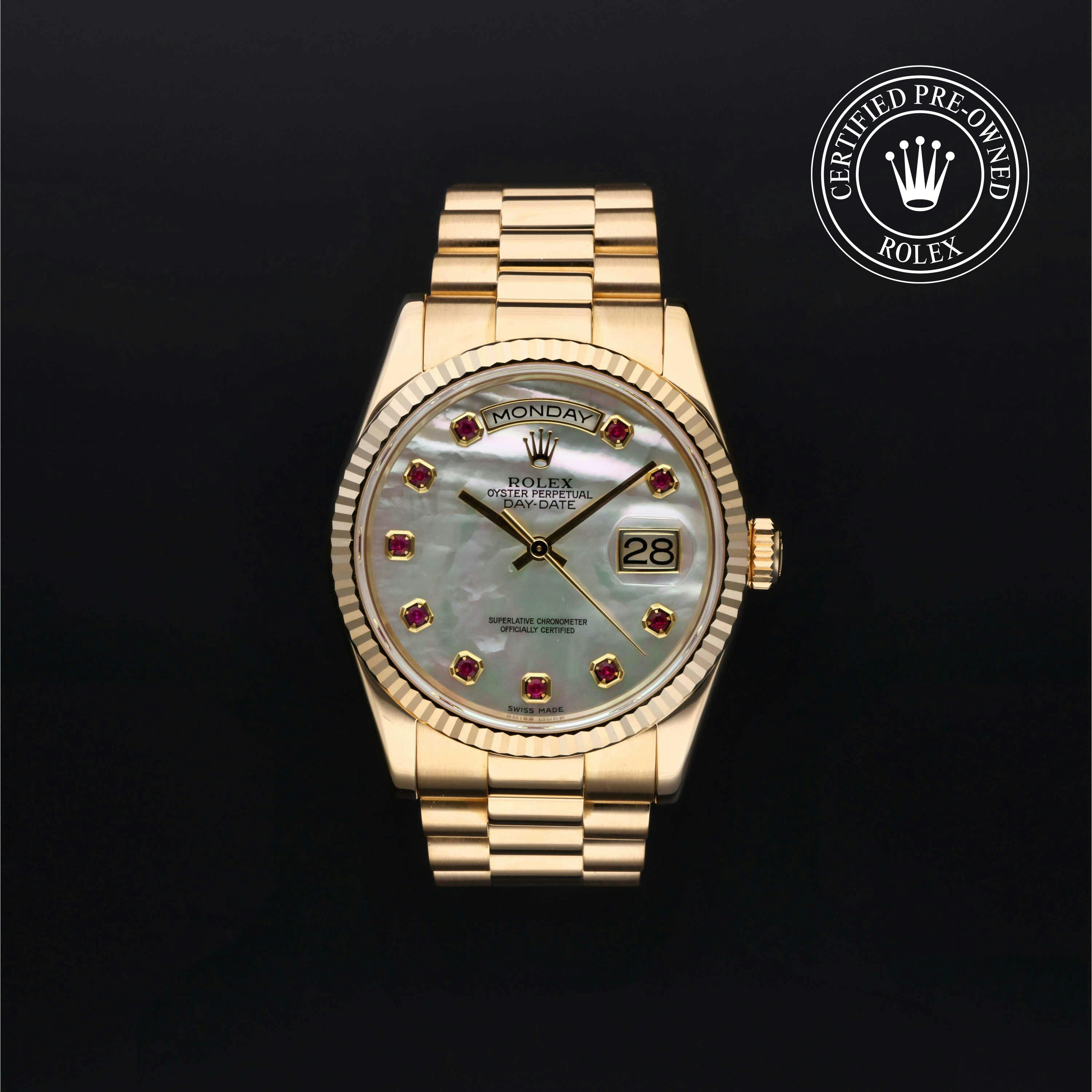 Rolex Certified Pre-Owned Day-Date (118238) self - winding automatic watch, features a 36mm 18k yellow gold case and fluted bezel surrounding a white, mother of pearl ruby set dial on an 18k yellow gold president bracelet. Functions include hours, minutes, seconds, date and day. This watch has received Rolex-authorized service and certification. It does not come with the original box or papers, but includes a custom Rolex Certified Pre-Owned hang tag, travel pouch and RCPO international warranty card.