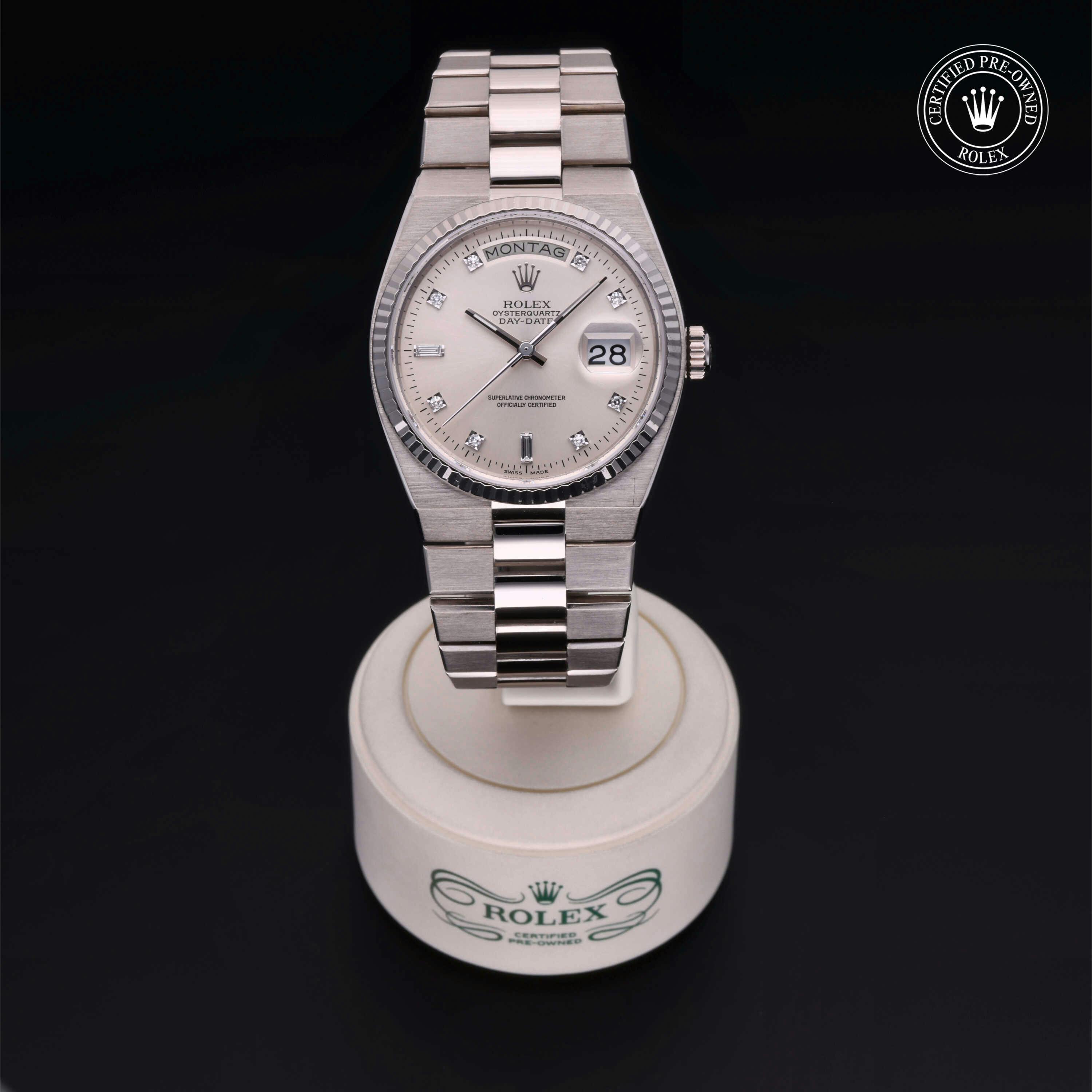 Rolex Certified Pre-Owned Day-Date Oyster Quartz (19019) watch, features a 36mm 18k white gold case and fluted bezel surrounding a silver diamond set dial on an 18k white gold oyster quartz bracelet. Functions include hours, minutes, seconds, date and day. This watch has received Rolex-authorized service and certification. It comes with the original box, and includes a custom Rolex Certified Pre-Owned hang tag, travel pouch and RCPO international warranty card.