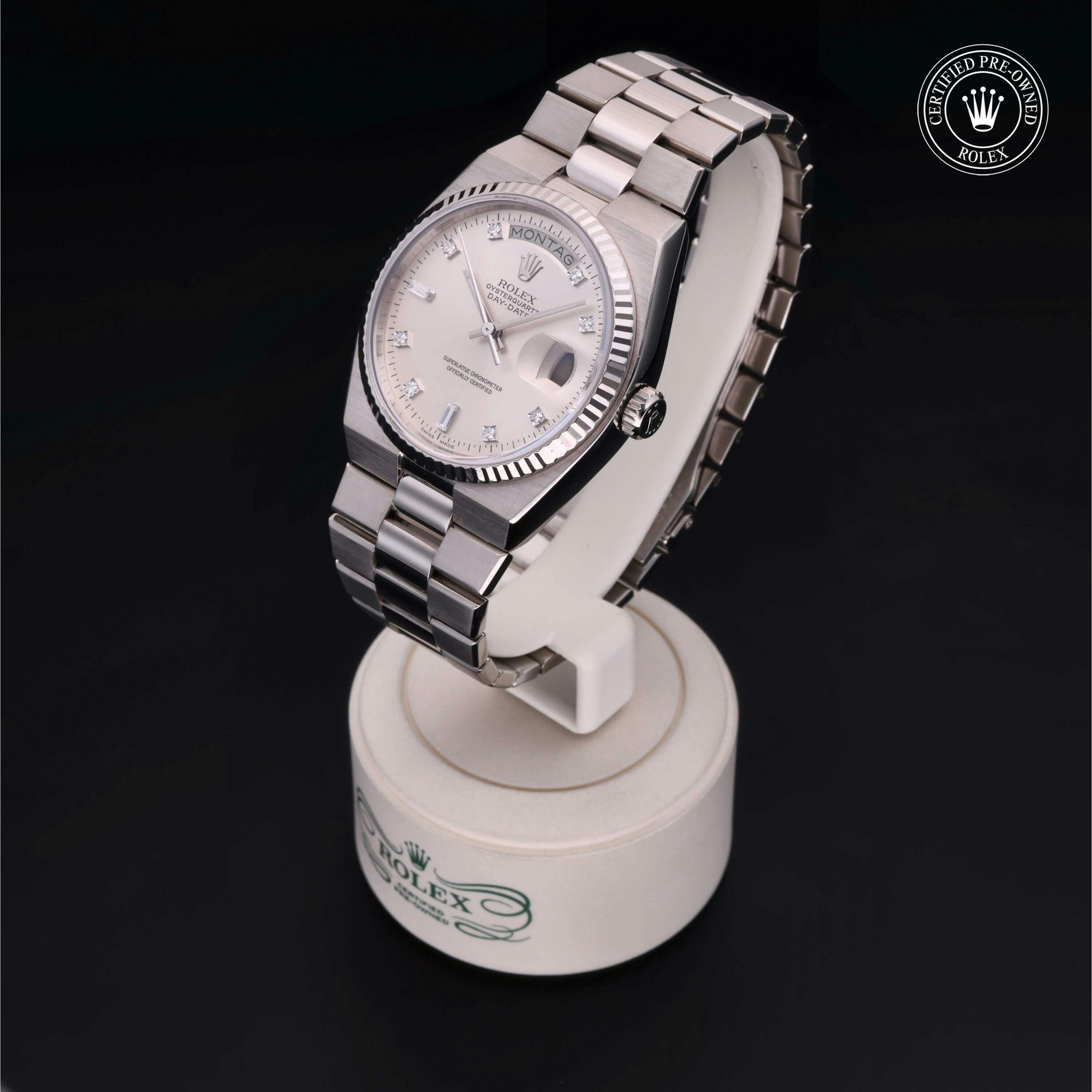 Rolex Certified Pre-Owned Day-Date Oyster Quartz (19019) watch, features a 36mm 18k white gold case and fluted bezel surrounding a silver diamond set dial on an 18k white gold oyster quartz bracelet. Functions include hours, minutes, seconds, date and day. This watch has received Rolex-authorized service and certification. It comes with the original box, and includes a custom Rolex Certified Pre-Owned hang tag, travel pouch and RCPO international warranty card.