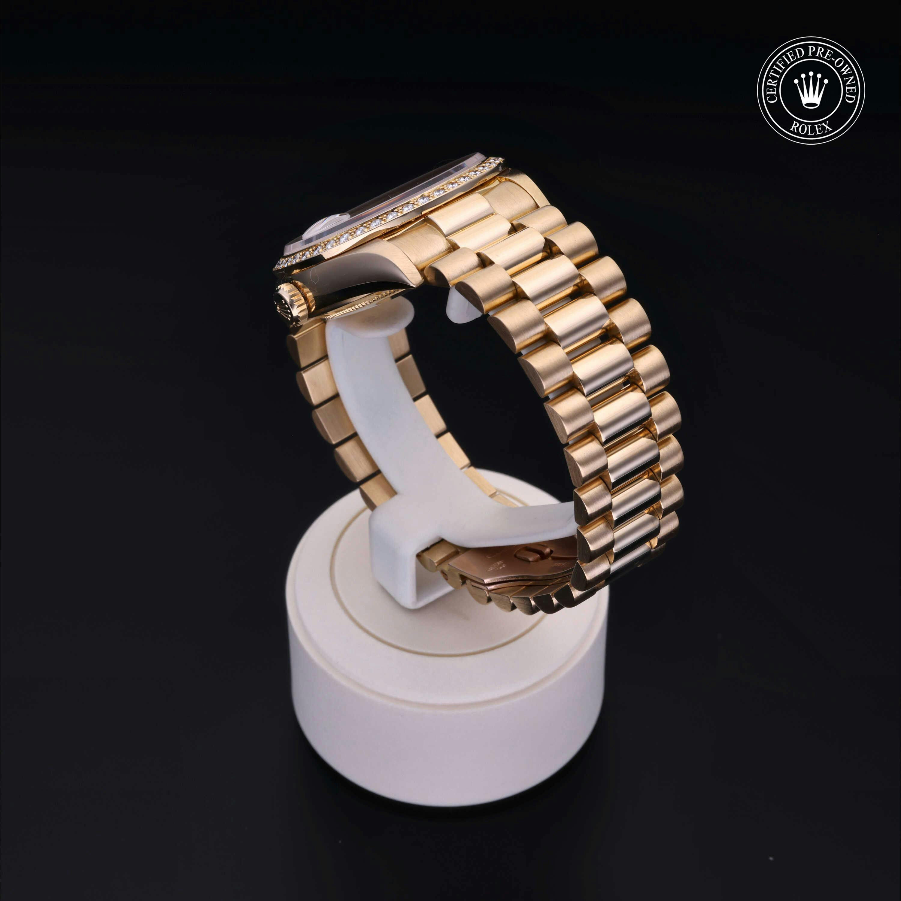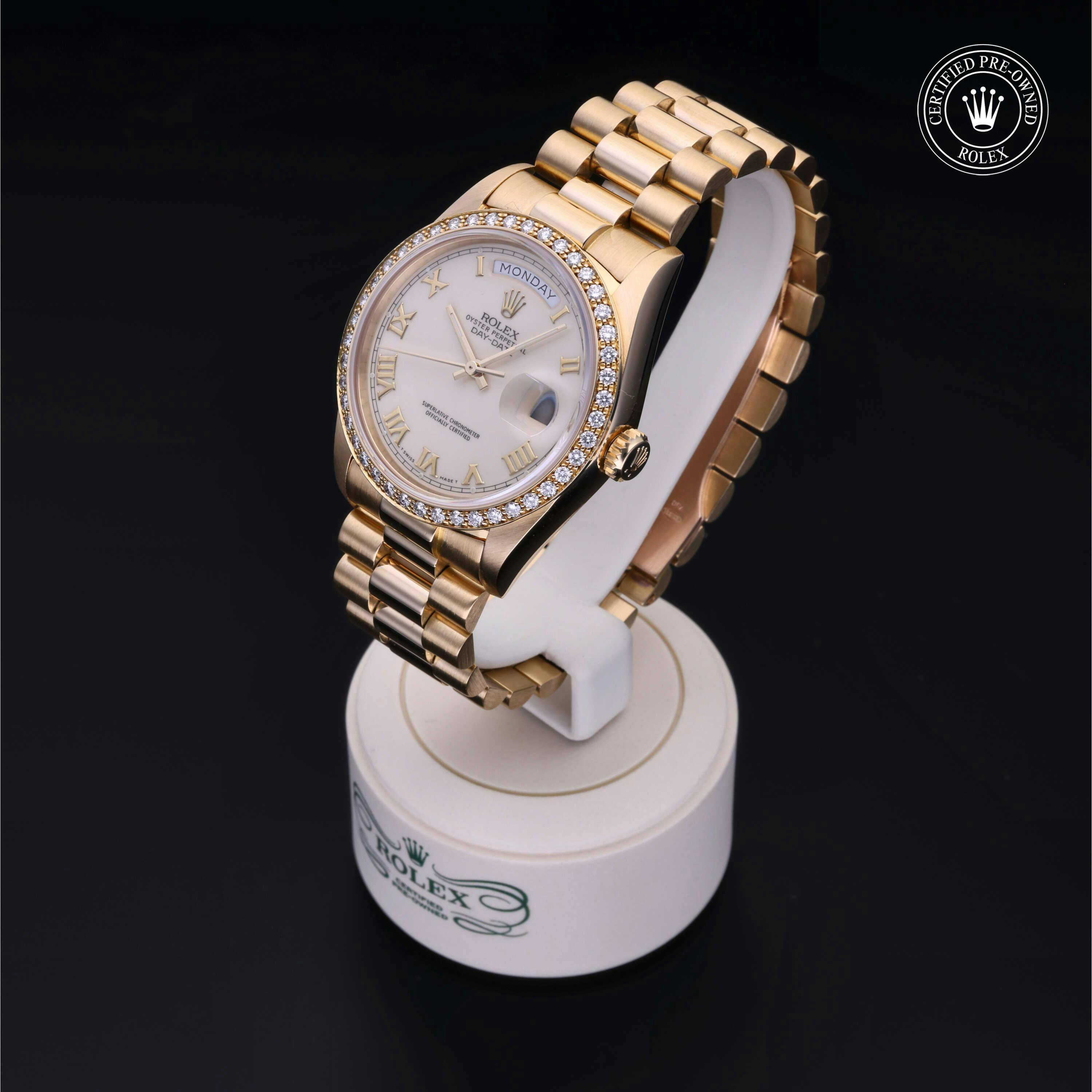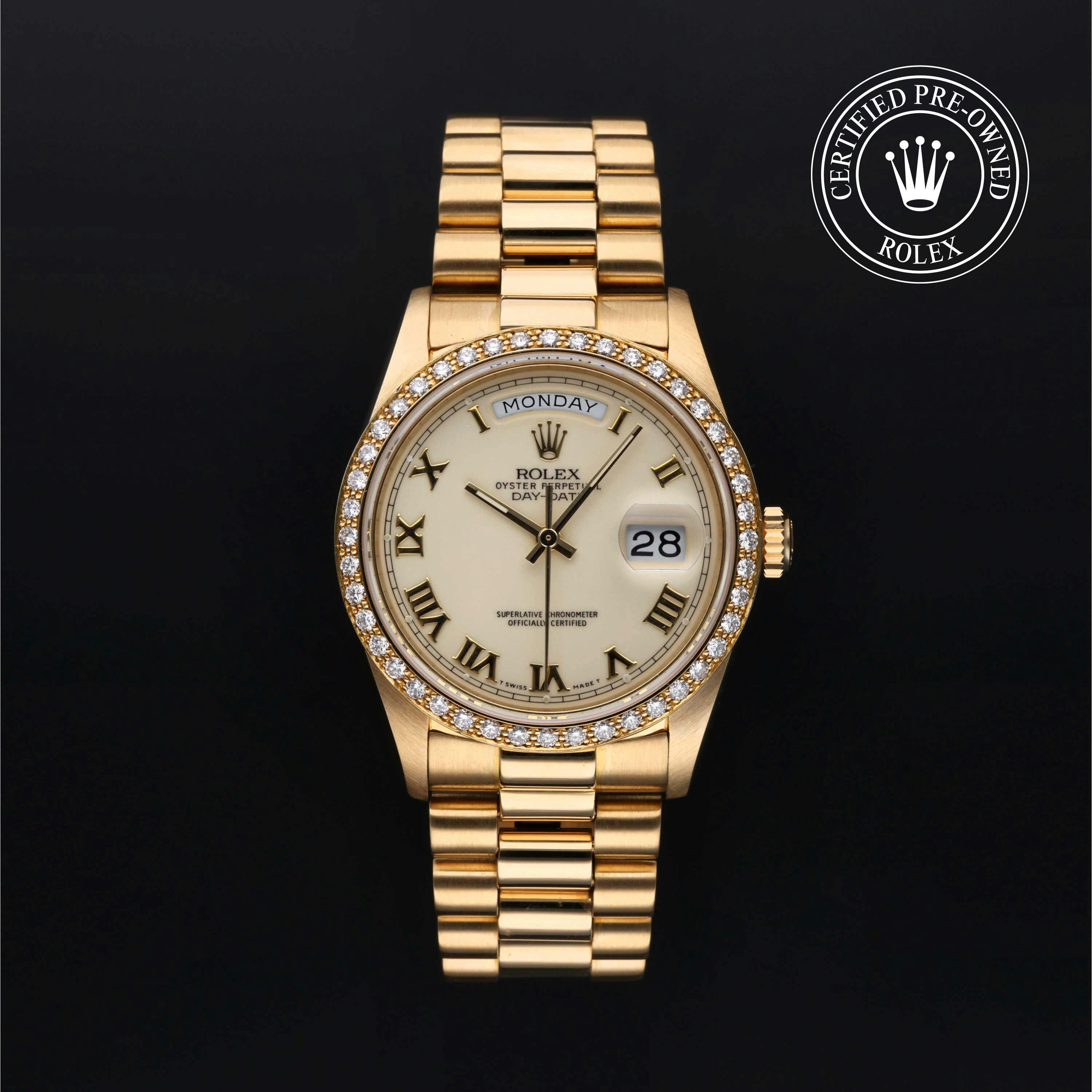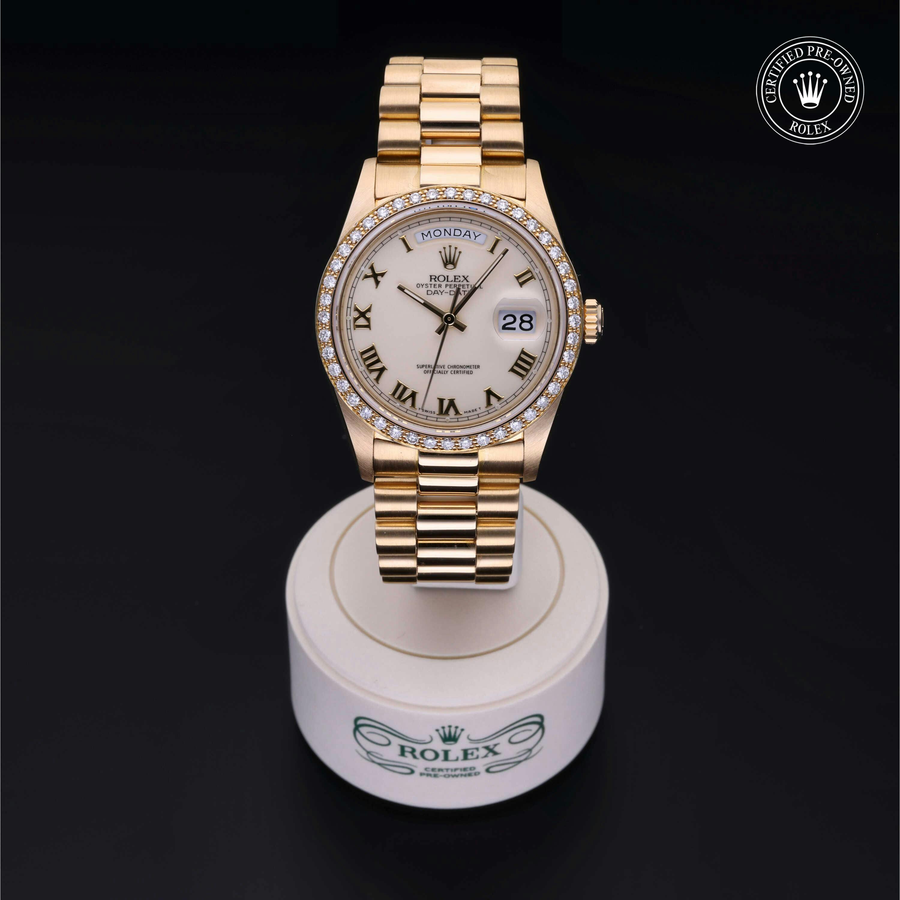 Rolex Certified Pre-Owned Day-Date (18048) self - winding automatic watch, features a 36mm 18k yellow gold case with a diamond set bezel surrounding a white dial on an 18k yellow gold president bracelet. Functions include hours, minutes, seconds, date and day. This watch has received Rolex-authorized service and certification. It does not come with the original box or papers, but includes a custom Rolex Certified Pre-Owned hang tag, travel pouch and RCPO international warranty card.
