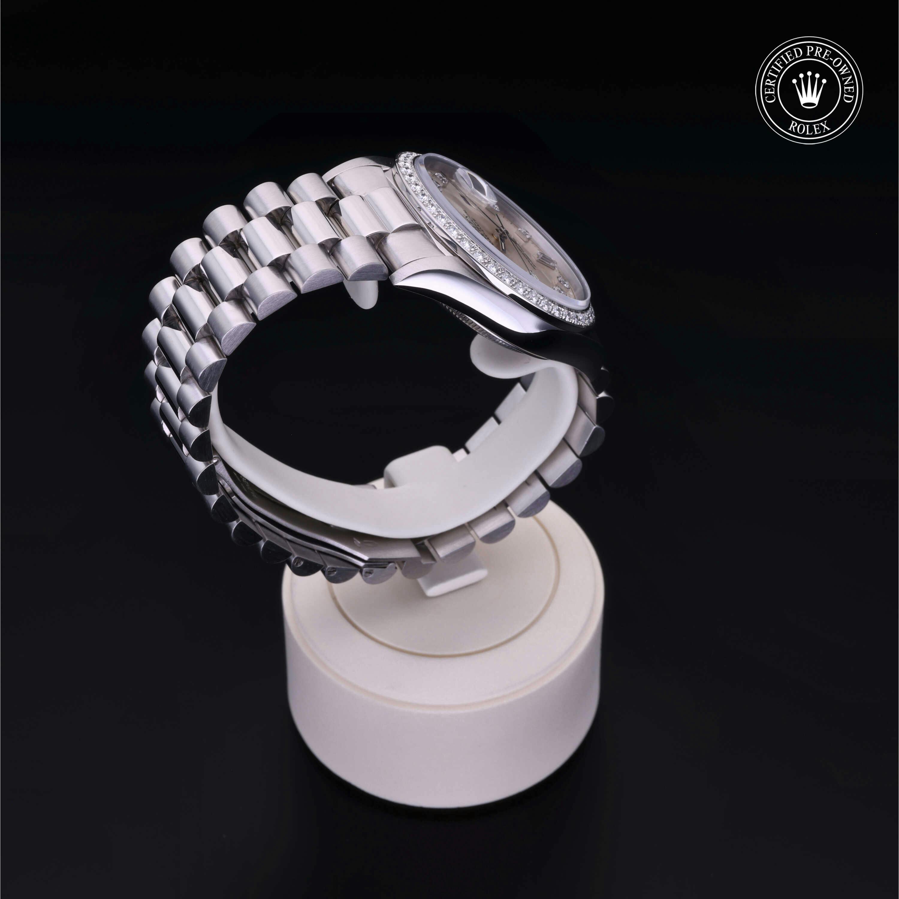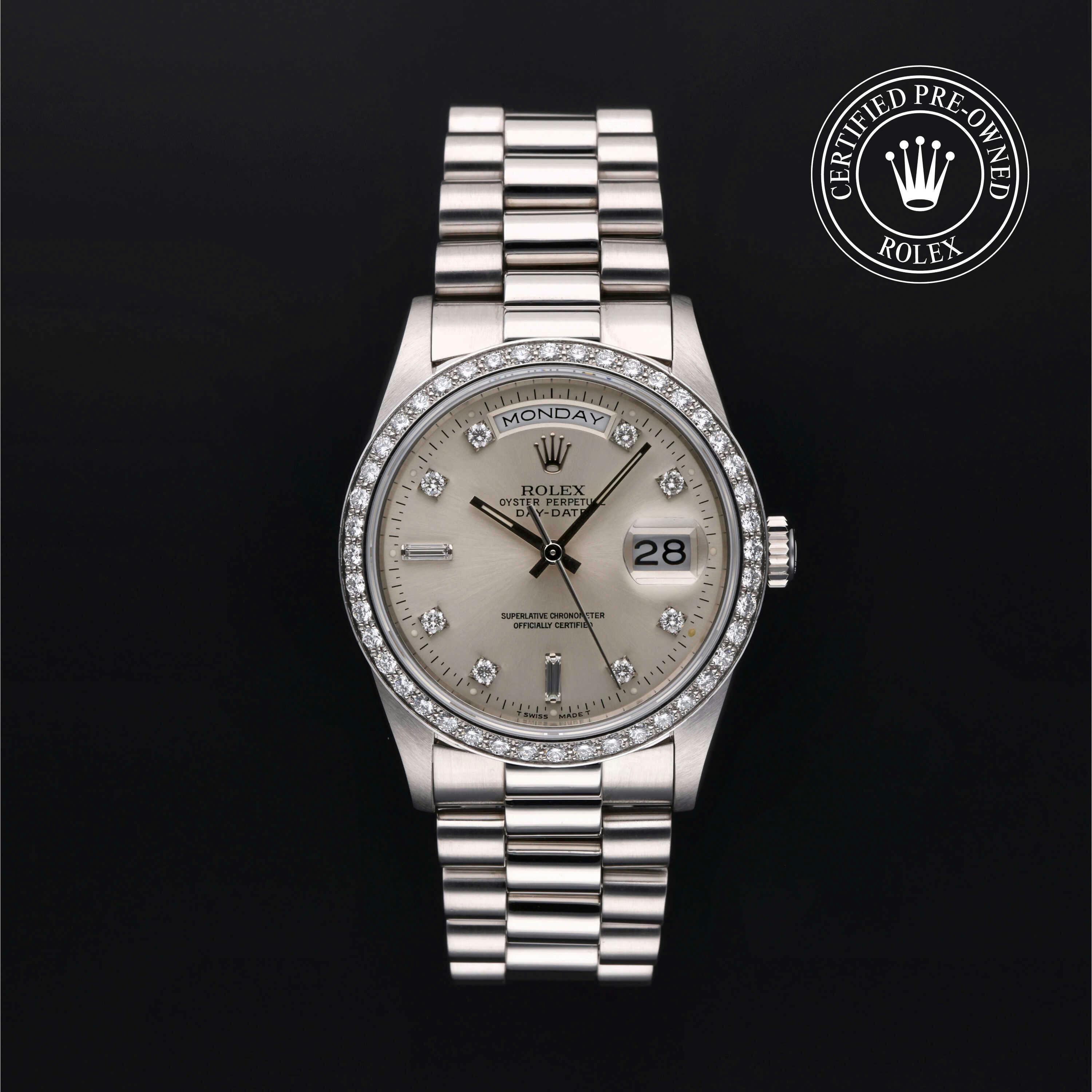 Rolex Certified Pre-Owned Day-Date (18346) self - winding automatic watch, features a 36mm platinum case with a diamond set bezel surrounding a silver diamond set dial on a platinum president bracelet. Functions include hours, minutes, seconds, date and day. This watch has received Rolex-authorized service and certification. It comes with the original papers, and includes a custom Rolex Certified Pre-Owned hang tag, travel pouch and RCPO international warranty card.