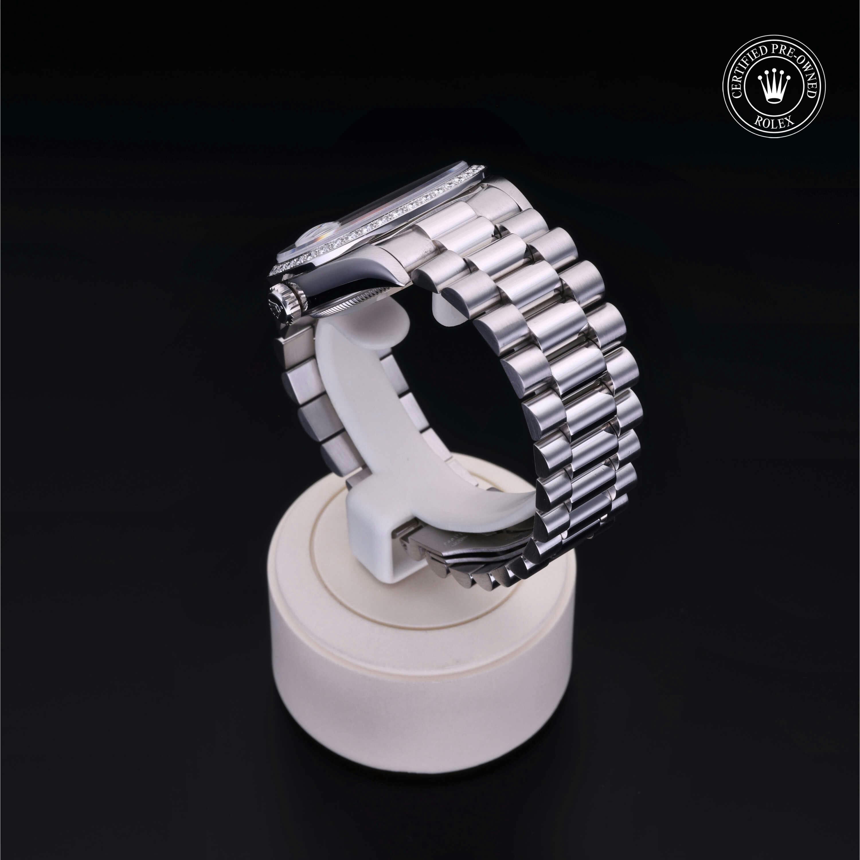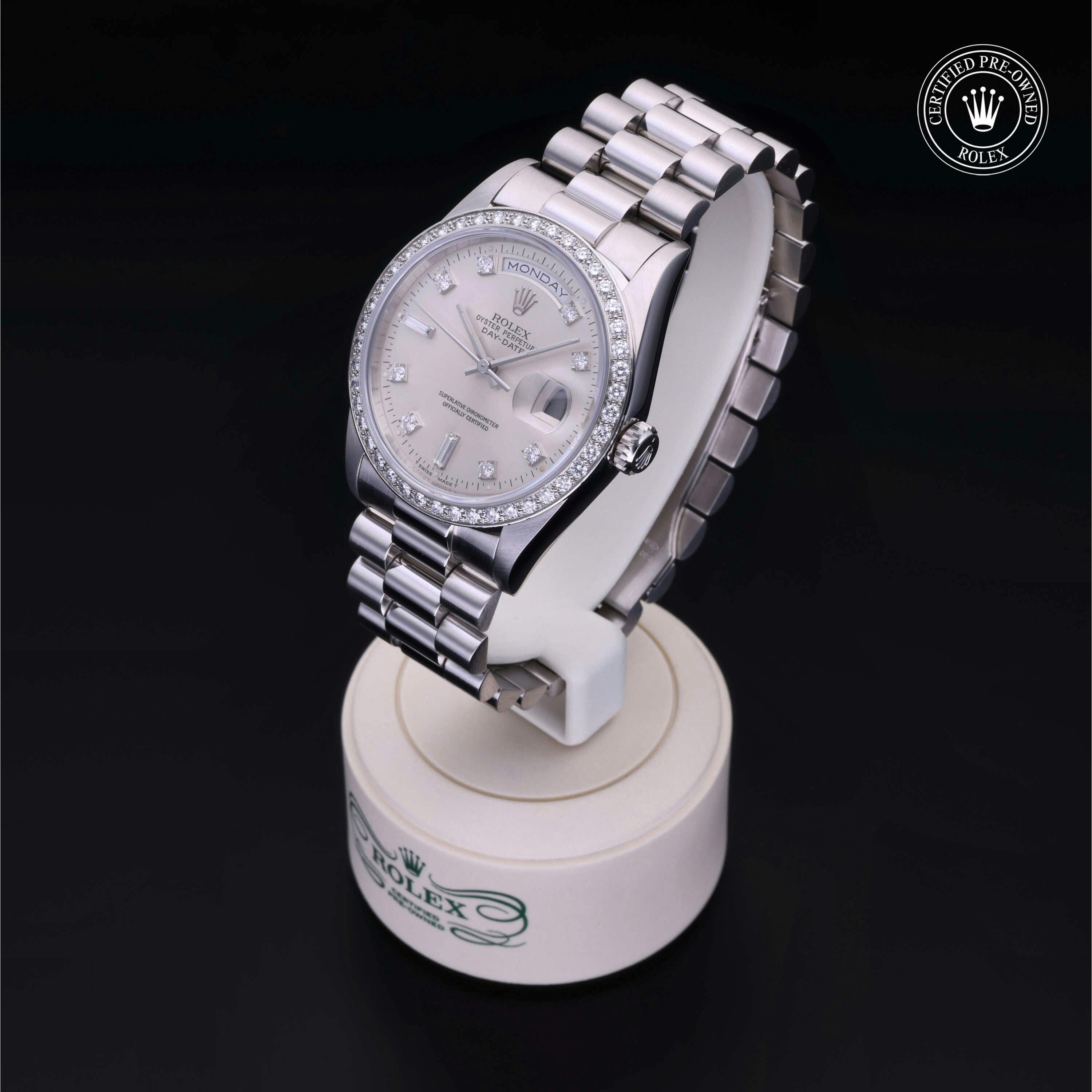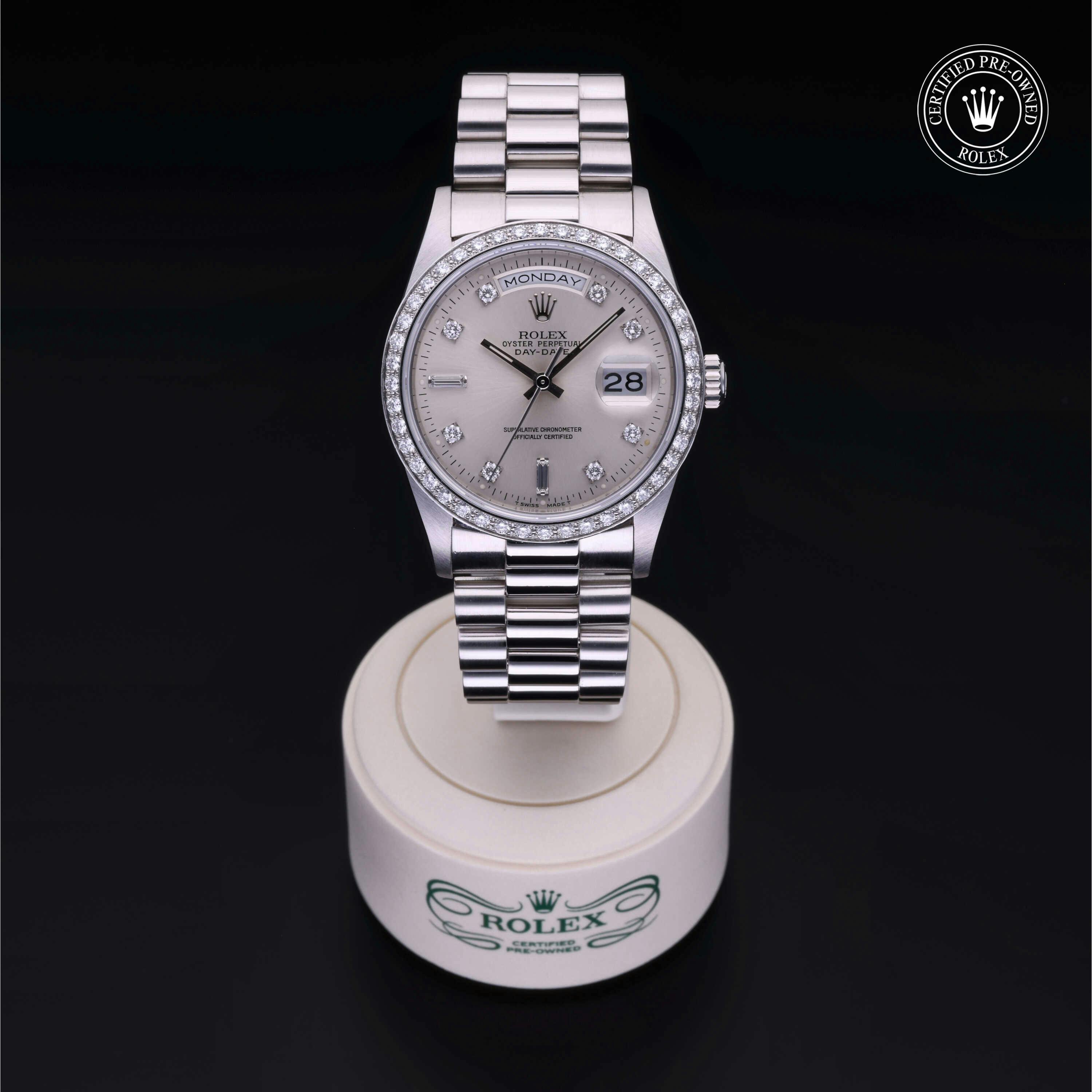 Rolex Certified Pre-Owned Day-Date (18346) self - winding automatic watch, features a 36mm platinum case with a diamond set bezel surrounding a silver diamond set dial on a platinum president bracelet. Functions include hours, minutes, seconds, date and day. This watch has received Rolex-authorized service and certification. It comes with the original papers, and includes a custom Rolex Certified Pre-Owned hang tag, travel pouch and RCPO international warranty card.