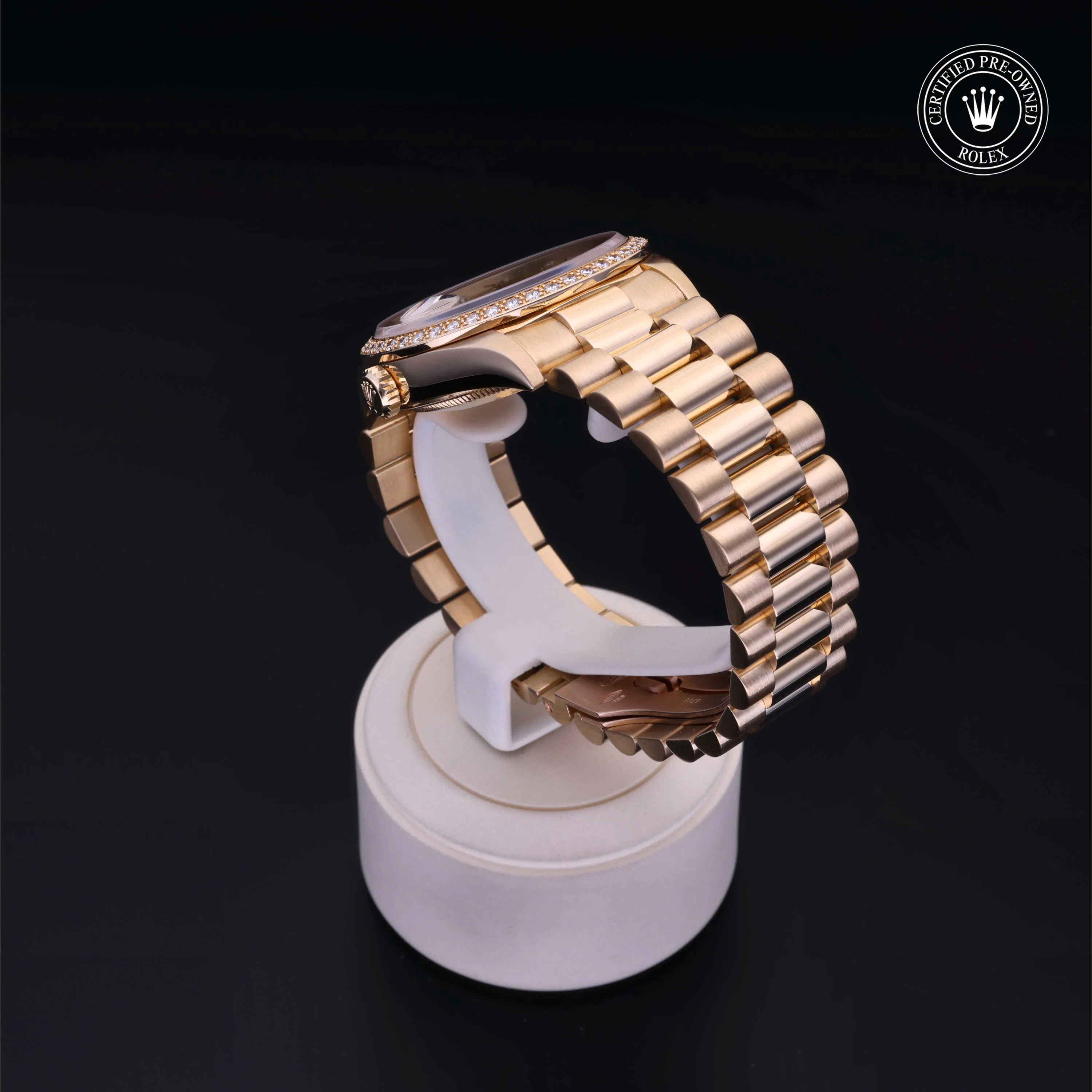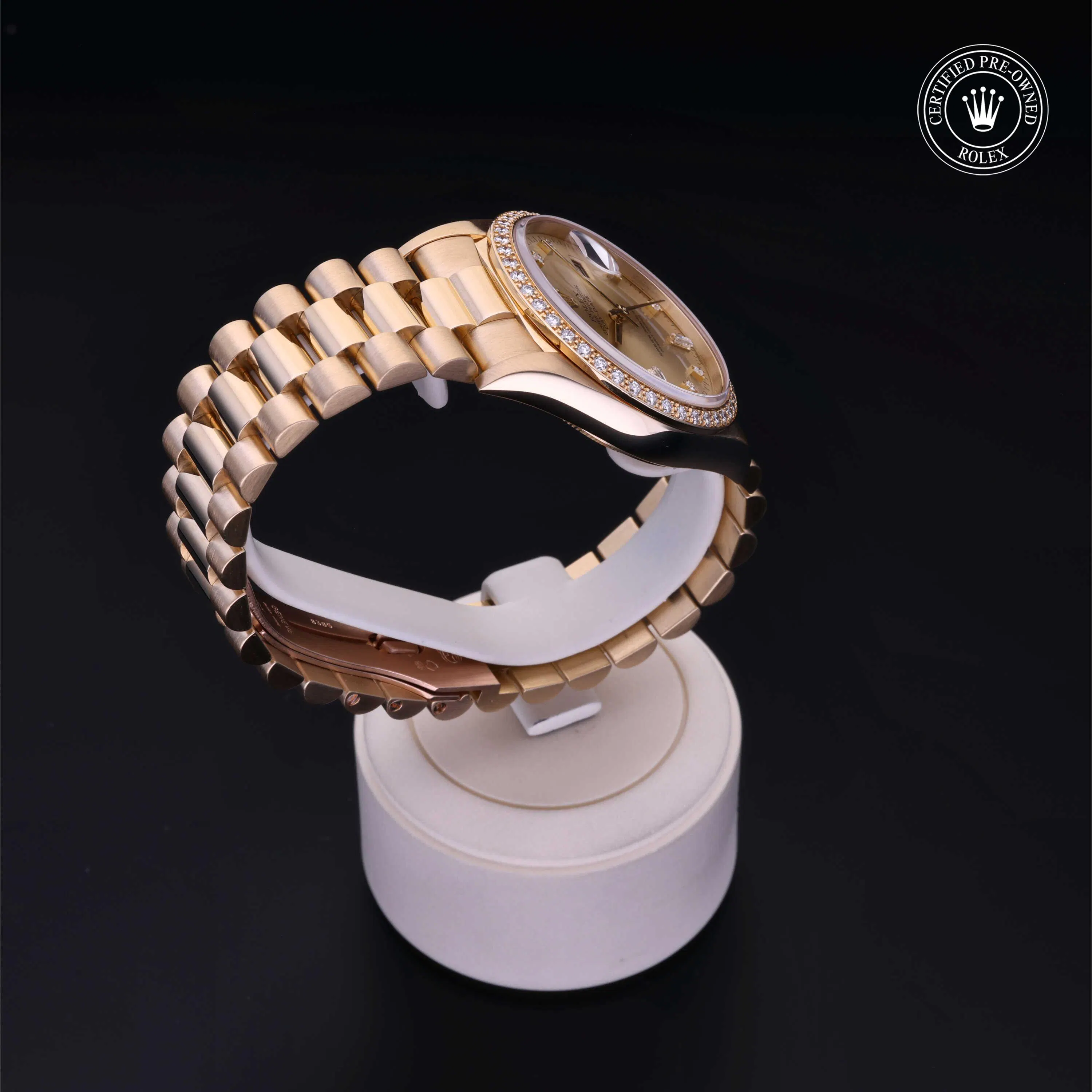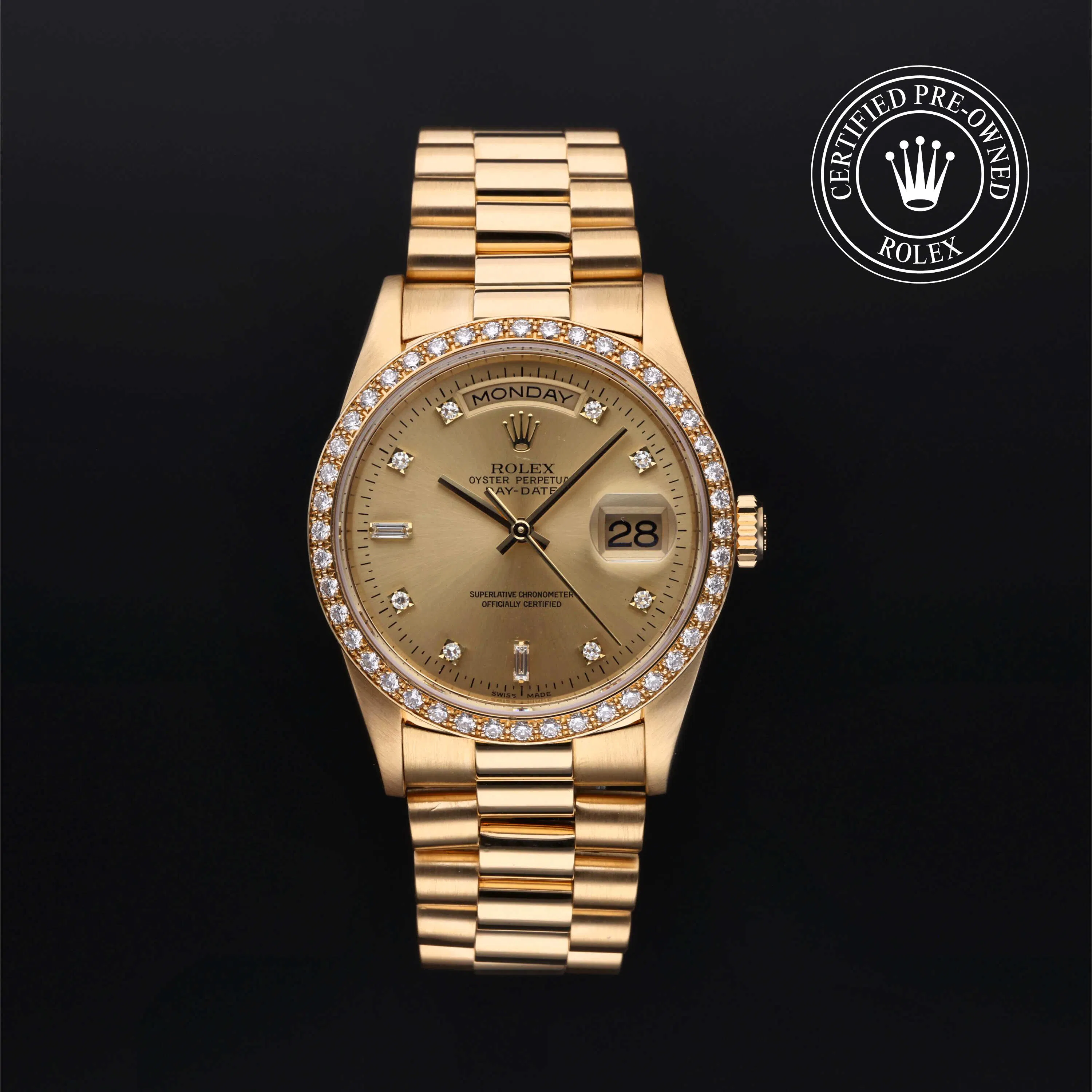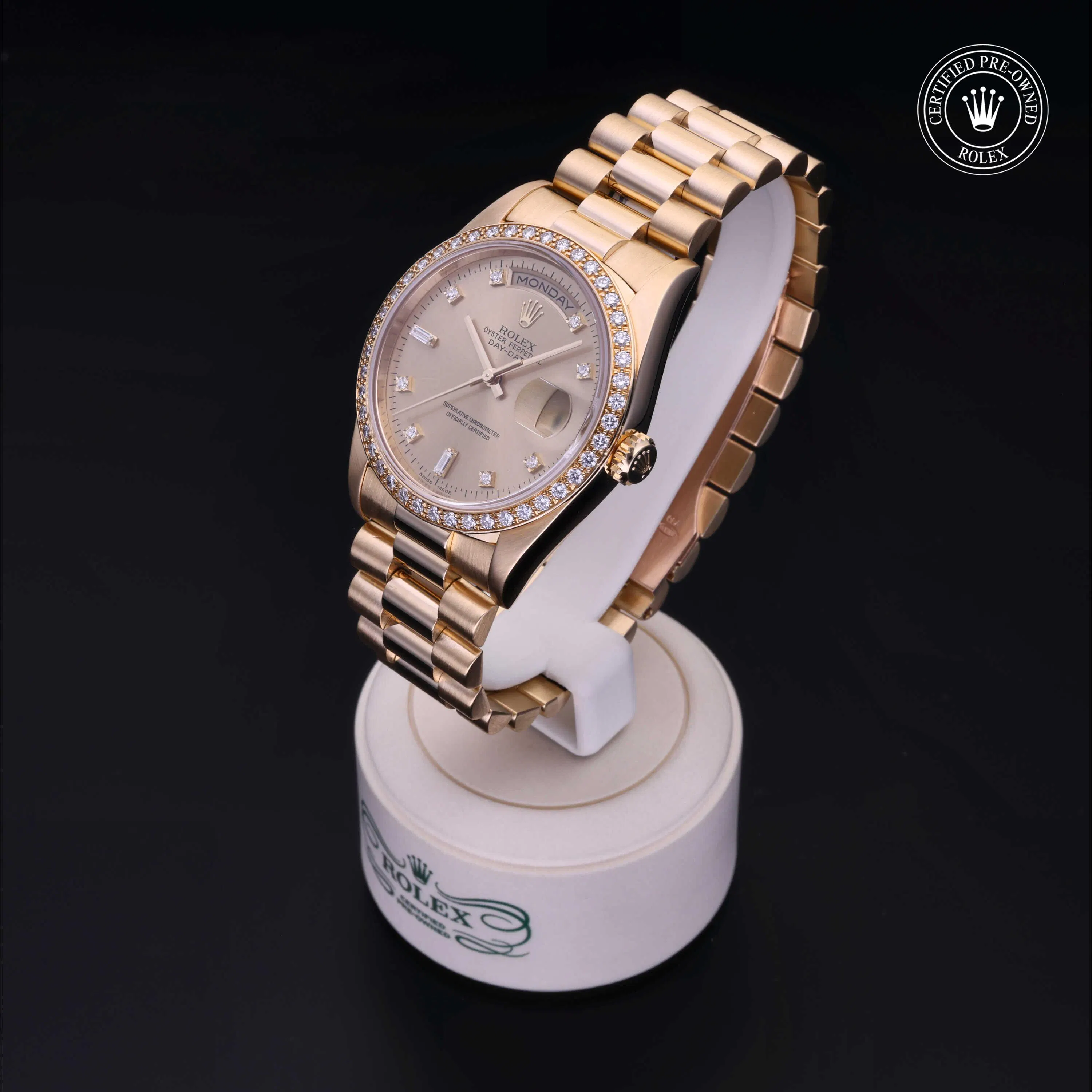 Rolex Certified Pre-Owned Day-Date (18348) self - winding automatic watch, features a 36mm 18k yellow gold case with a diamond set bezel surrounding a champagne diamond set dial on an 18k yellow gold President bracelet. Functions include hours, minutes, seconds, date and day. This watch has received Rolex-authorized service and certification. It comes with the original box, and includes a custom Rolex Certified Pre-Owned hang tag, travel pouch and RCPO international warranty card.