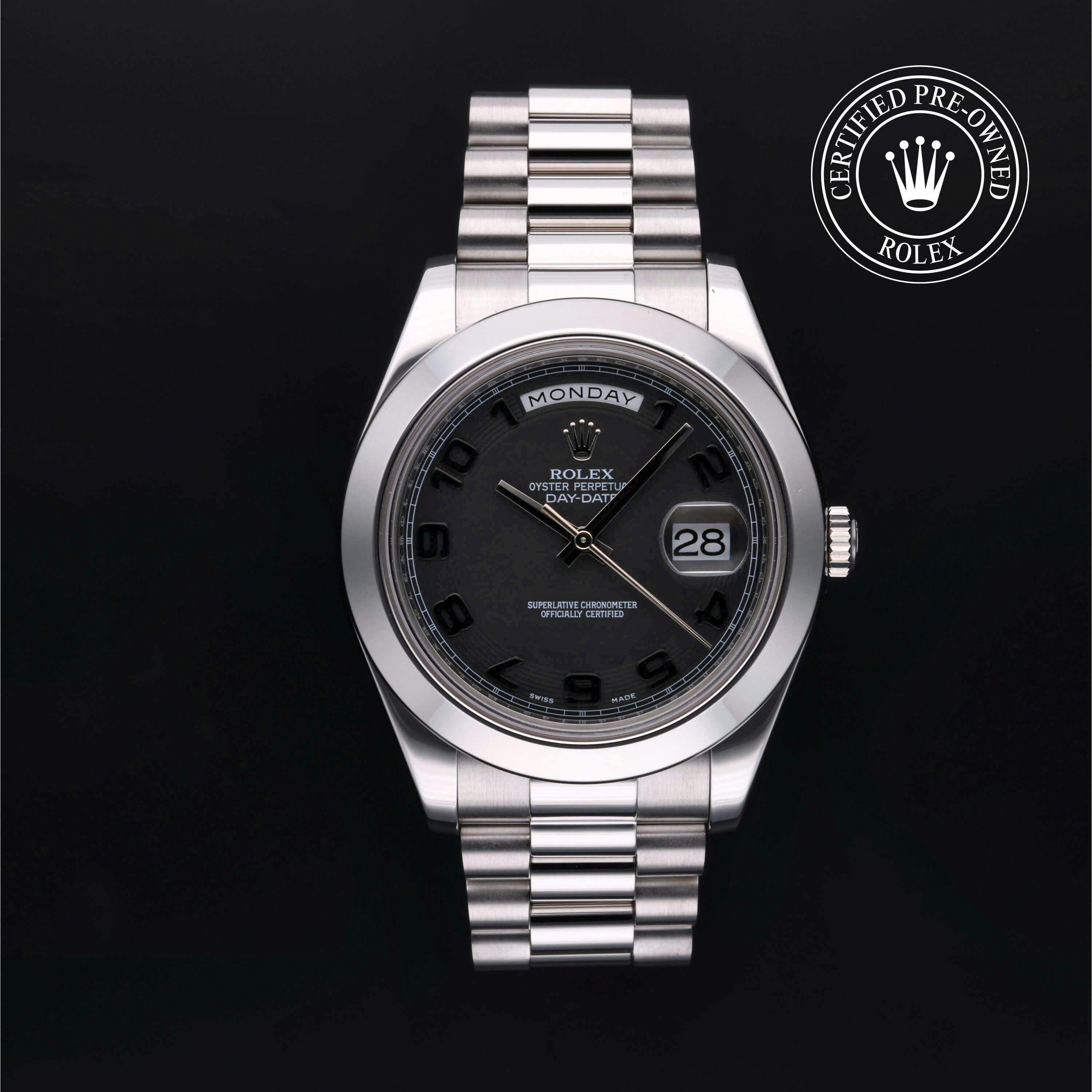 Rolex Certified Pre-Owned Day-Date II (218206) self - winding automatic watch, features a 41mm platinum case and smooth bezel surrounding a black concentric dial on a platinum president bracelet. Functions include hours, minutes, seconds, date and day. This watch has received Rolex-authorized service and certification. It comes with the original papers, and includes a custom Rolex Certified Pre-Owned hang tag, travel pouch and RCPO international warranty card.
