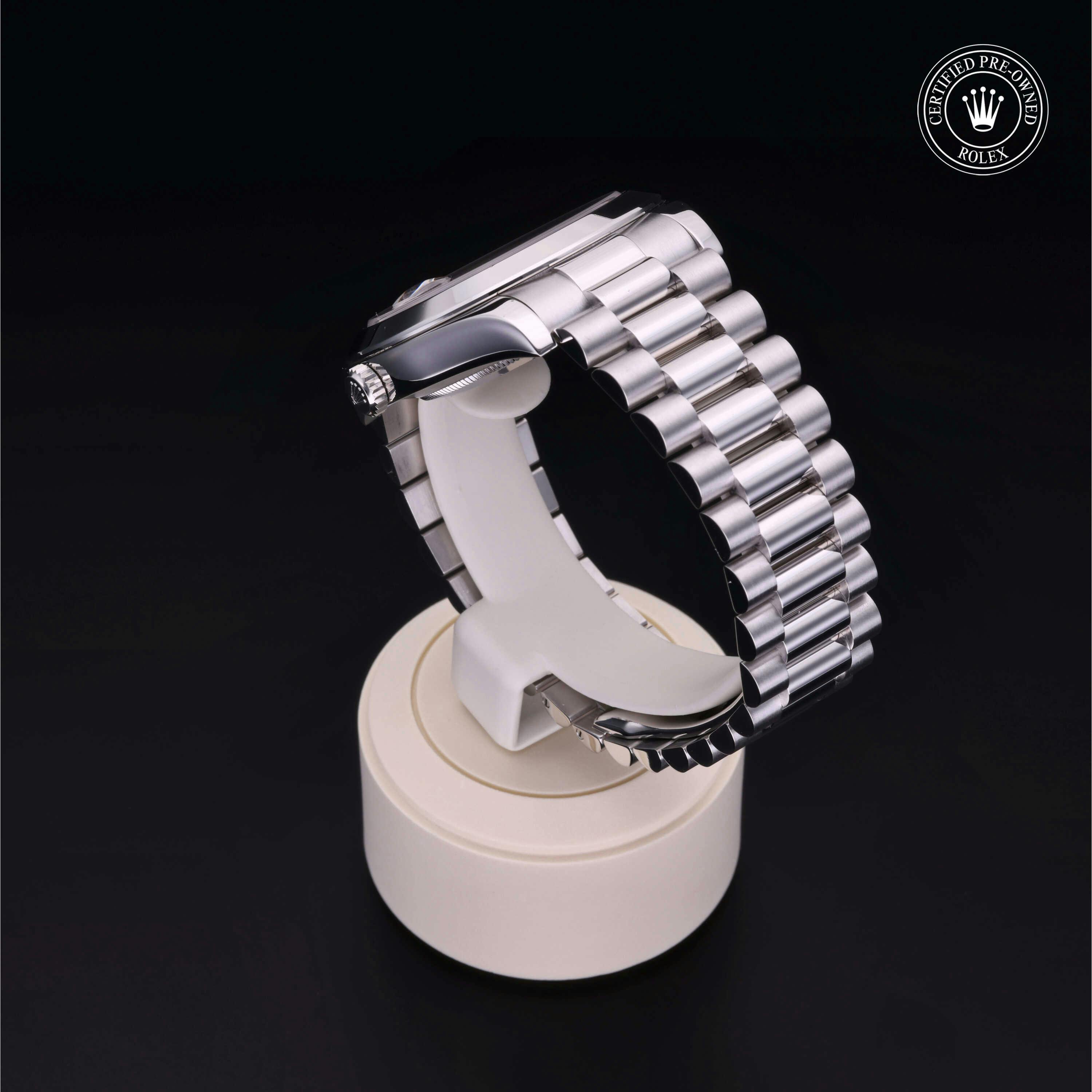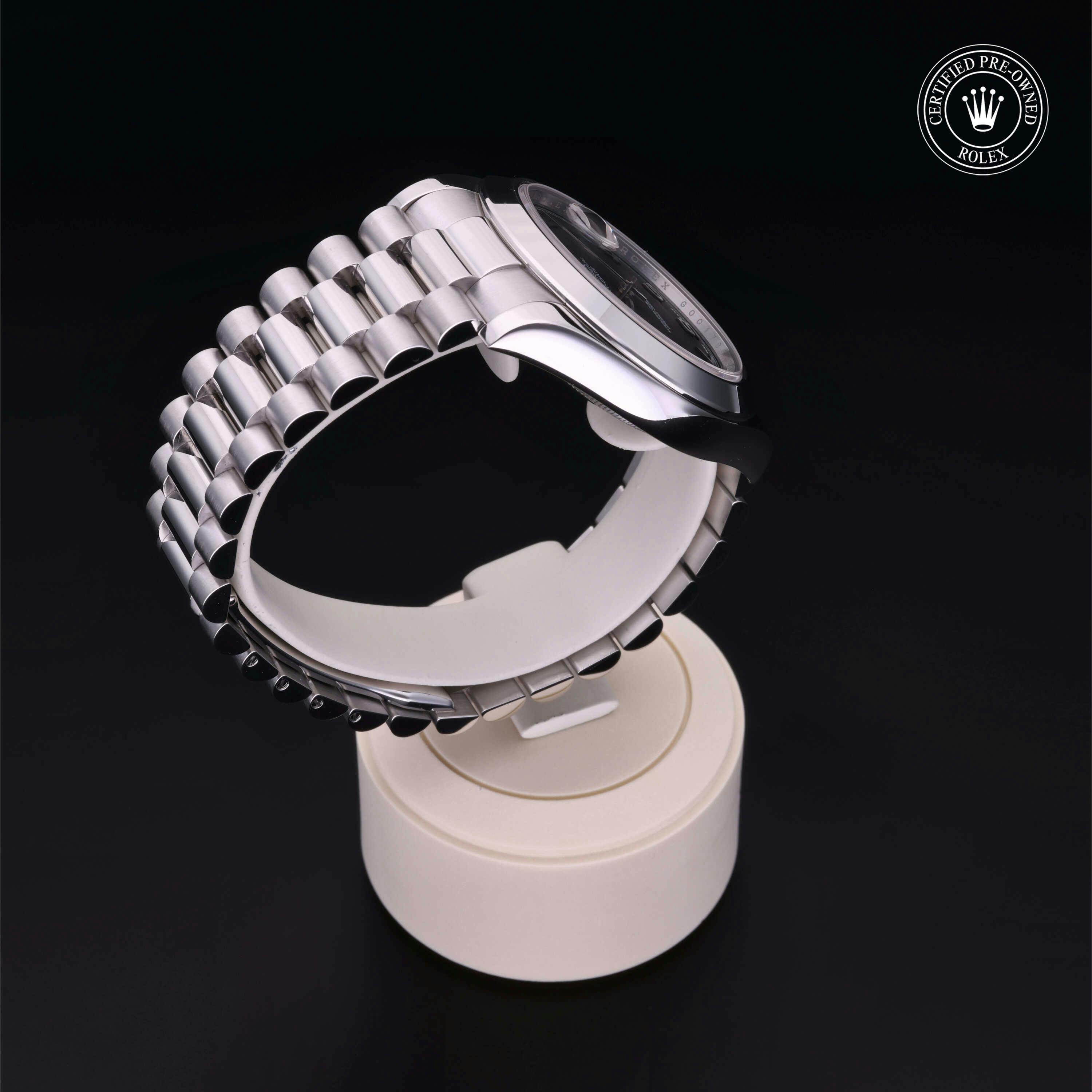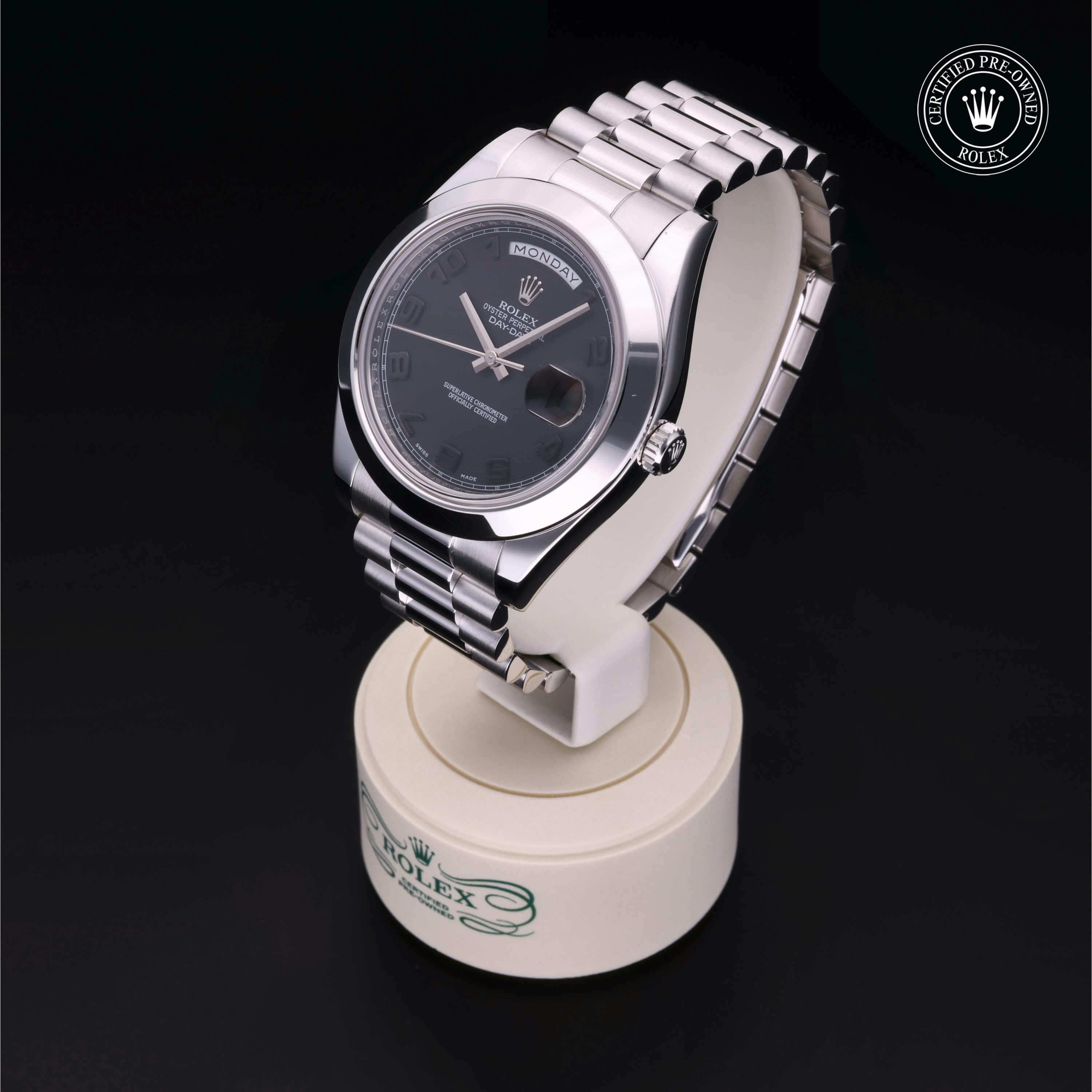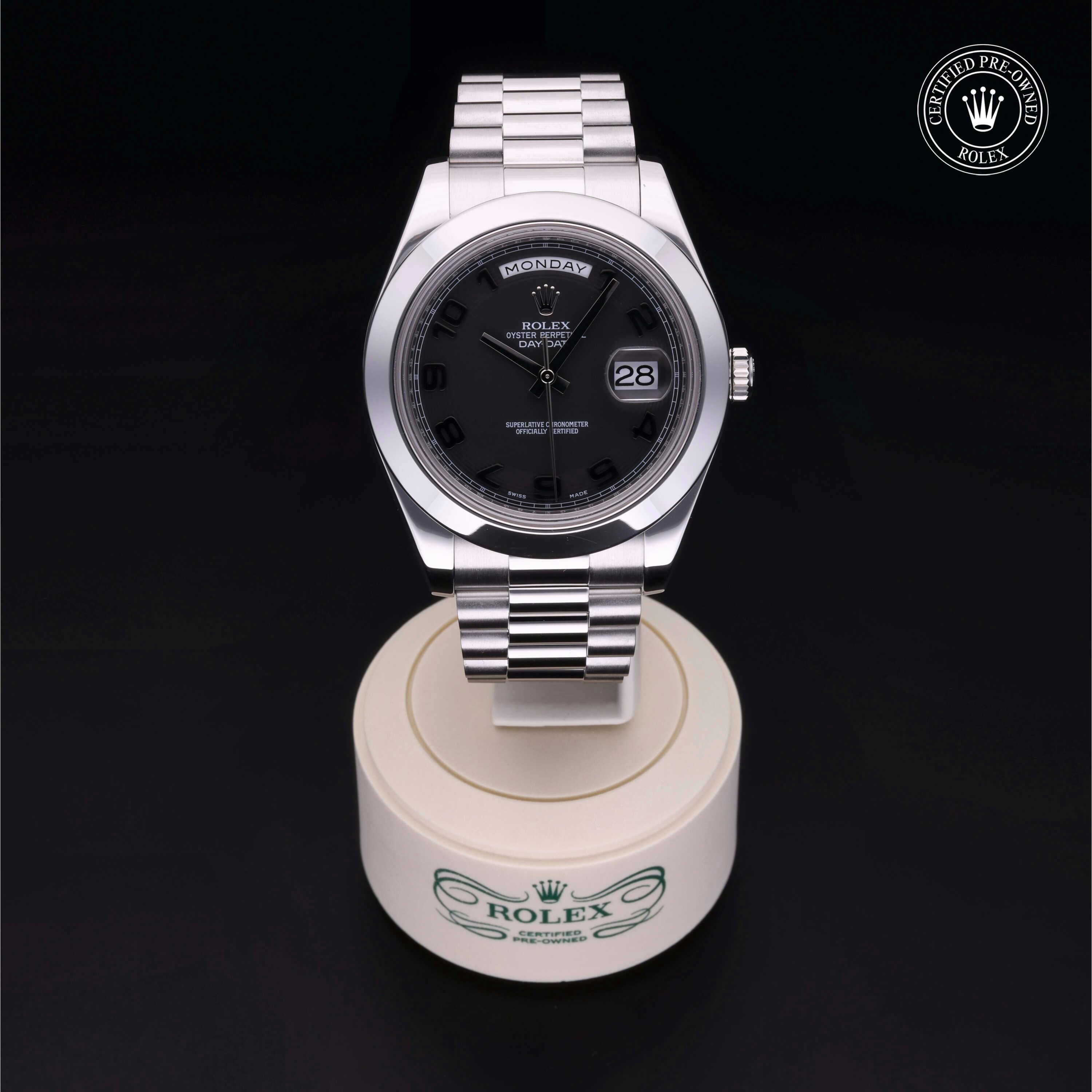 Rolex Certified Pre-Owned Day-Date II (218206) self - winding automatic watch, features a 41mm platinum case and smooth bezel surrounding a black concentric dial on a platinum president bracelet. Functions include hours, minutes, seconds, date and day. This watch has received Rolex-authorized service and certification. It comes with the original papers, and includes a custom Rolex Certified Pre-Owned hang tag, travel pouch and RCPO international warranty card.
