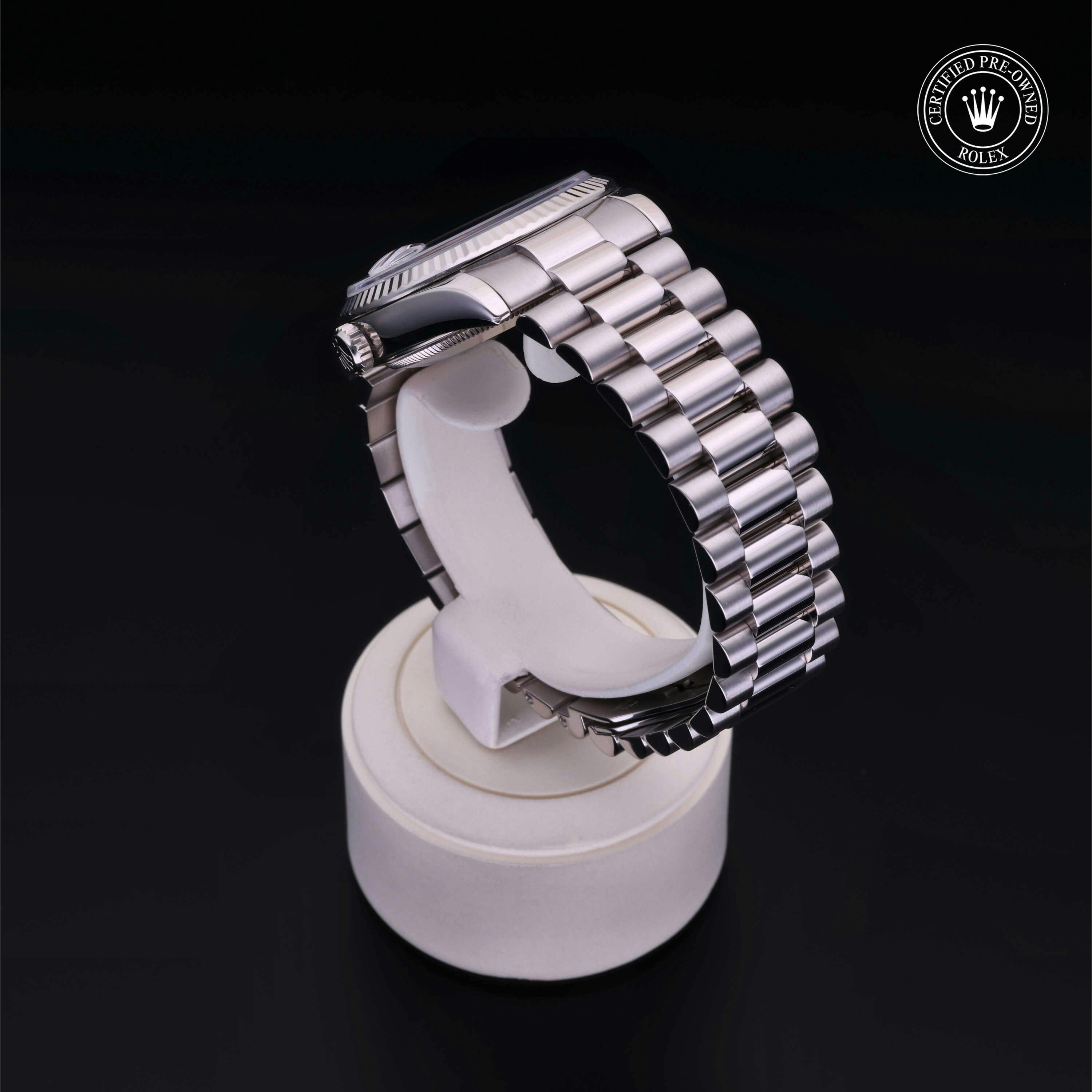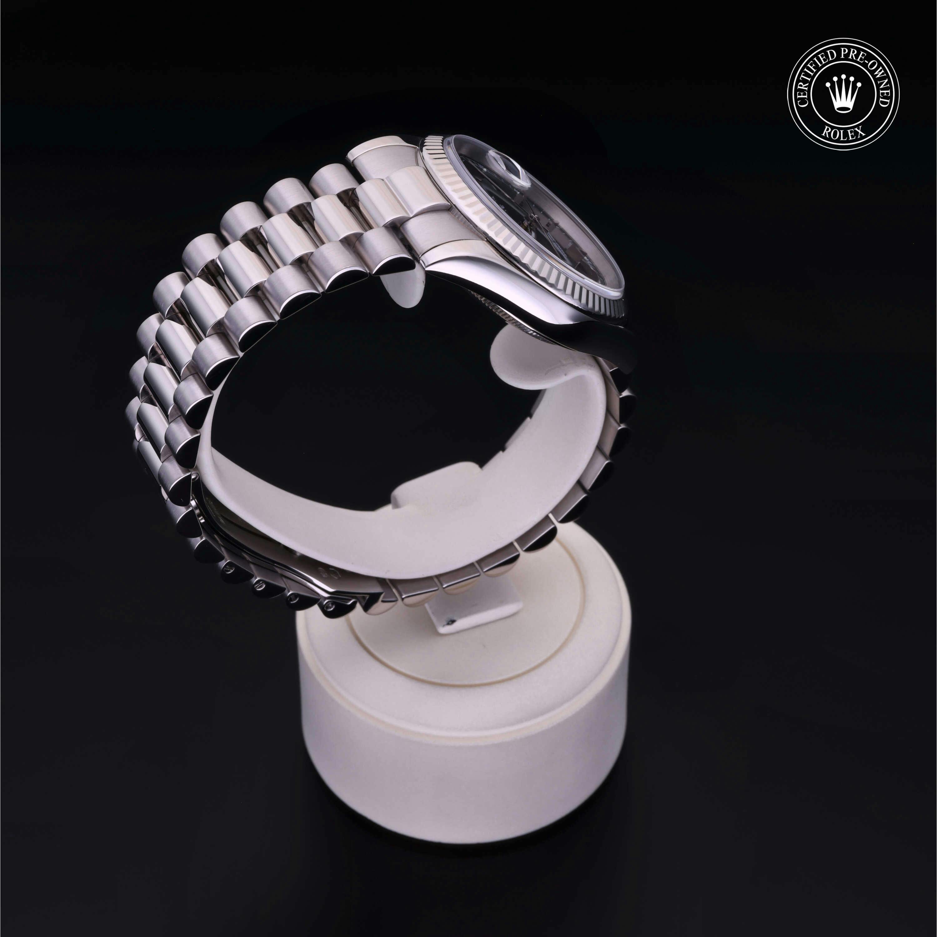 Rolex Certified Pre-Owned Day-Date (118239) self - winding automatic watch, features a 36mm 18k white gold case and fluted bezel surrounding a black dial on an 18k white gold president bracelet. Functions include hours, minutes, seconds, date and day. This watch has received Rolex-authorized service and certification. It comes with the original box, and includes a custom Rolex Certified Pre-Owned hang tag, travel pouch and RCPO international warranty card.