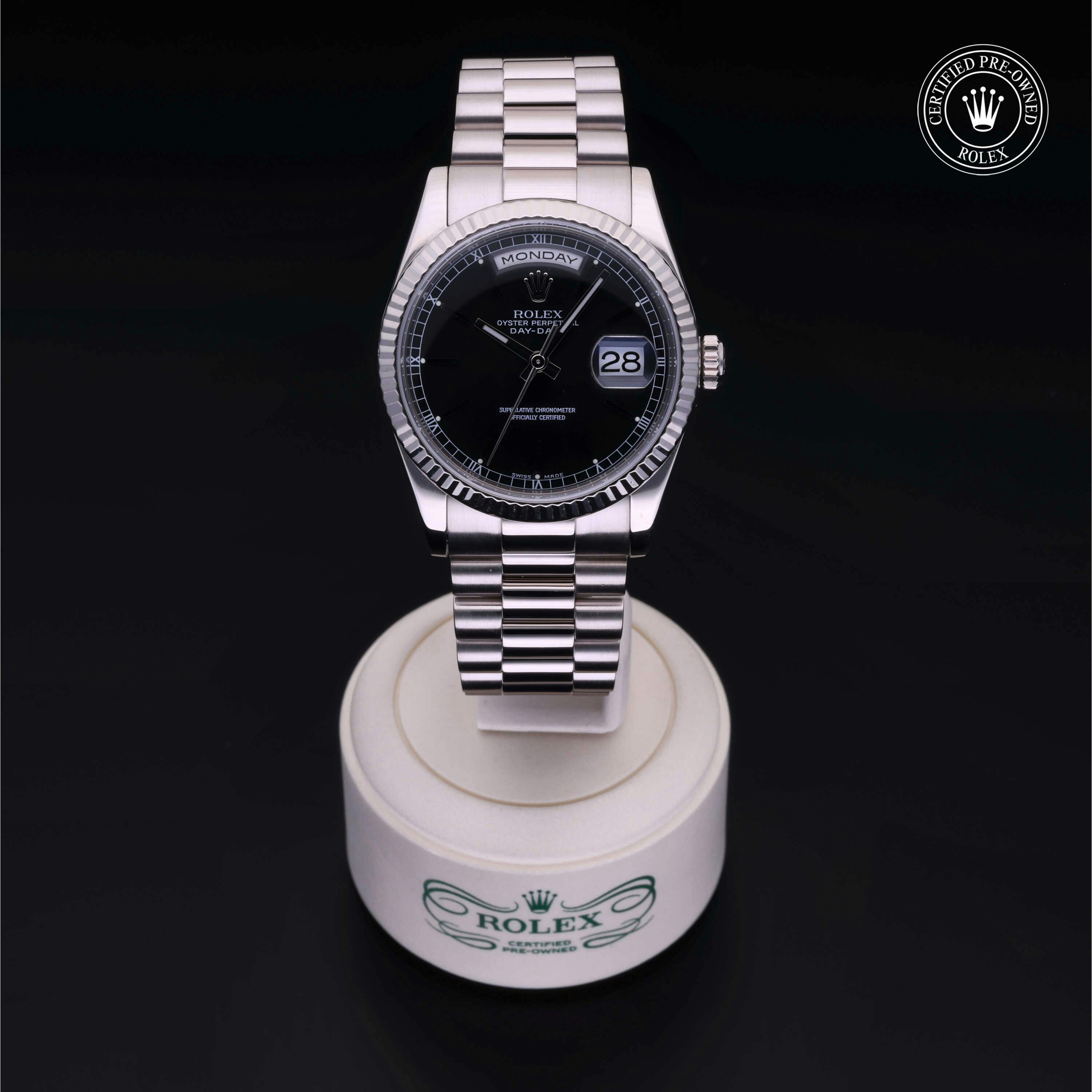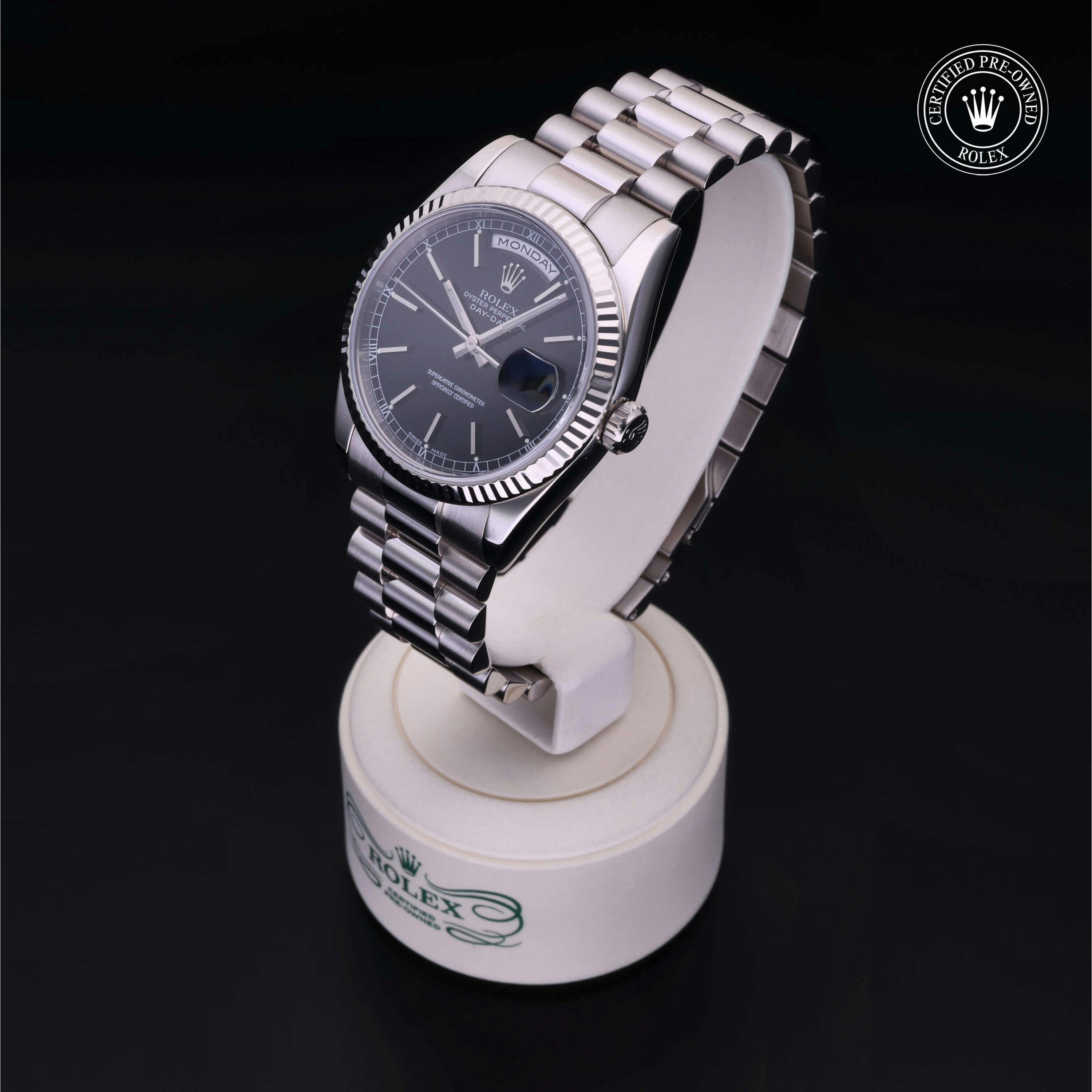 Rolex Certified Pre-Owned Day-Date (118239) self - winding automatic watch, features a 36mm 18k white gold case and fluted bezel surrounding a black dial on an 18k white gold president bracelet. Functions include hours, minutes, seconds, date and day. This watch has received Rolex-authorized service and certification. It comes with the original box, and includes a custom Rolex Certified Pre-Owned hang tag, travel pouch and RCPO international warranty card.