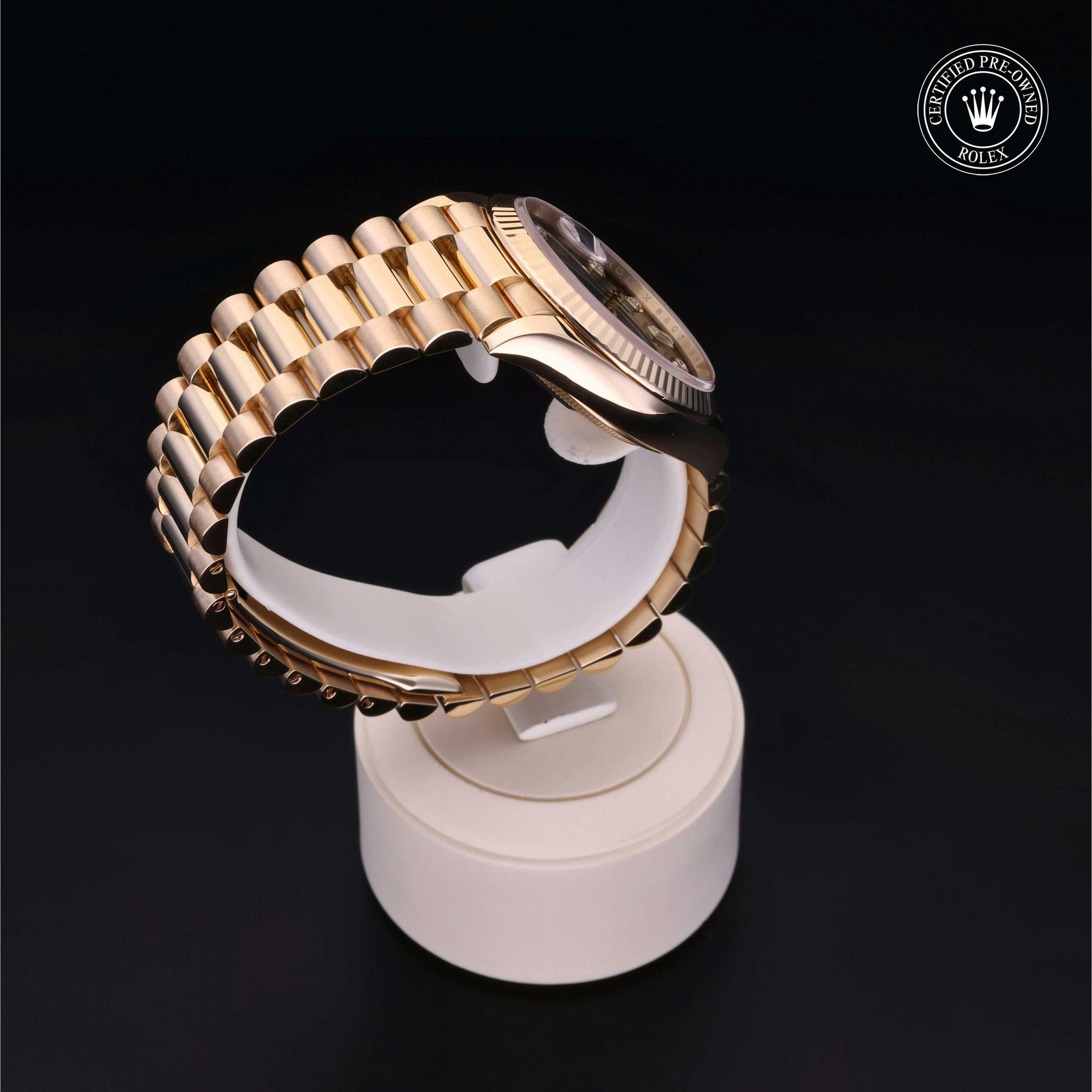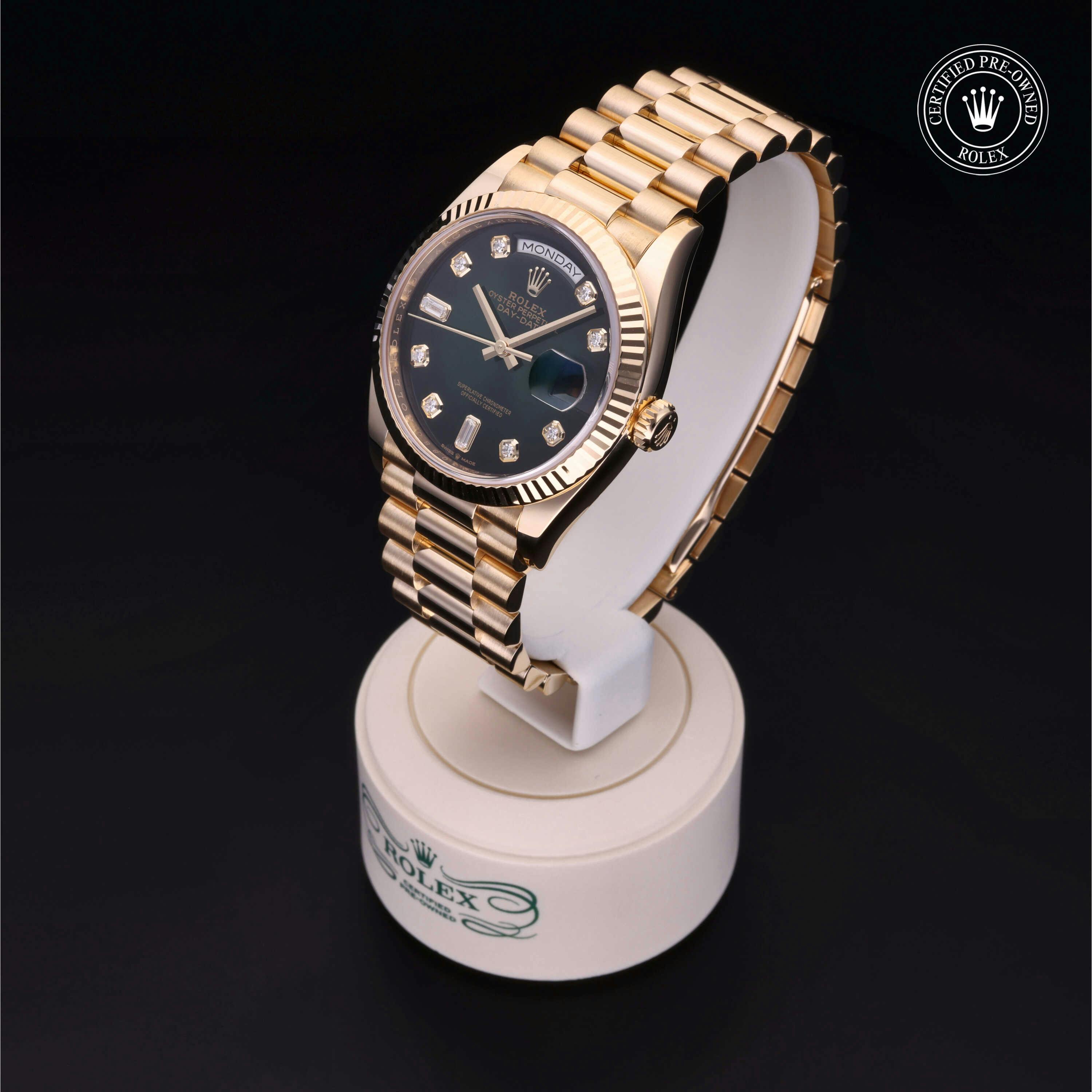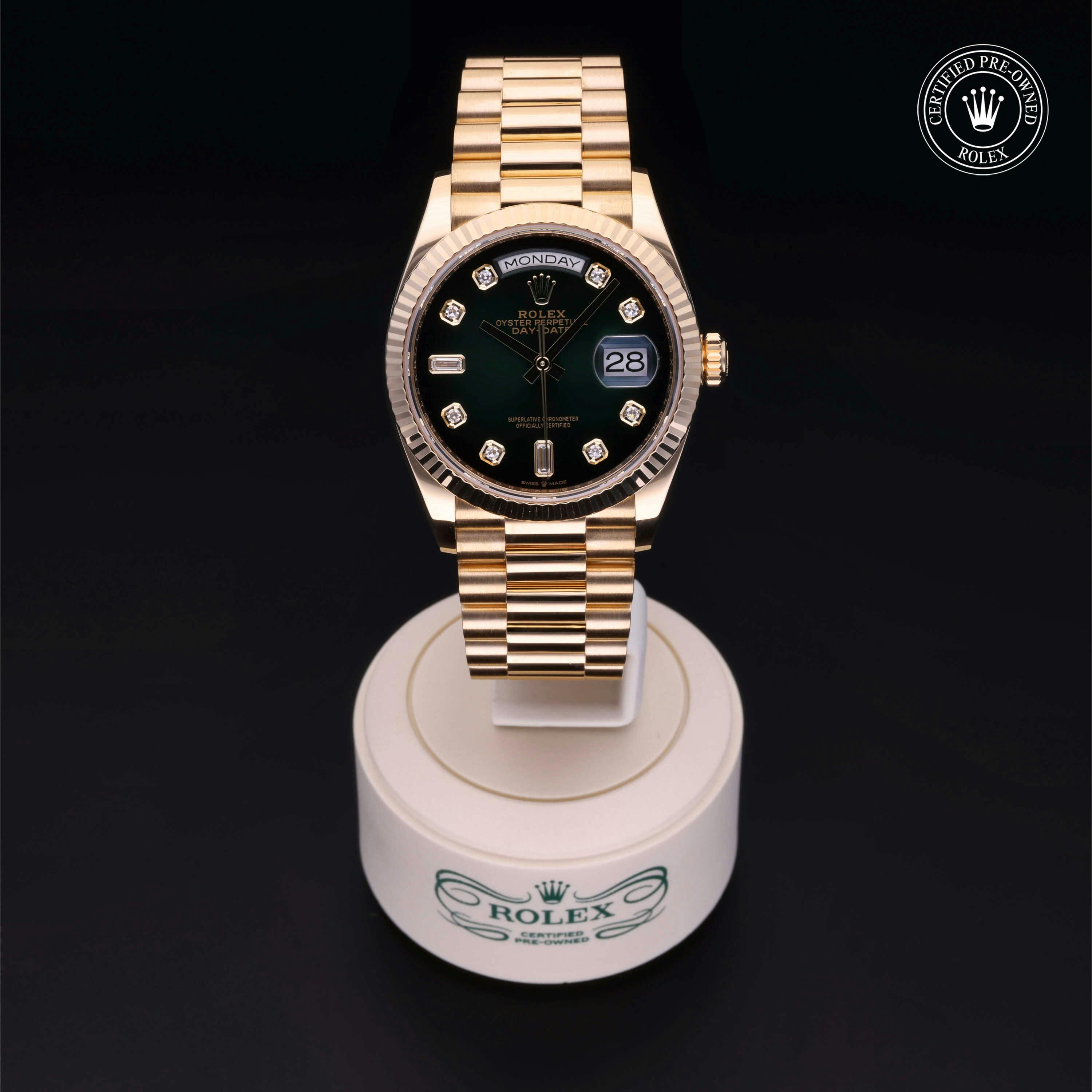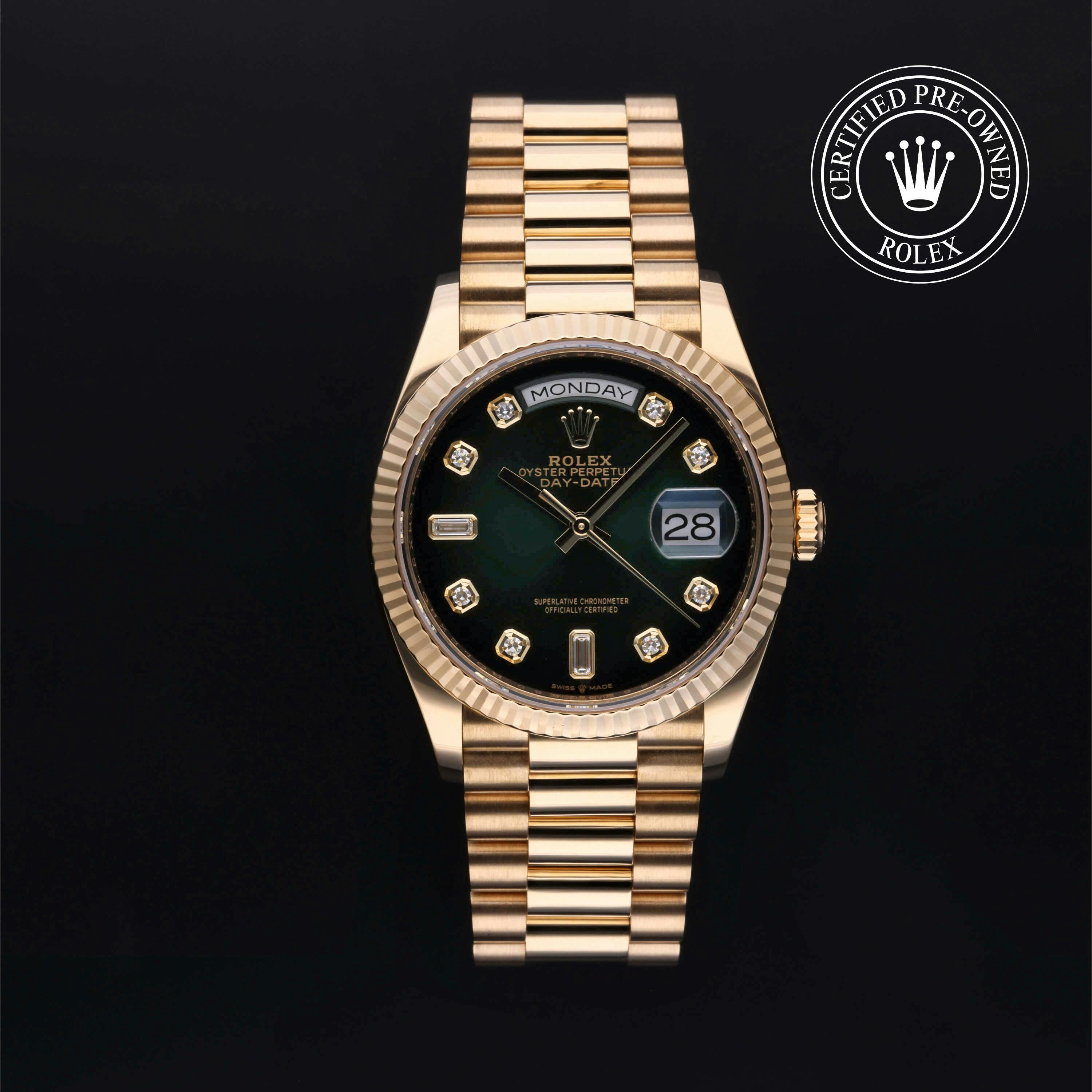 Rolex Certified Pre-Owned Day-Date (128238) self - winding automatic watch, features a 36mm 18k yellow gold case and fluted bezel surrounding a green ombre diamond set dial on an 18k yellow gold president bracelet. Functions include hours, minutes, seconds, date and day. This watch has received Rolex-authorized service and certification. It comes with the original papers, and includes a custom Rolex Certified Pre-Owned hang tag, travel pouch and RCPO international warranty card.