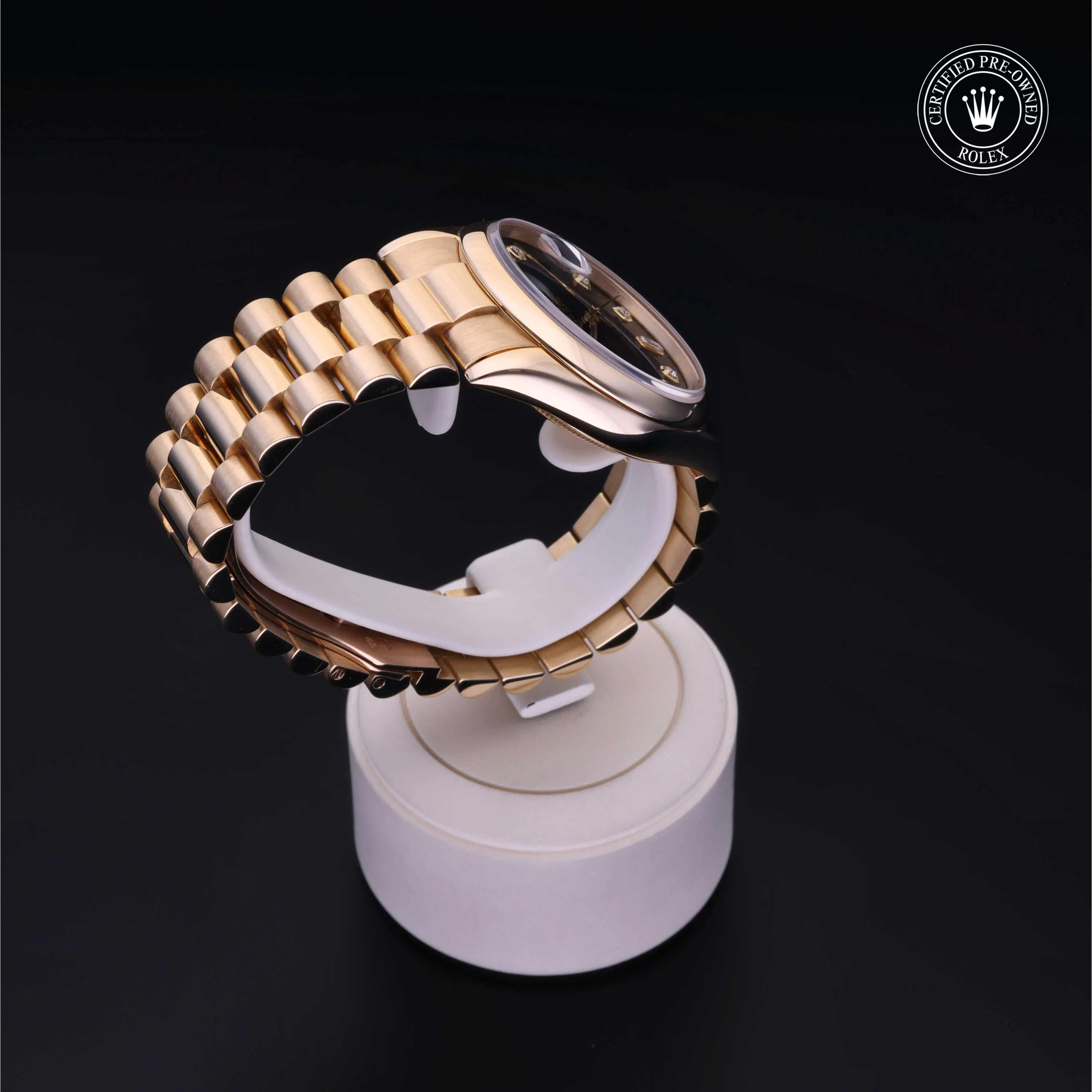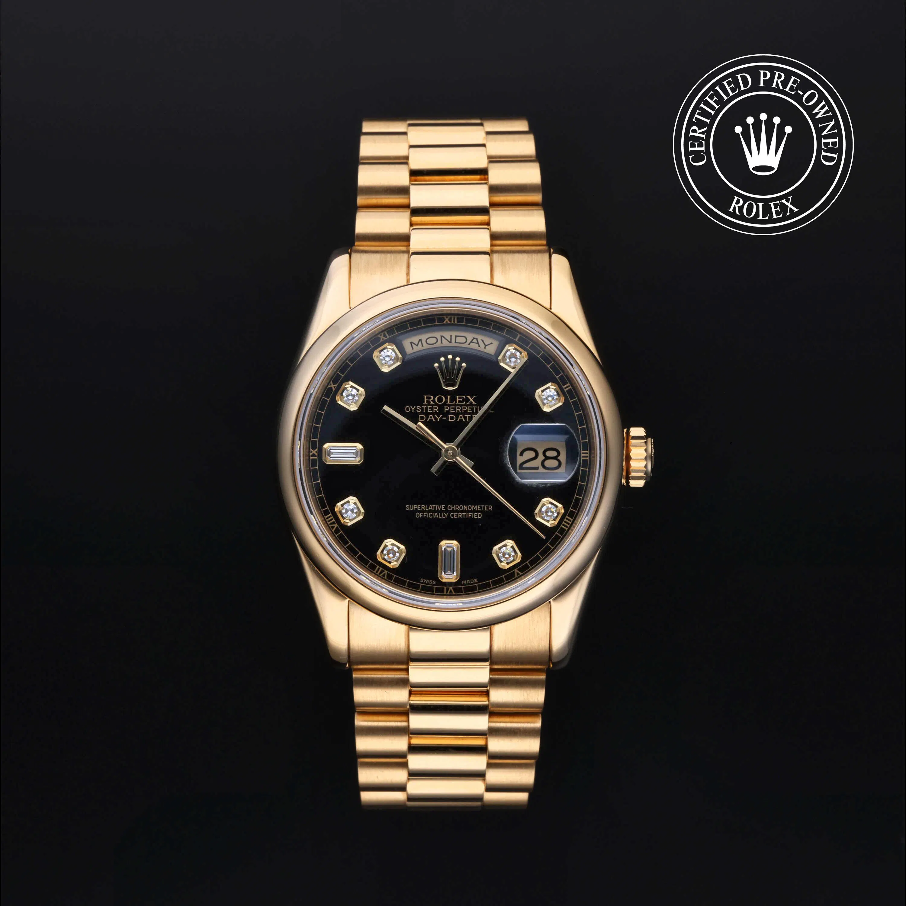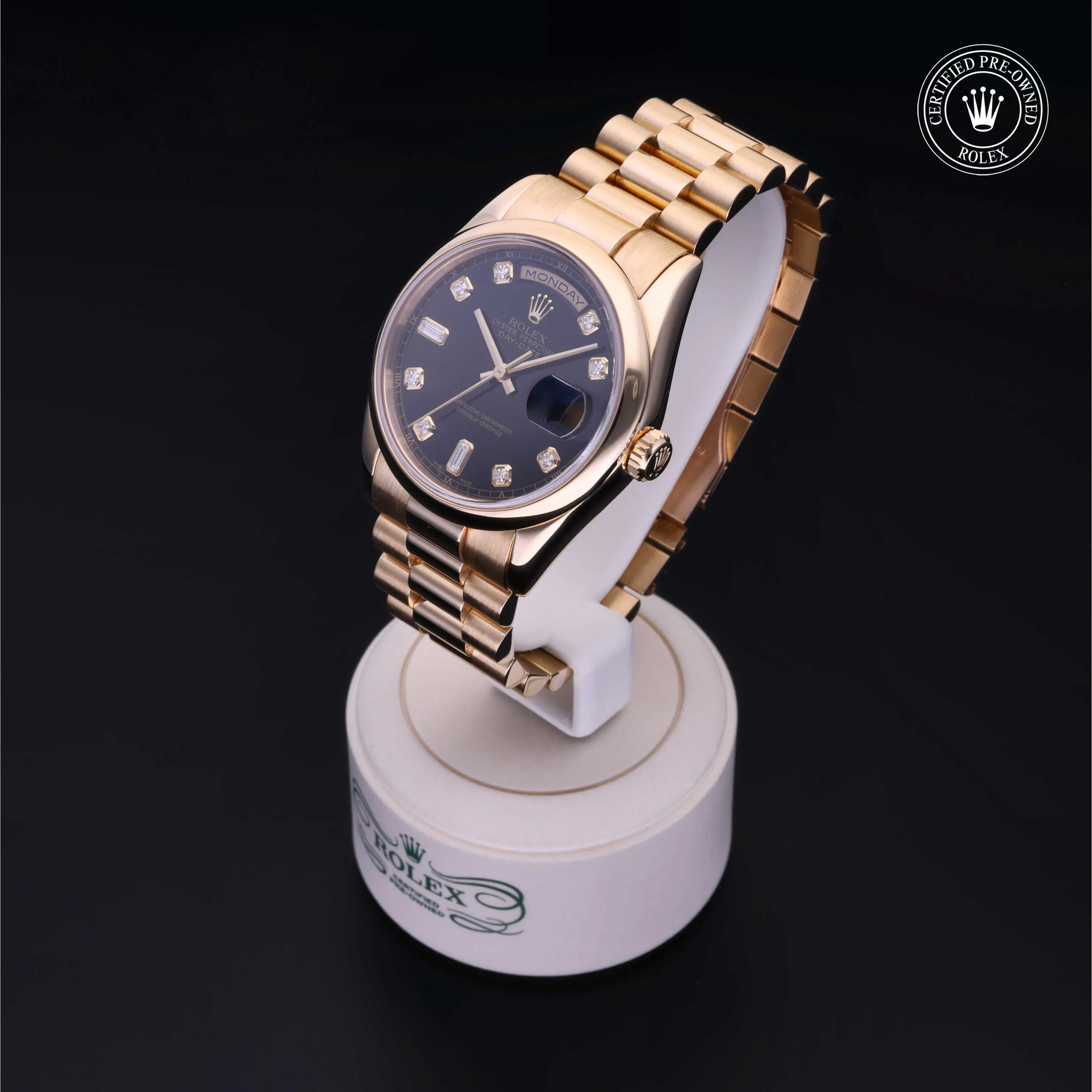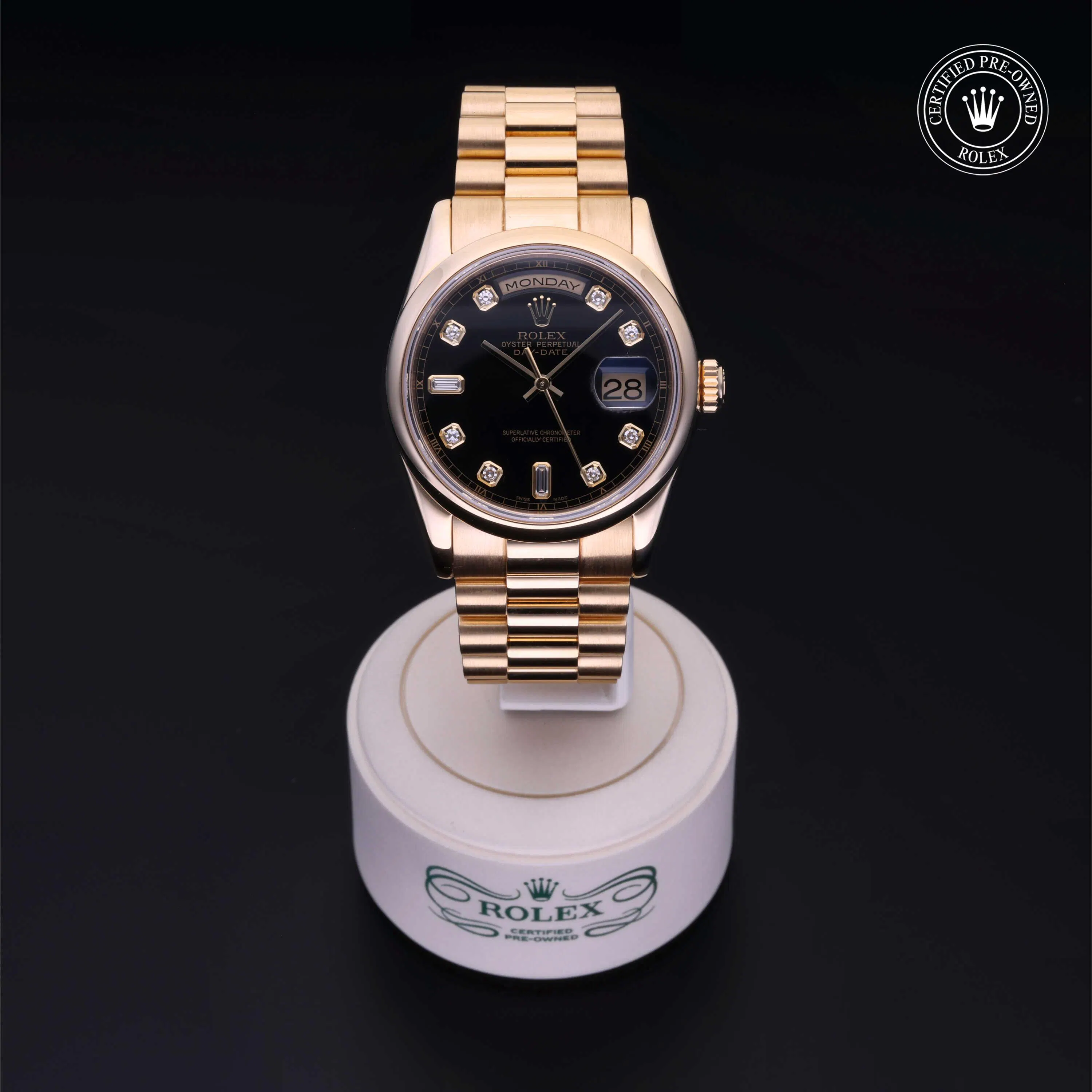 Rolex Certified Pre-Owned Day-Date (118208) self - winding automatic watch, features a 36mm 18k yellow gold case and domed bezel surrounding a black diamond set dial on an 18k yellow gold president bracelet. Functions include hours, minutes, seconds, date and day. This watch has received Rolex-authorized service and certification. It comes with the original papers, and includes a custom Rolex Certified Pre-Owned hang tag, travel pouch and RCPO international warranty card.