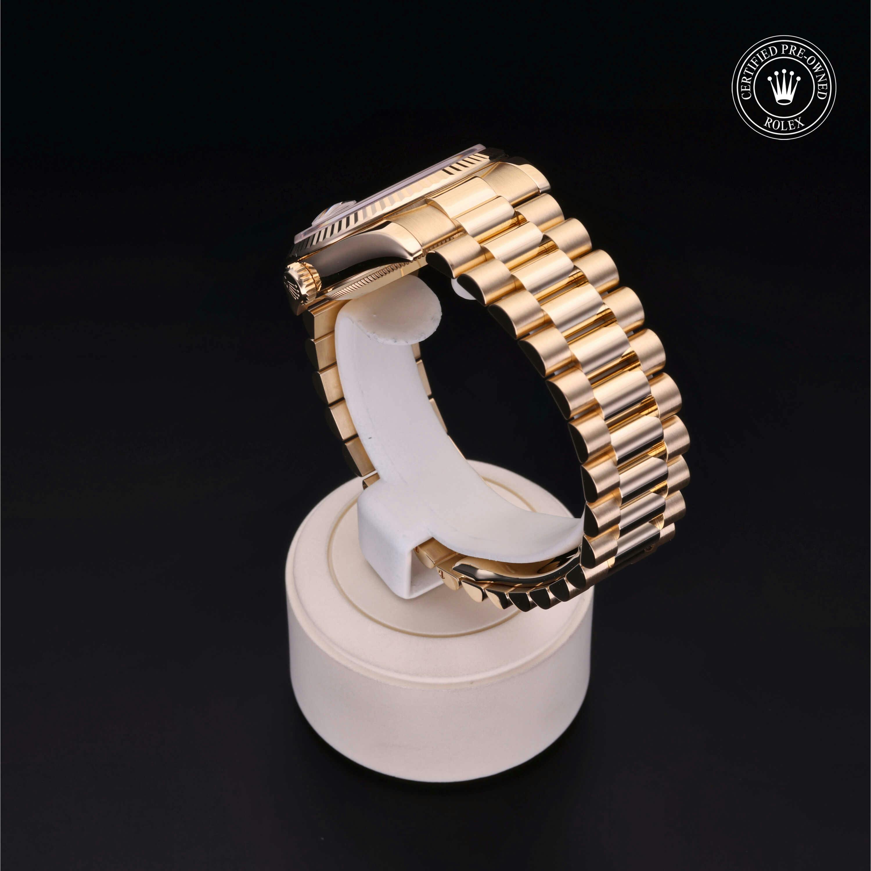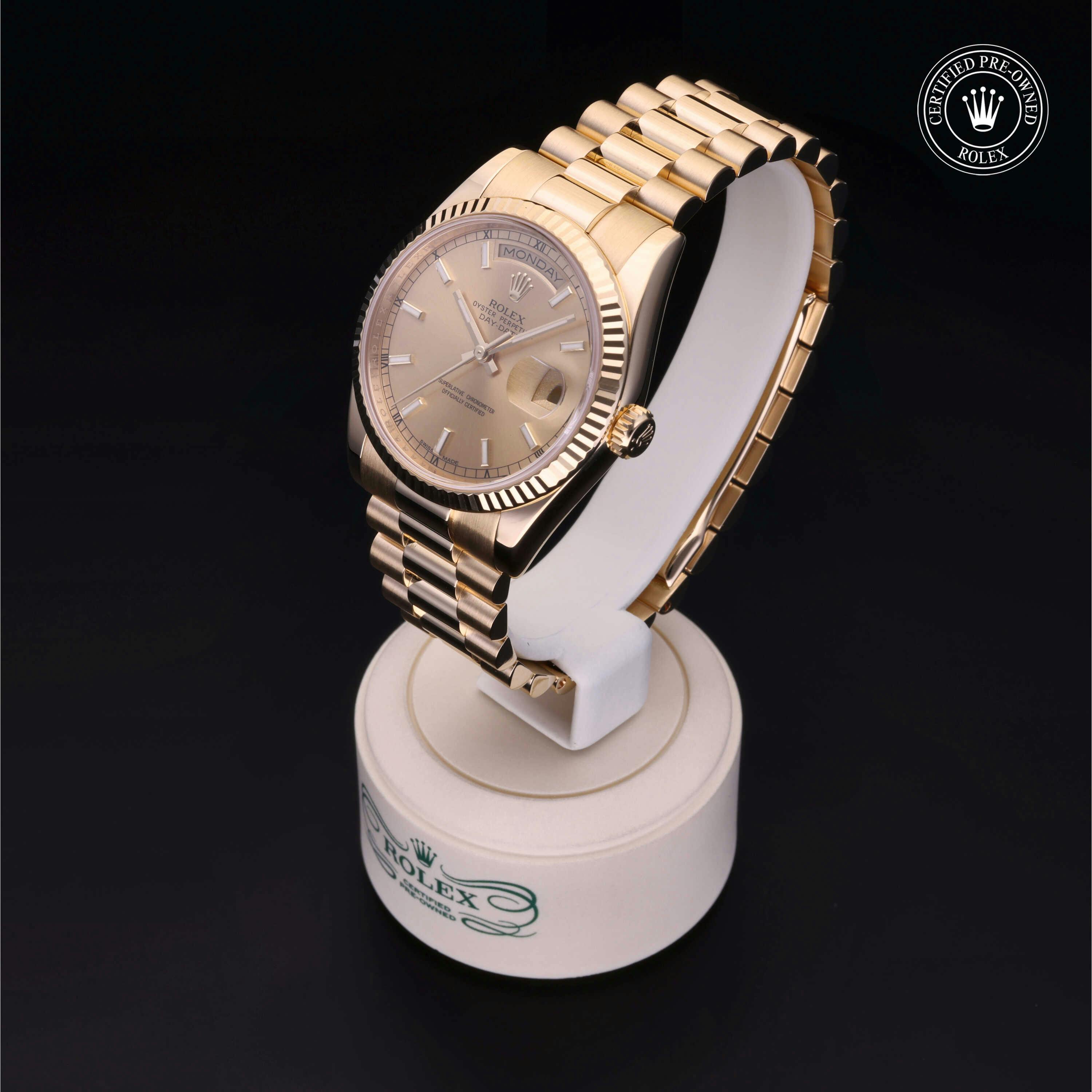 Rolex Certified Pre-Owned Day-Date (118238) self - winding automatic watch, features a 36mm 18k yellow gold case and fluted bezel surrounding a champagne dial on an 18k yellow gold president bracelet. Functions include hours, minutes, seconds, date and day. This watch has received Rolex-authorized service and certification. It comes with the original box and papers, and includes a custom Rolex Certified Pre-Owned hang tag, travel pouch and RCPO international warranty card.