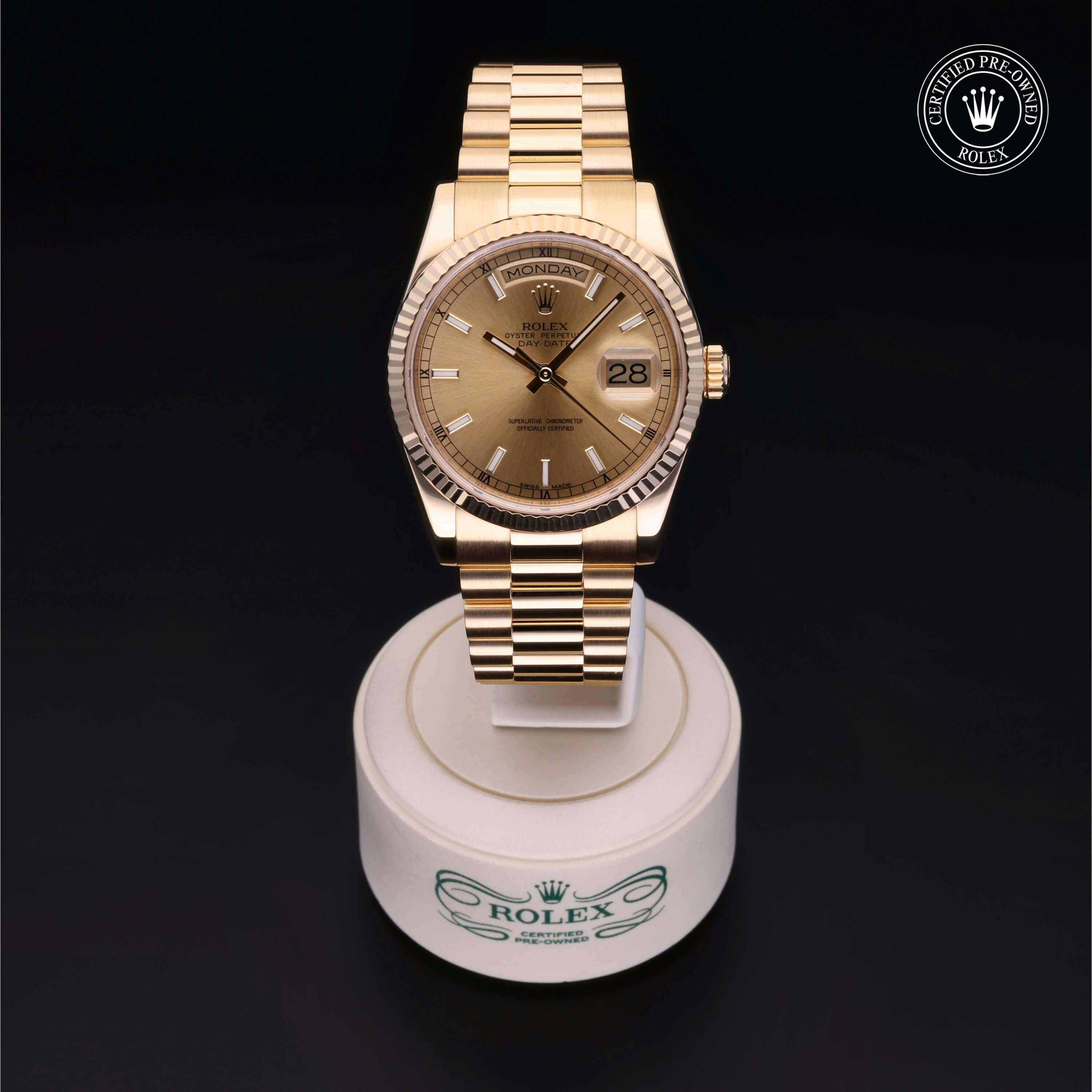Rolex Certified Pre-Owned Day-Date (118238) self - winding automatic watch, features a 36mm 18k yellow gold case and fluted bezel surrounding a champagne dial on an 18k yellow gold president bracelet. Functions include hours, minutes, seconds, date and day. This watch has received Rolex-authorized service and certification. It comes with the original box and papers, and includes a custom Rolex Certified Pre-Owned hang tag, travel pouch and RCPO international warranty card.