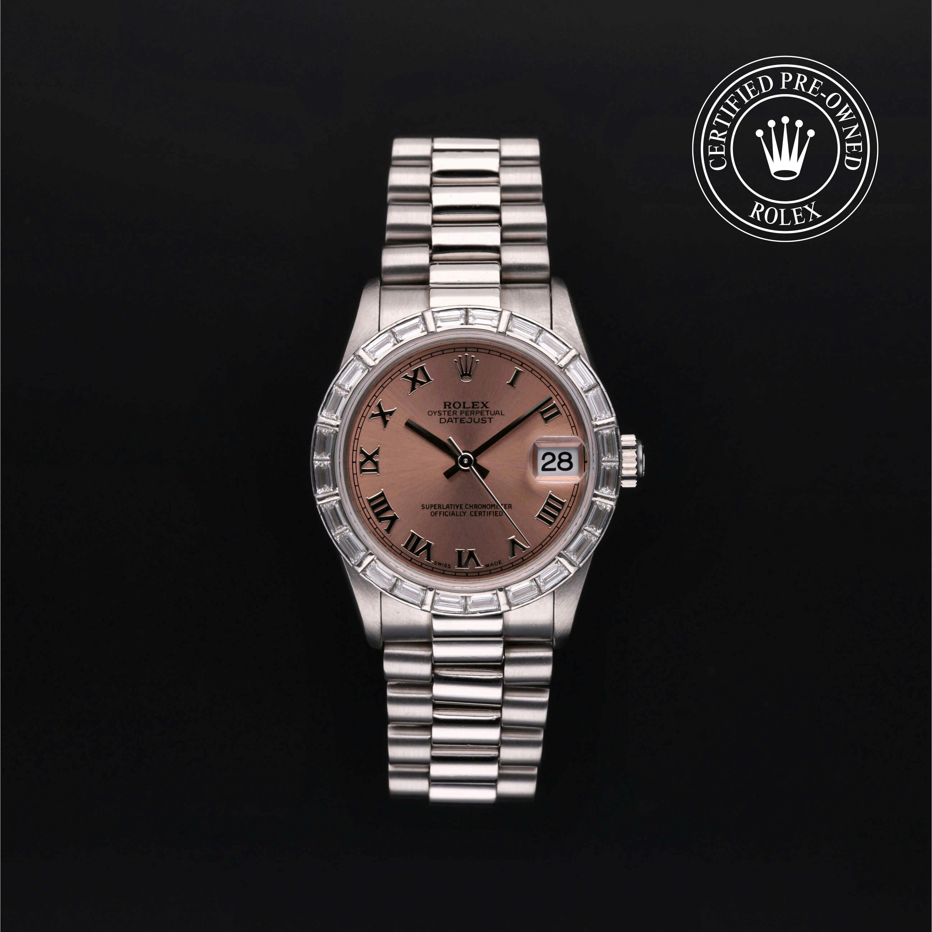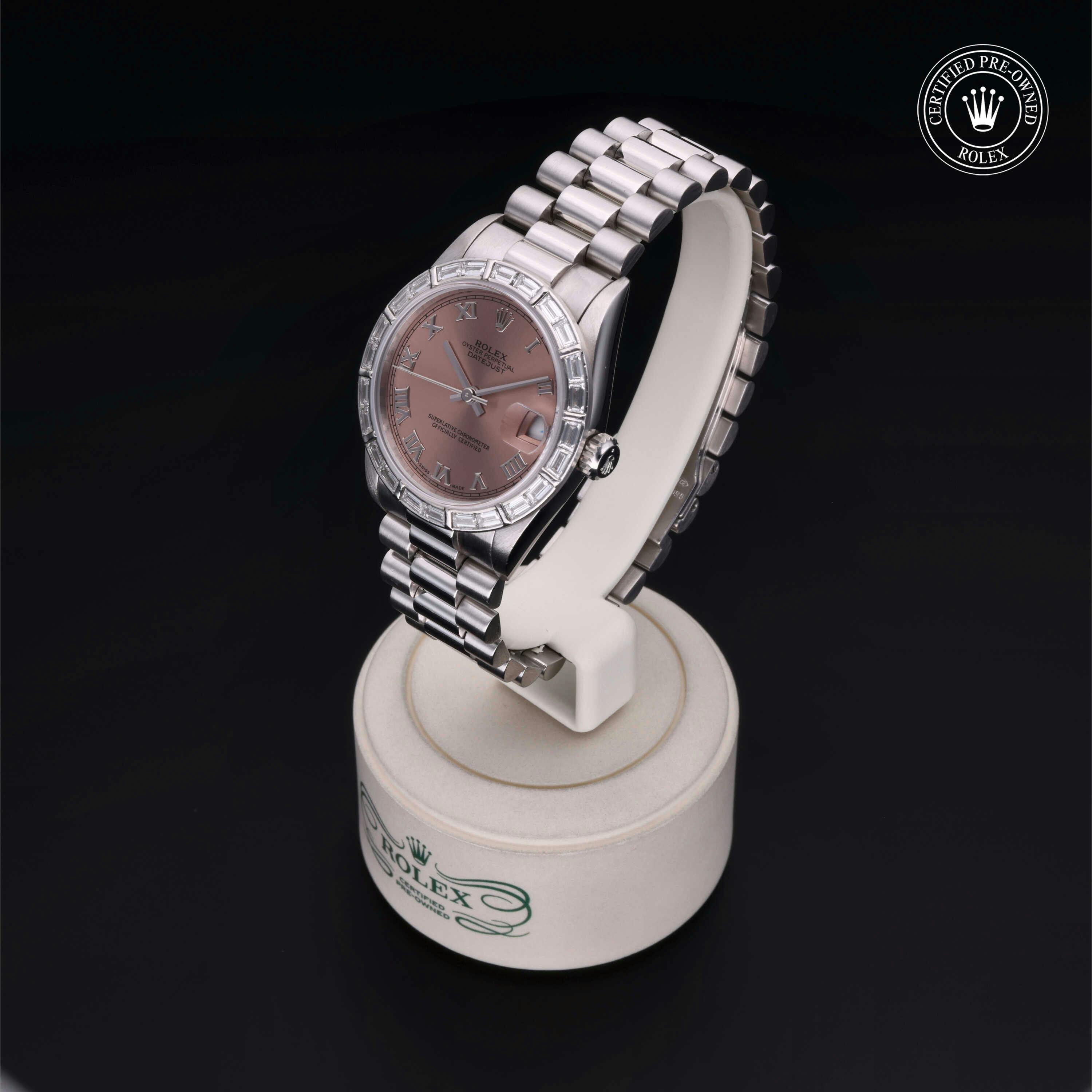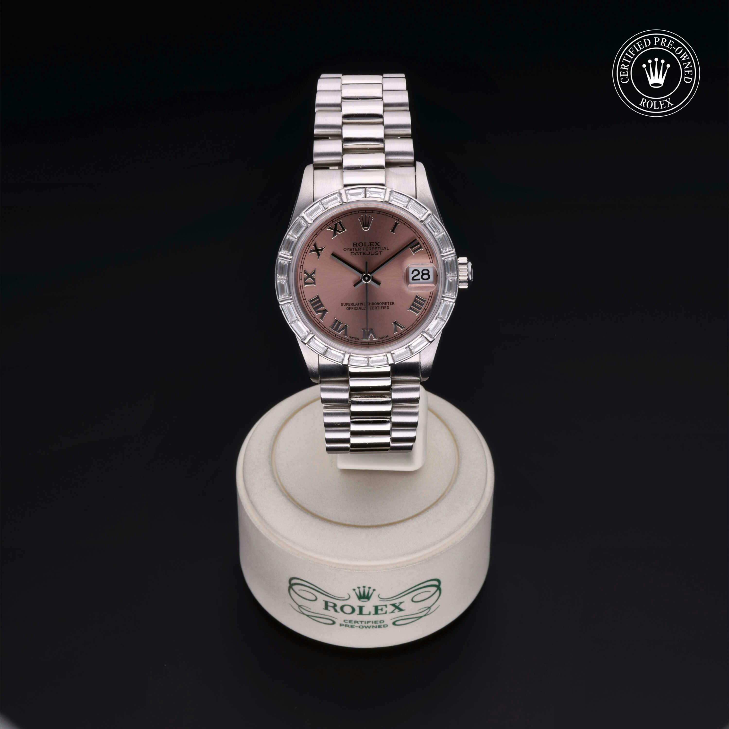 Rolex Certified Pre-Owned Datejust (78266) self - winding automatic watch, features a 31mm platinum case with a diamond set bezel surrounding a pink dial on a platinum president bracelet. Functions include hours, minutes, seconds and date. This watch has received Rolex-authorized service and certification. It comes with the original papers, and includes a custom Rolex Certified Pre-Owned hang tag, travel pouch and RCPO international warranty card.
