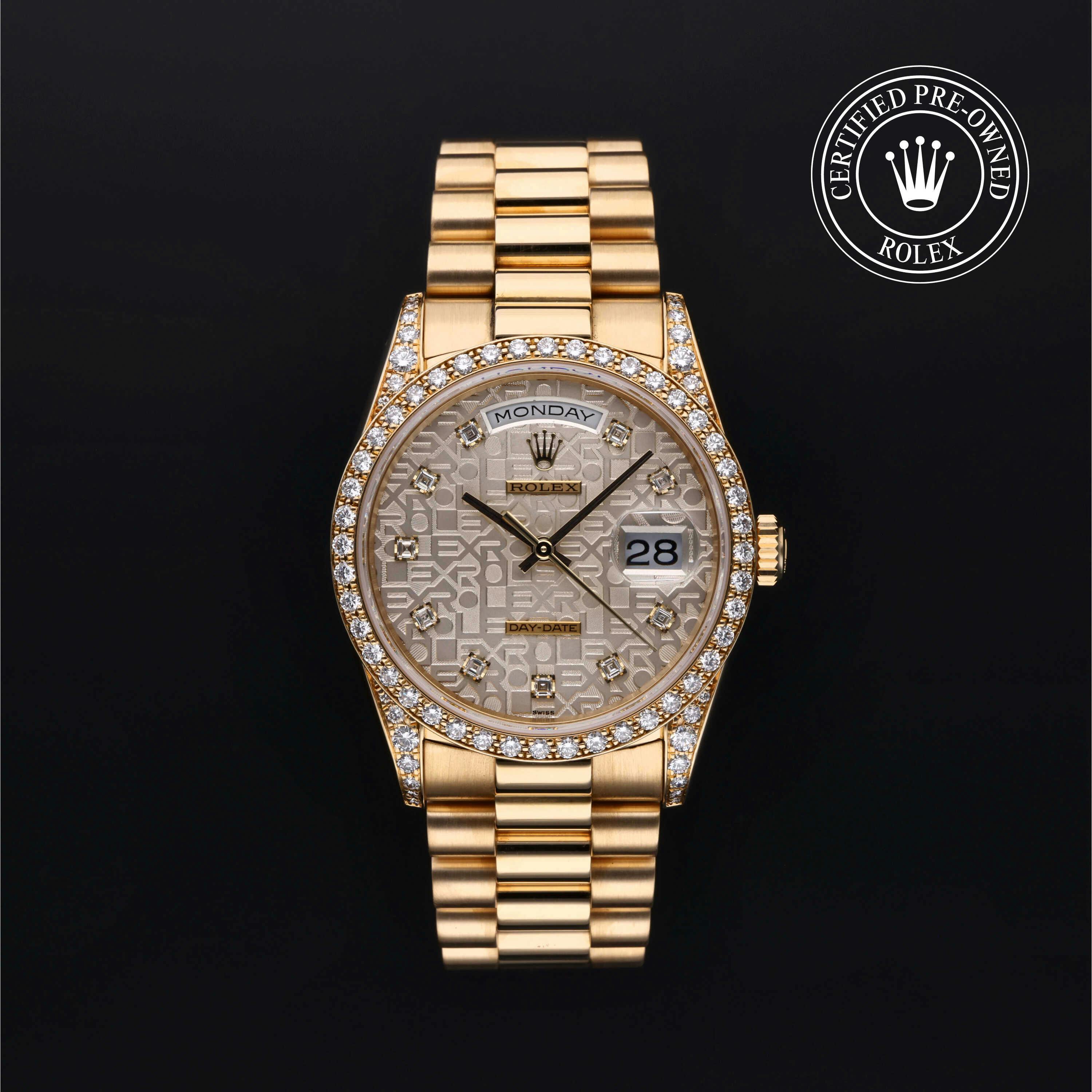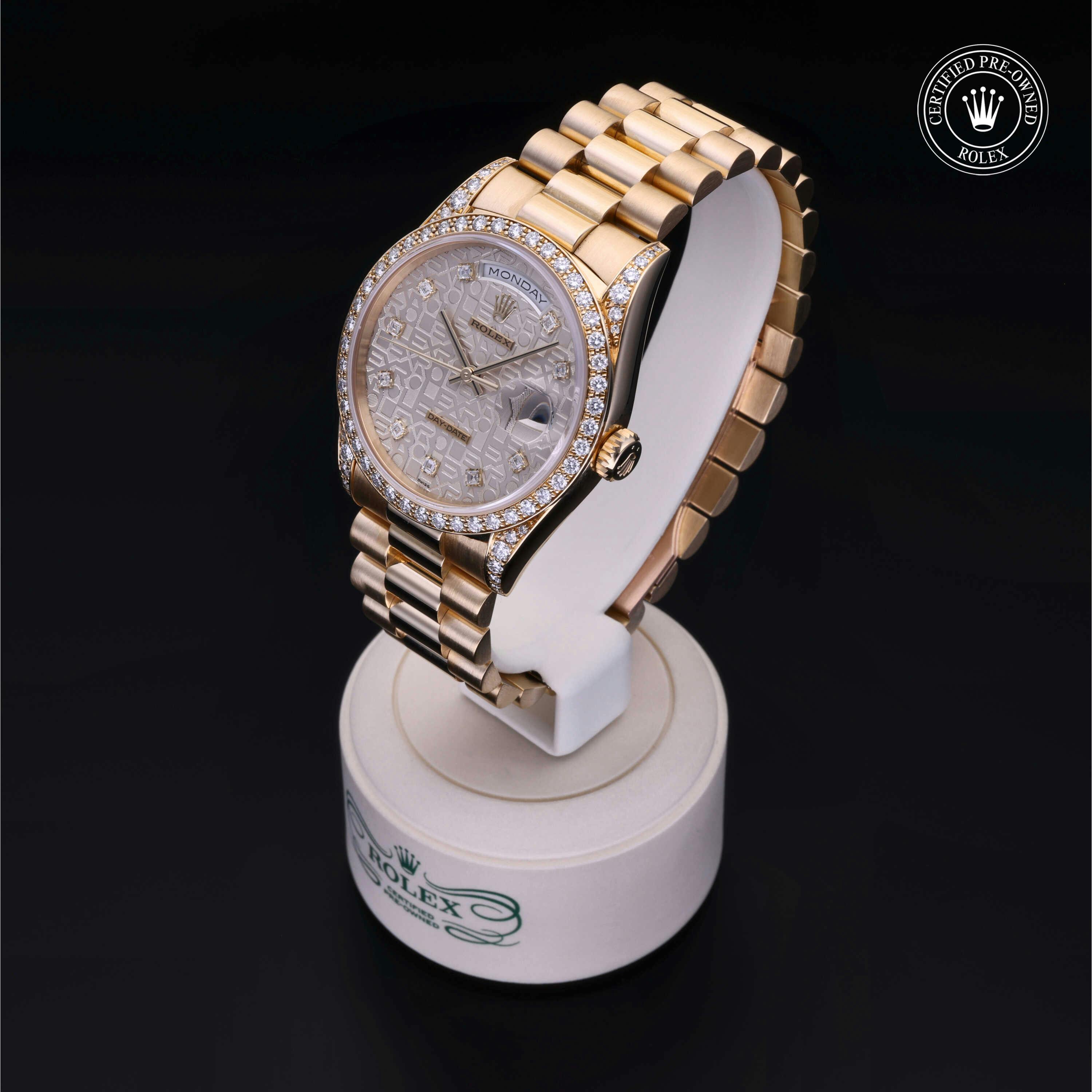 Rolex Certified Pre-Owned Day-Date (18388) self - winding automatic watch, features a 36mm 18k yellow gold diamond set case surrounding a silver Jubilee diamond set dial on an 18k yellow gold president bracelet. Functions include hours, minutes, seconds, date and day. This watch has received Rolex-authorized service and certification. It does not come with the original box or papers, but includes a custom Rolex Certified Pre-Owned hang tag, travel pouch and RCPO international warranty card.