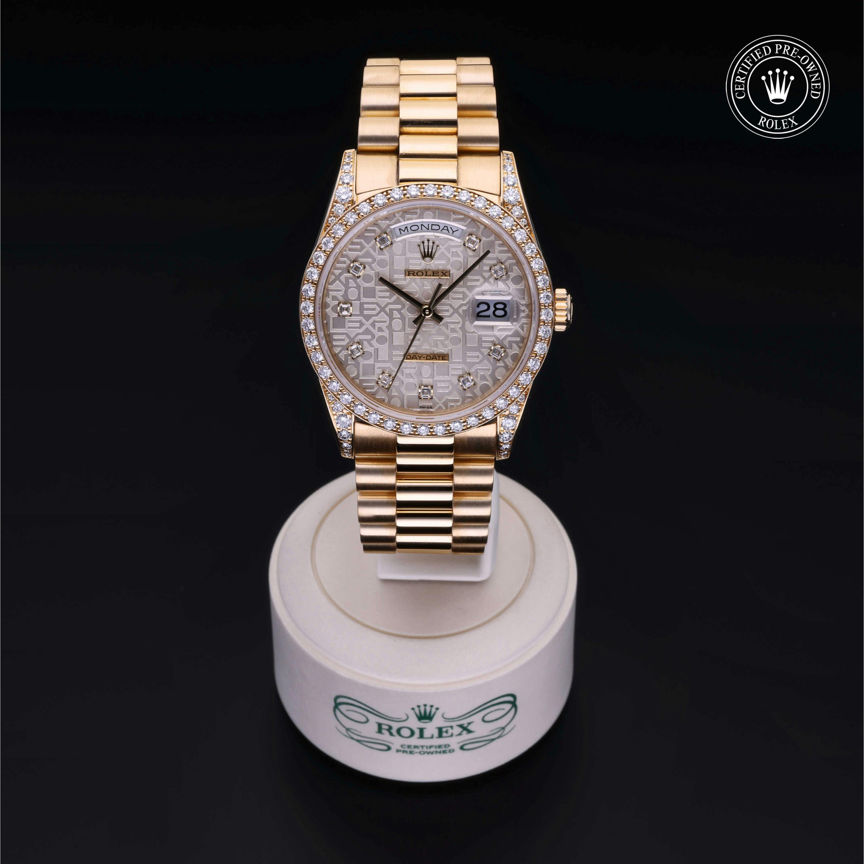 Rolex Certified Pre-Owned Day-Date (18388) self - winding automatic watch, features a 36mm 18k yellow gold diamond set case surrounding a silver Jubilee diamond set dial on an 18k yellow gold president bracelet. Functions include hours, minutes, seconds, date and day. This watch has received Rolex-authorized service and certification. It does not come with the original box or papers, but includes a custom Rolex Certified Pre-Owned hang tag, travel pouch and RCPO international warranty card.