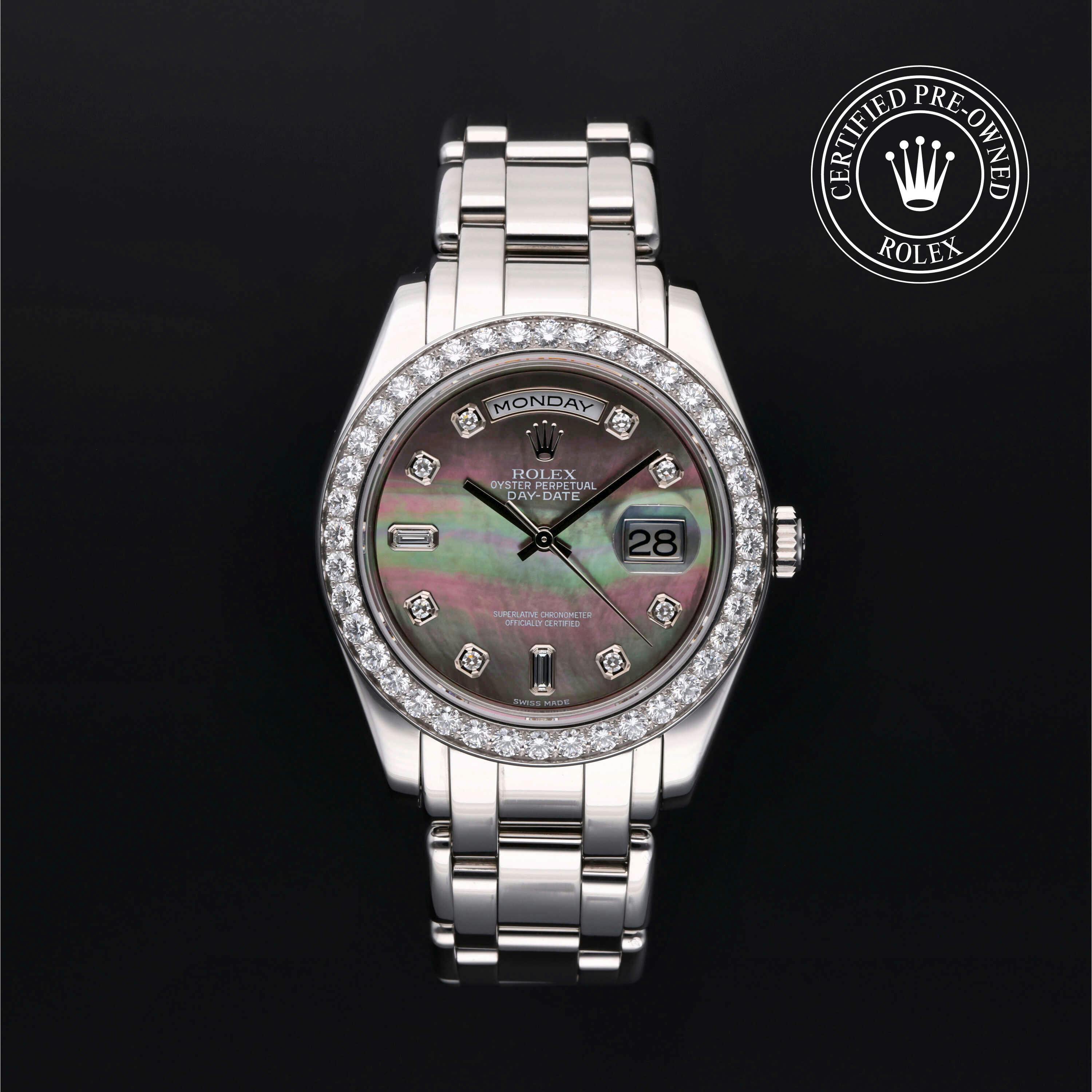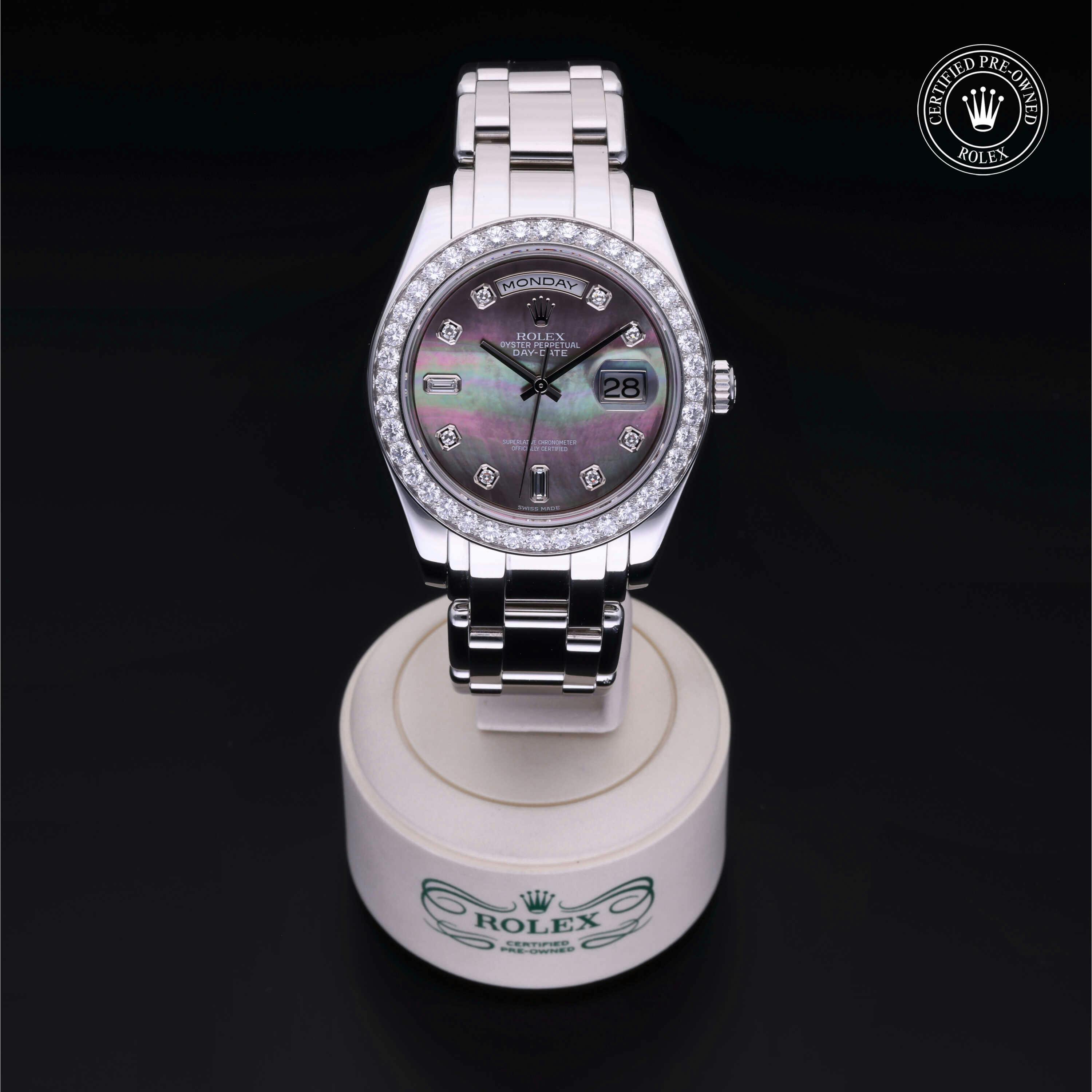 Rolex Certified Pre-Owned Day-Date (18946) self - winding automatic watch, features a 39mm platinum case with a diamond set bezel surrounding a black, mother of pearl diamond set dial on a platinum pearlmaster bracelet. Functions include hours, minutes, seconds, date and day. This watch has received Rolex-authorized service and certification. It does not come with the original box or papers, but includes a custom Rolex Certified Pre-Owned hang tag, travel pouch and RCPO international warranty card.