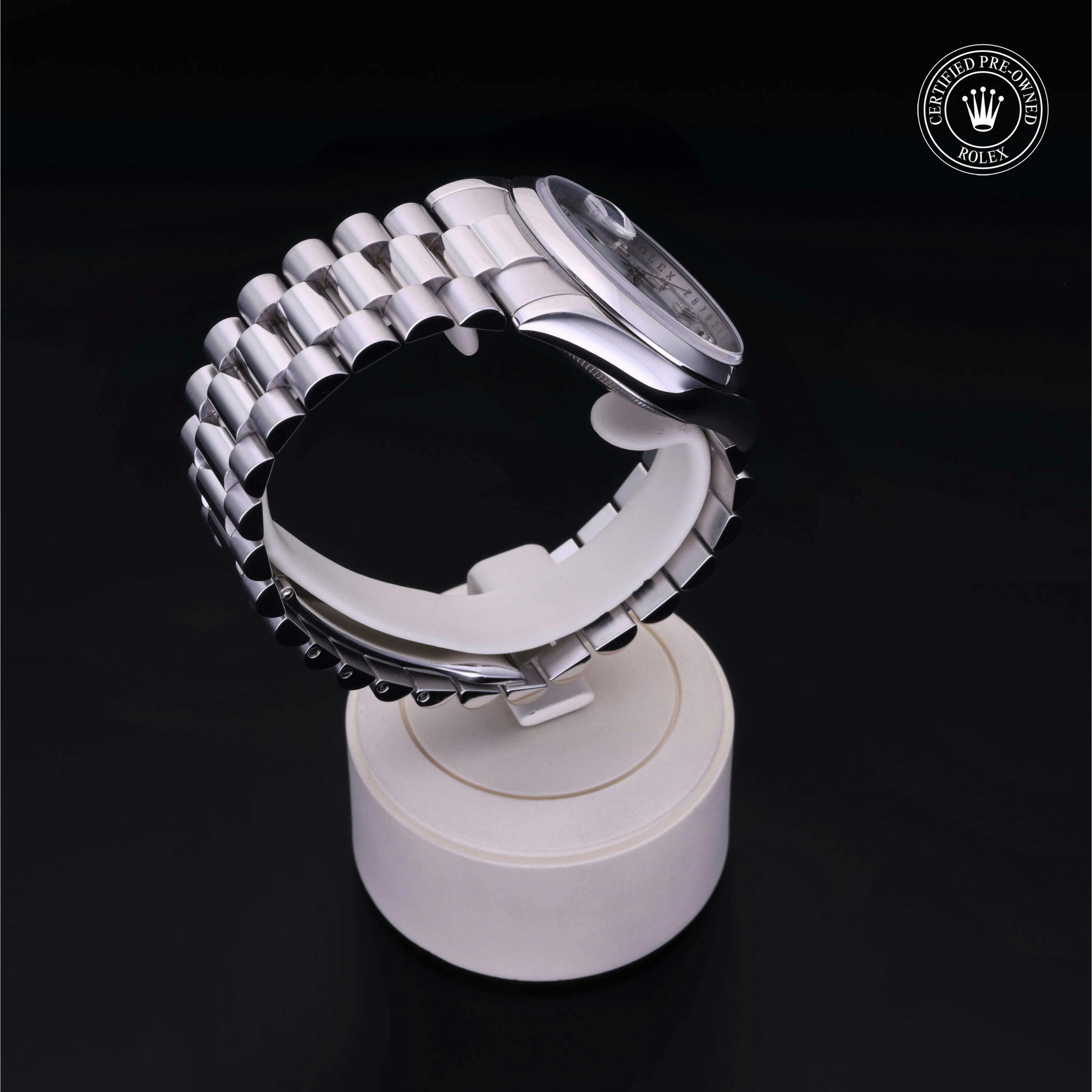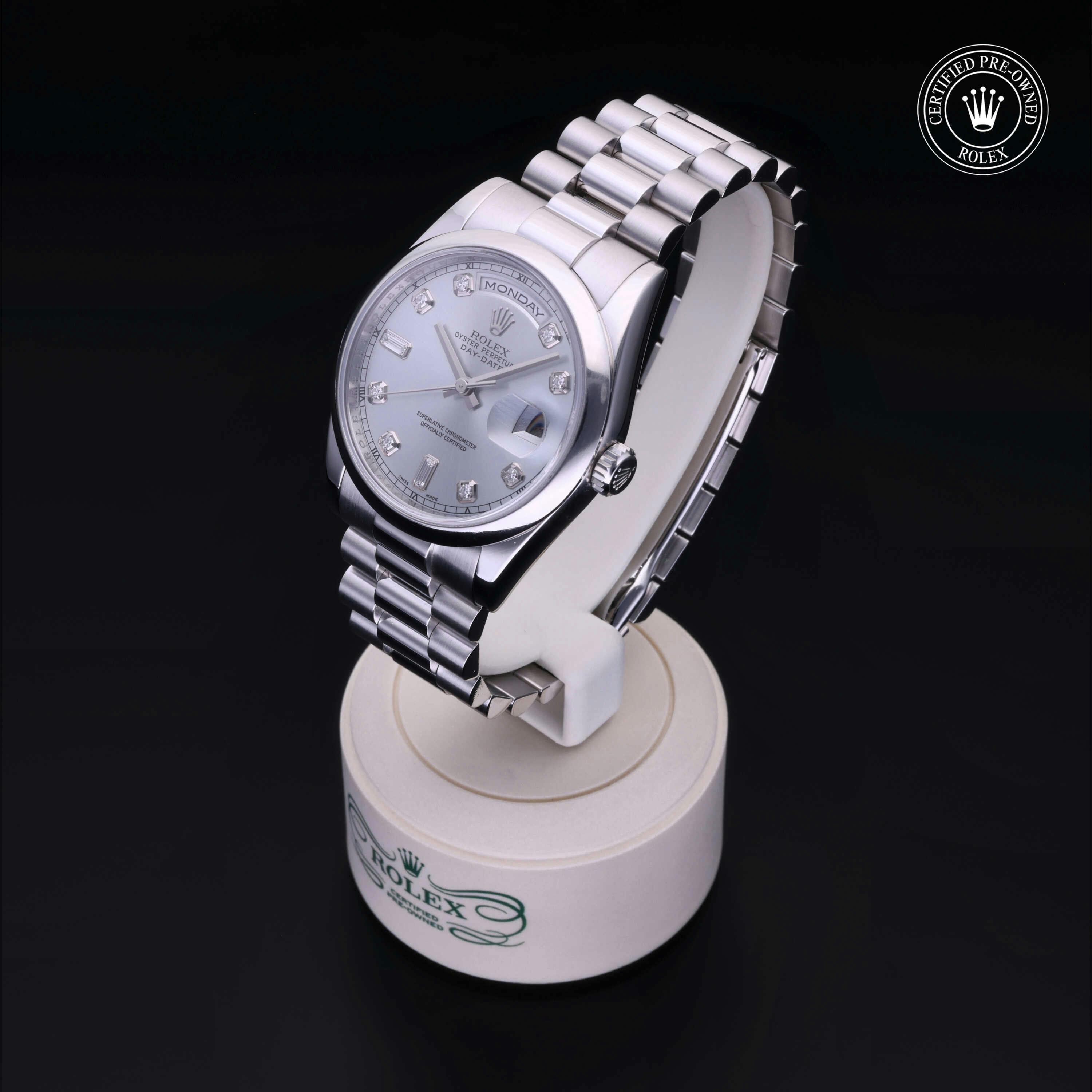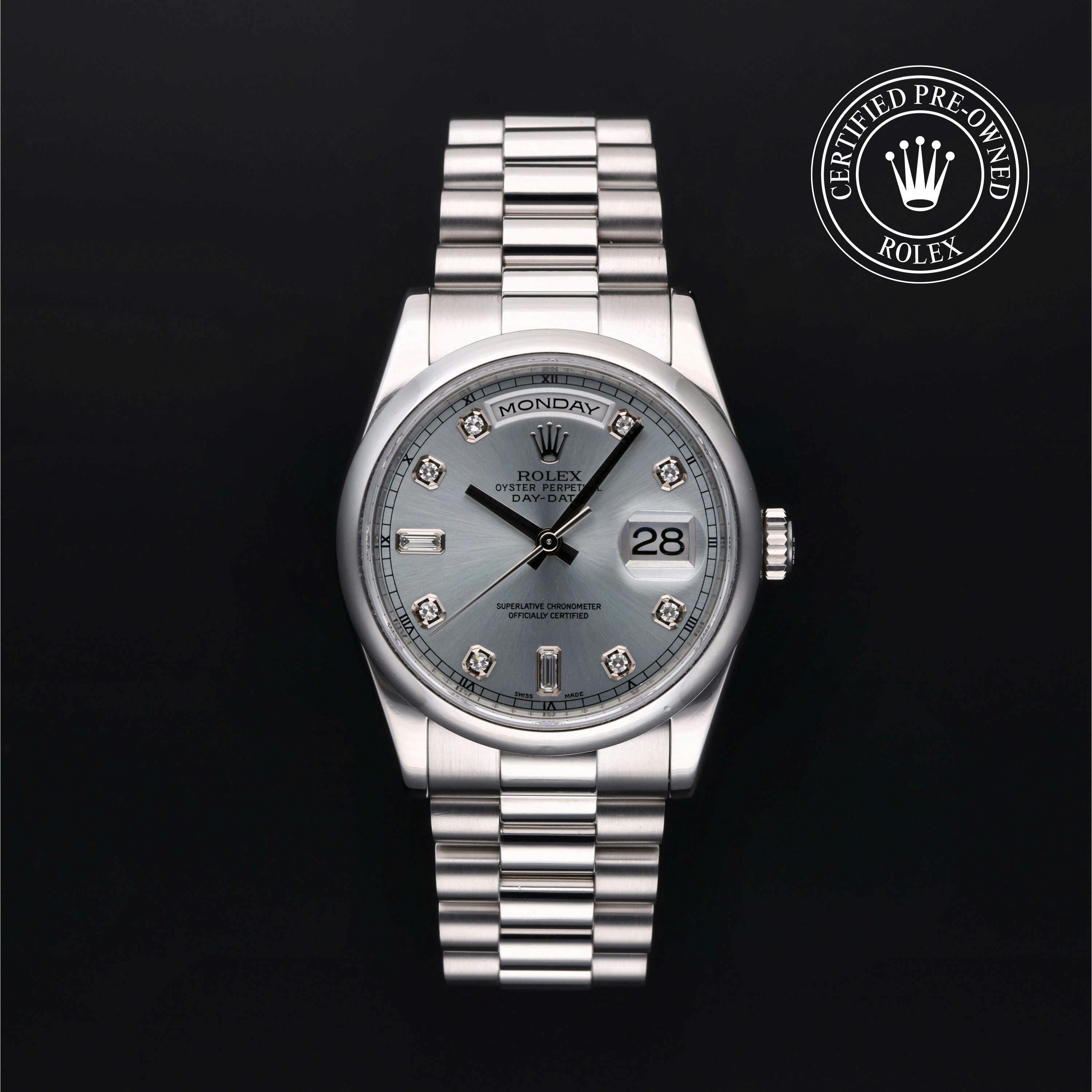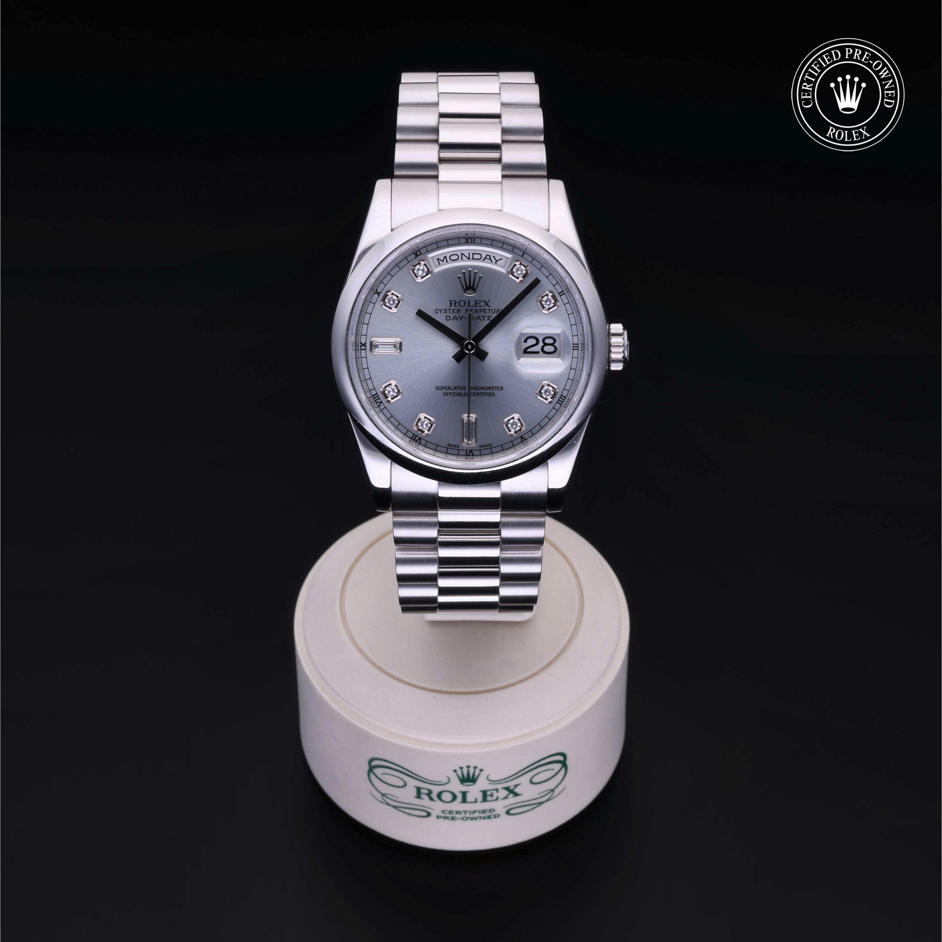 Rolex Certified Pre-Owned Day-Date (118206) self - winding automatic watch, features a 36mm platinum case and domed bezel surrounding an ice blue diamond set dial on a platinum president bracelet. Functions include hours, minutes and seconds. This watch has received Rolex-authorized service and certification. It does not come with the original box or papers, but includes a custom Rolex Certified Pre-Owned hang tag, travel pouch and RCPO international warranty card.