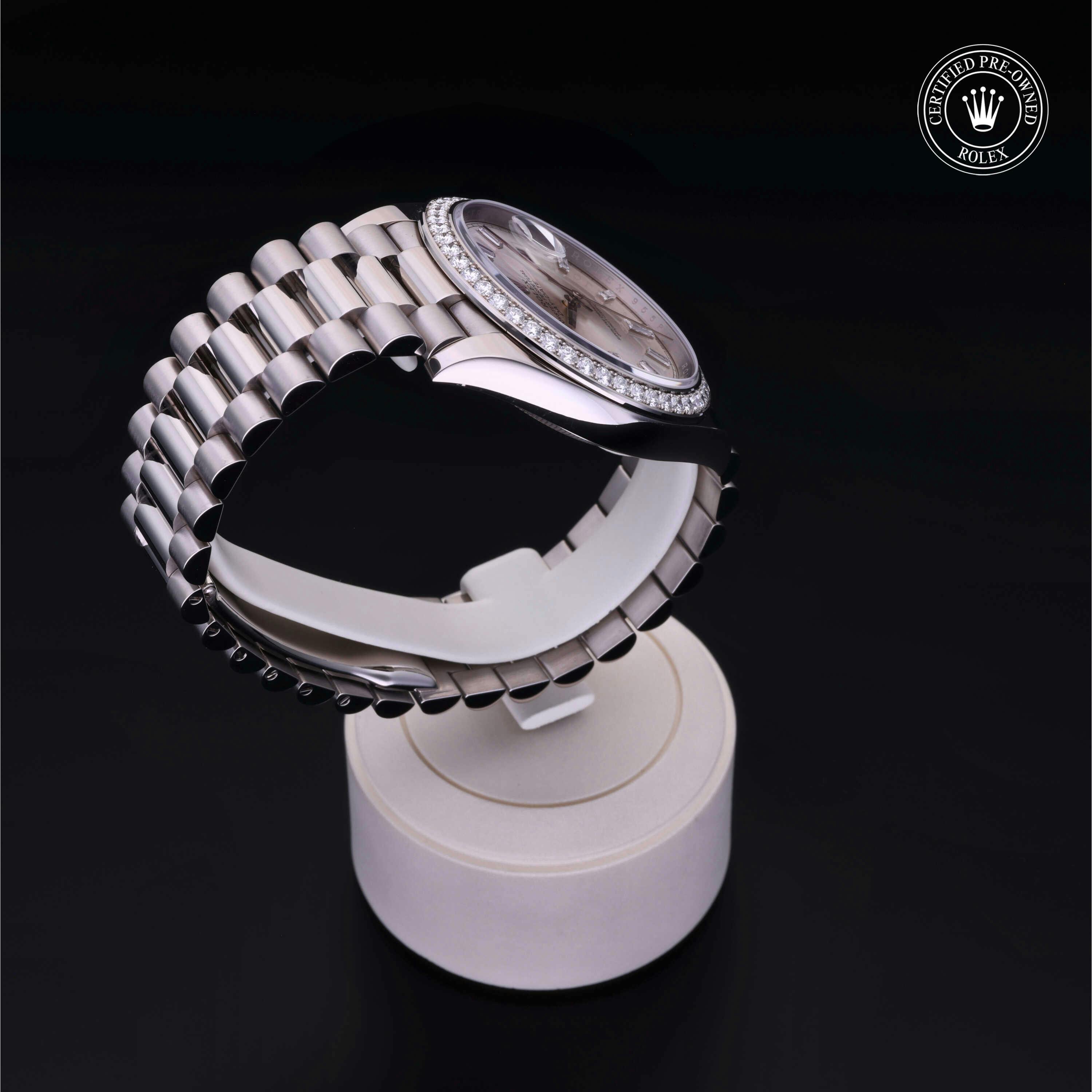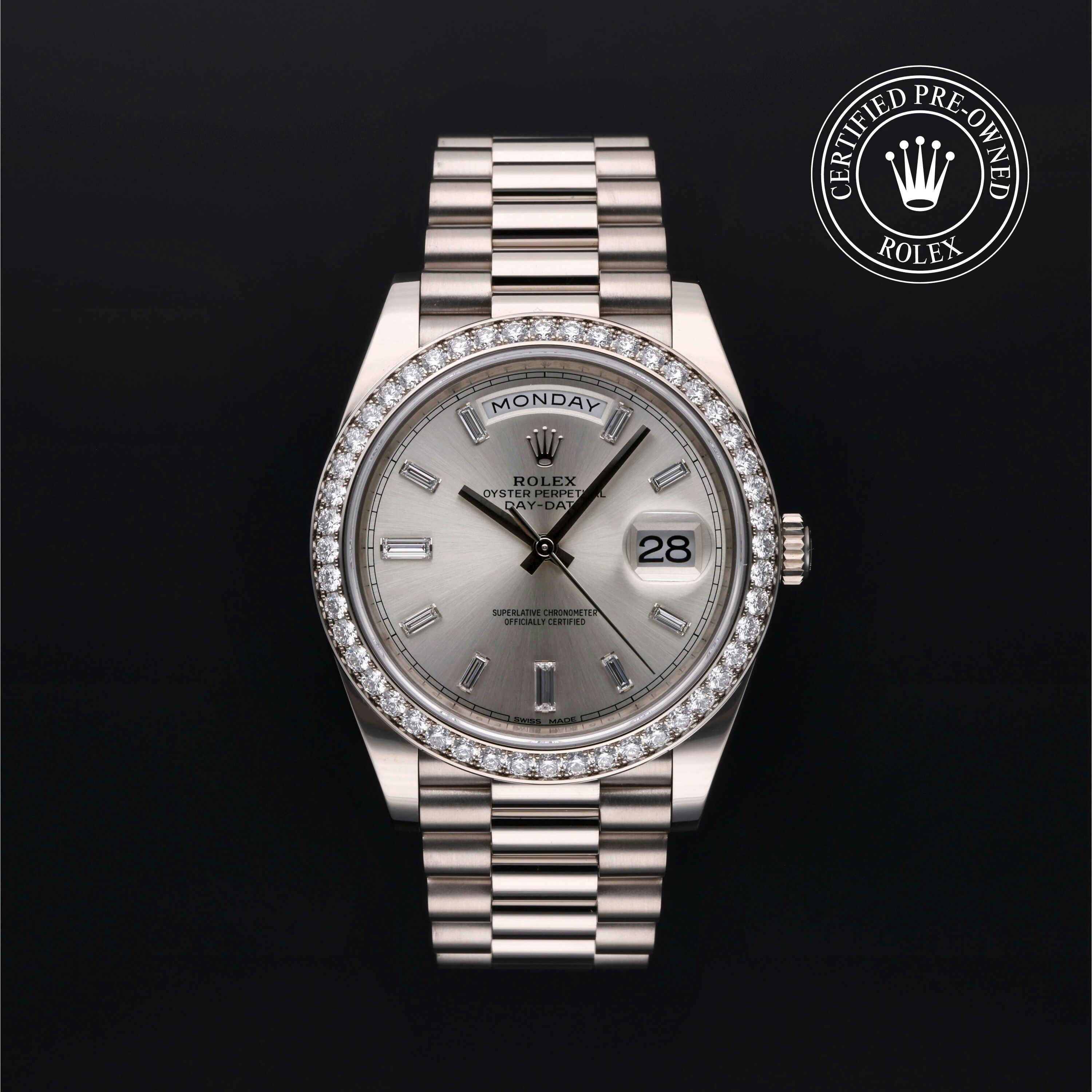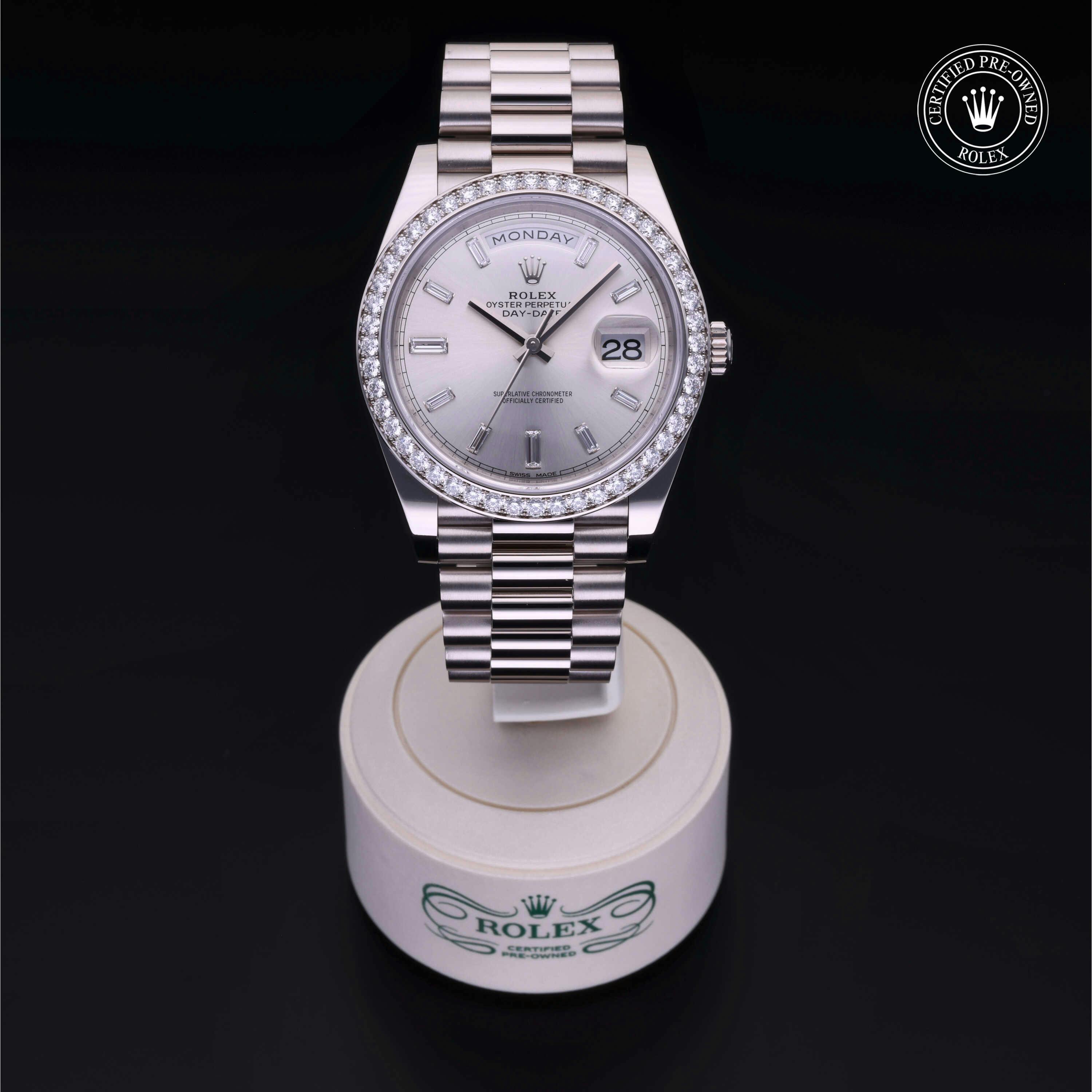 Rolex Certified Pre-Owned Day-Date (228349RBR) self - winding automatic watch, features a 40mm 18k white gold case with a diamond set bezel surrounding a silver diamond set dial on an 18k white gold president bracelet. Functions include hours, minutes, seconds, date and day. This watch has received Rolex-authorized service and certification. It comes with the original papers, and includes a custom Rolex Certified Pre-Owned hang tag, travel pouch and RCPO international warranty card.