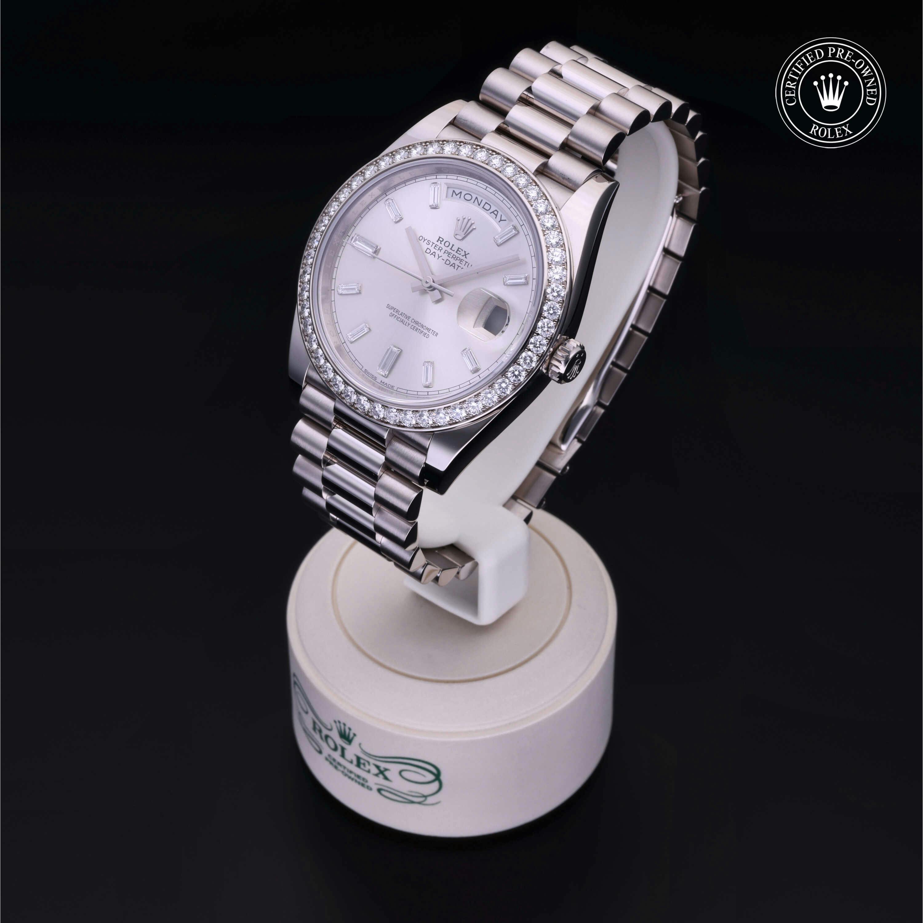 Rolex Certified Pre-Owned Day-Date (228349RBR) self - winding automatic watch, features a 40mm 18k white gold case with a diamond set bezel surrounding a silver diamond set dial on an 18k white gold president bracelet. Functions include hours, minutes, seconds, date and day. This watch has received Rolex-authorized service and certification. It comes with the original papers, and includes a custom Rolex Certified Pre-Owned hang tag, travel pouch and RCPO international warranty card.
