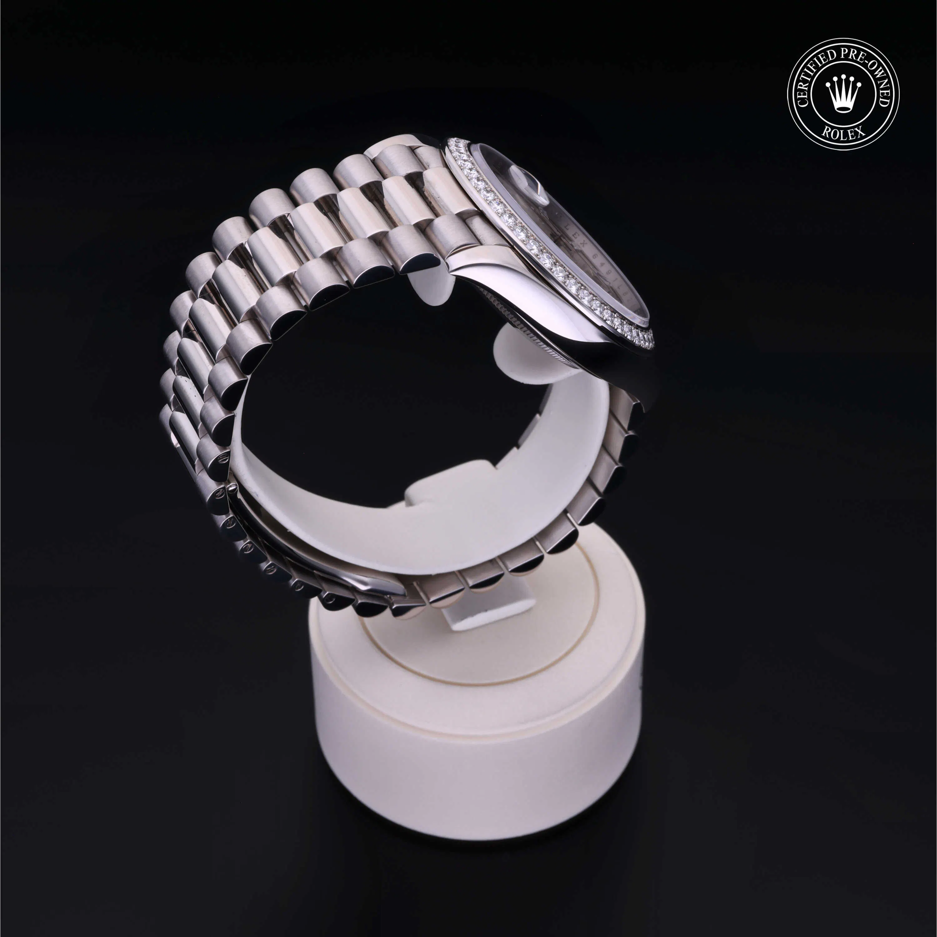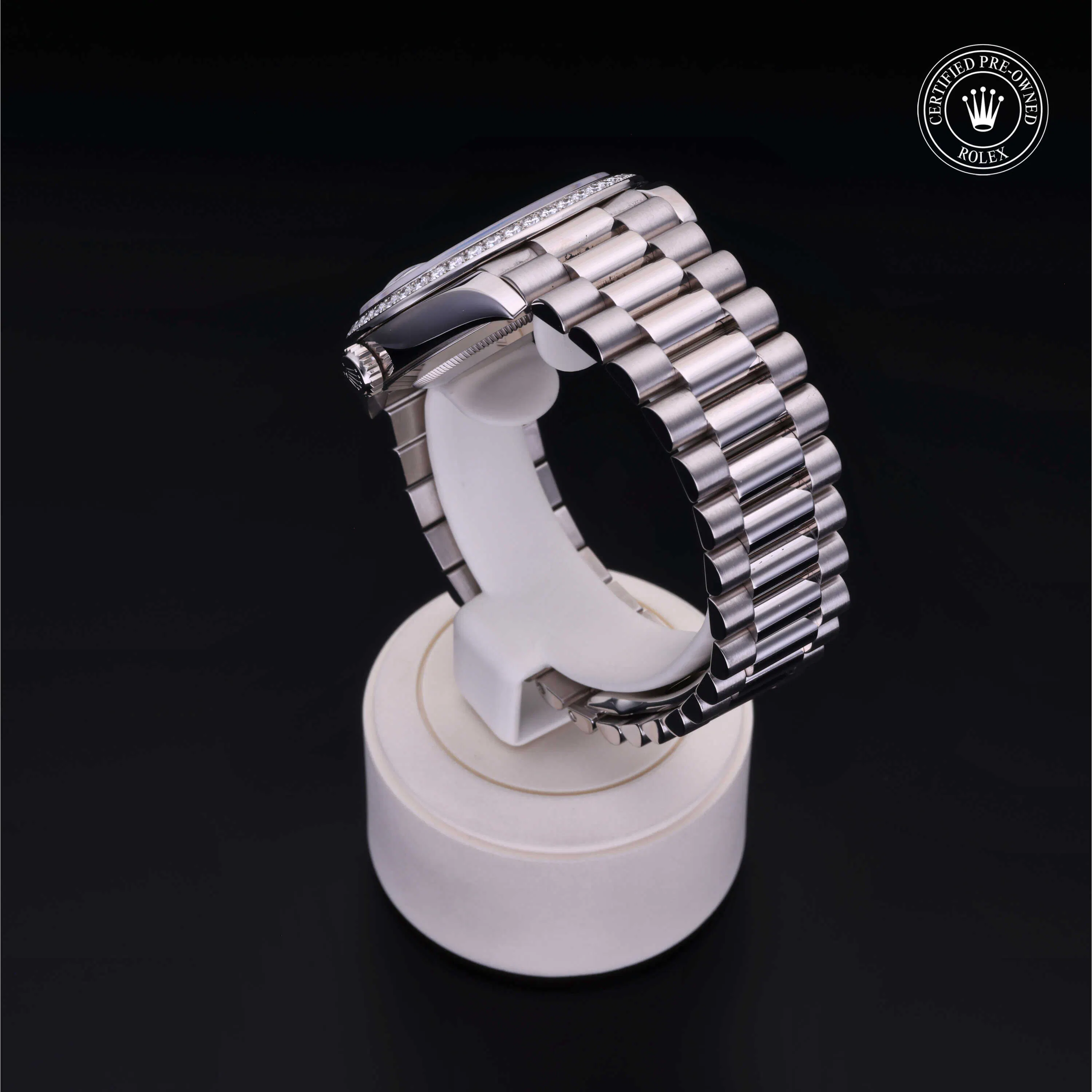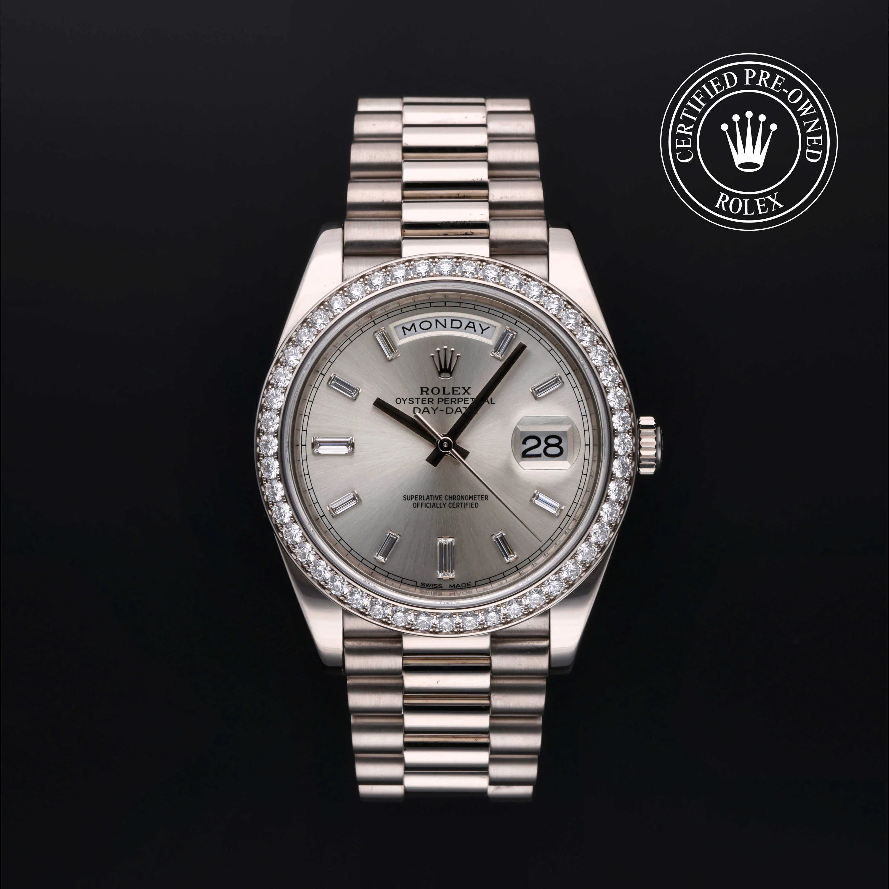 Rolex Certified Pre-Owned Day-Date (228349RBR) self - winding automatic watch, features a 40mm 18k white gold case and diamond set bezel surrounding a silver diamond set dial on an 18k white gold president bracelet. Functions include hours, minutes, seconds, date and day. This watch has received Rolex-authorized service and certification. It comes with the original box and papers, and includes a custom Rolex Certified Pre-Owned hang tag, travel pouch and RCPO international warranty card.