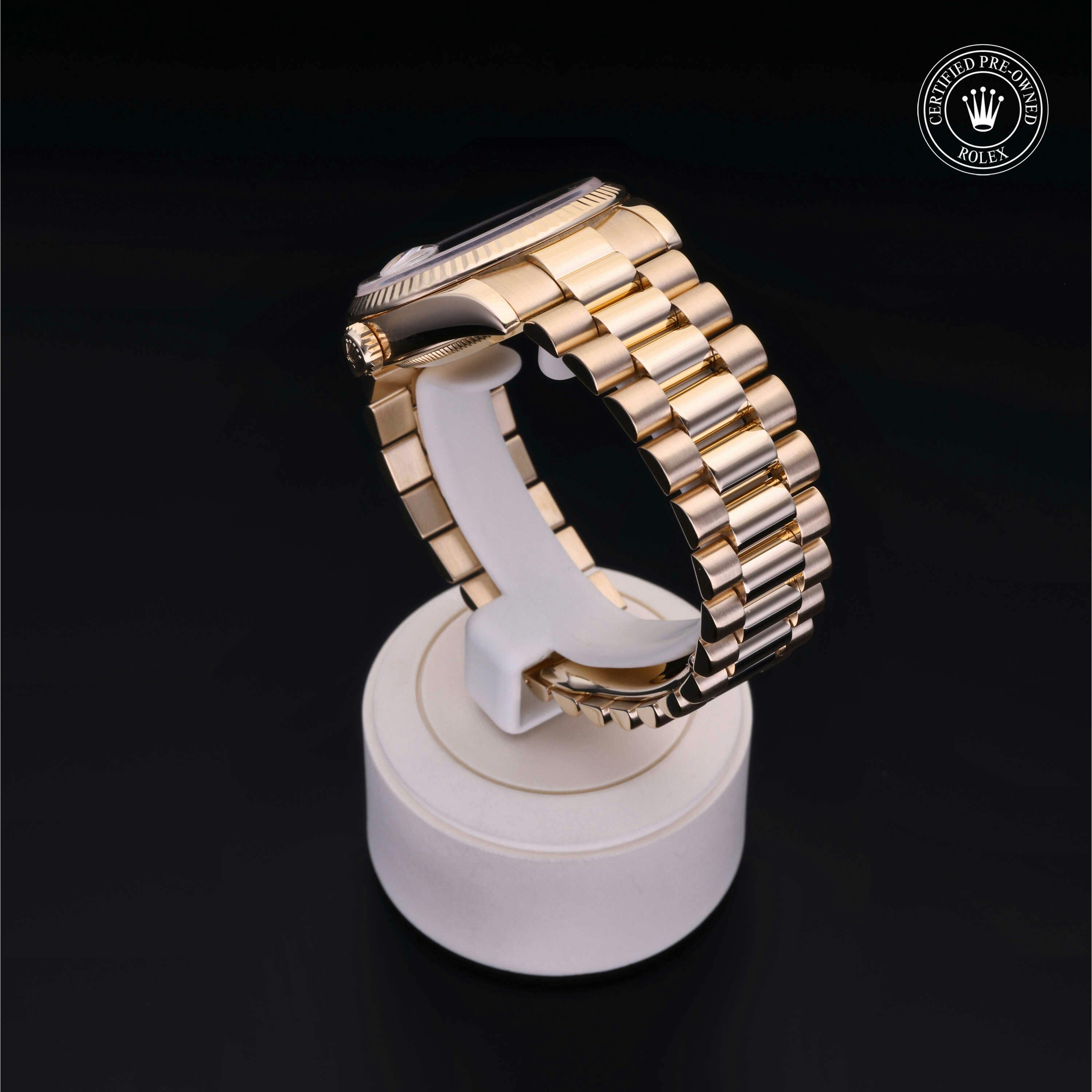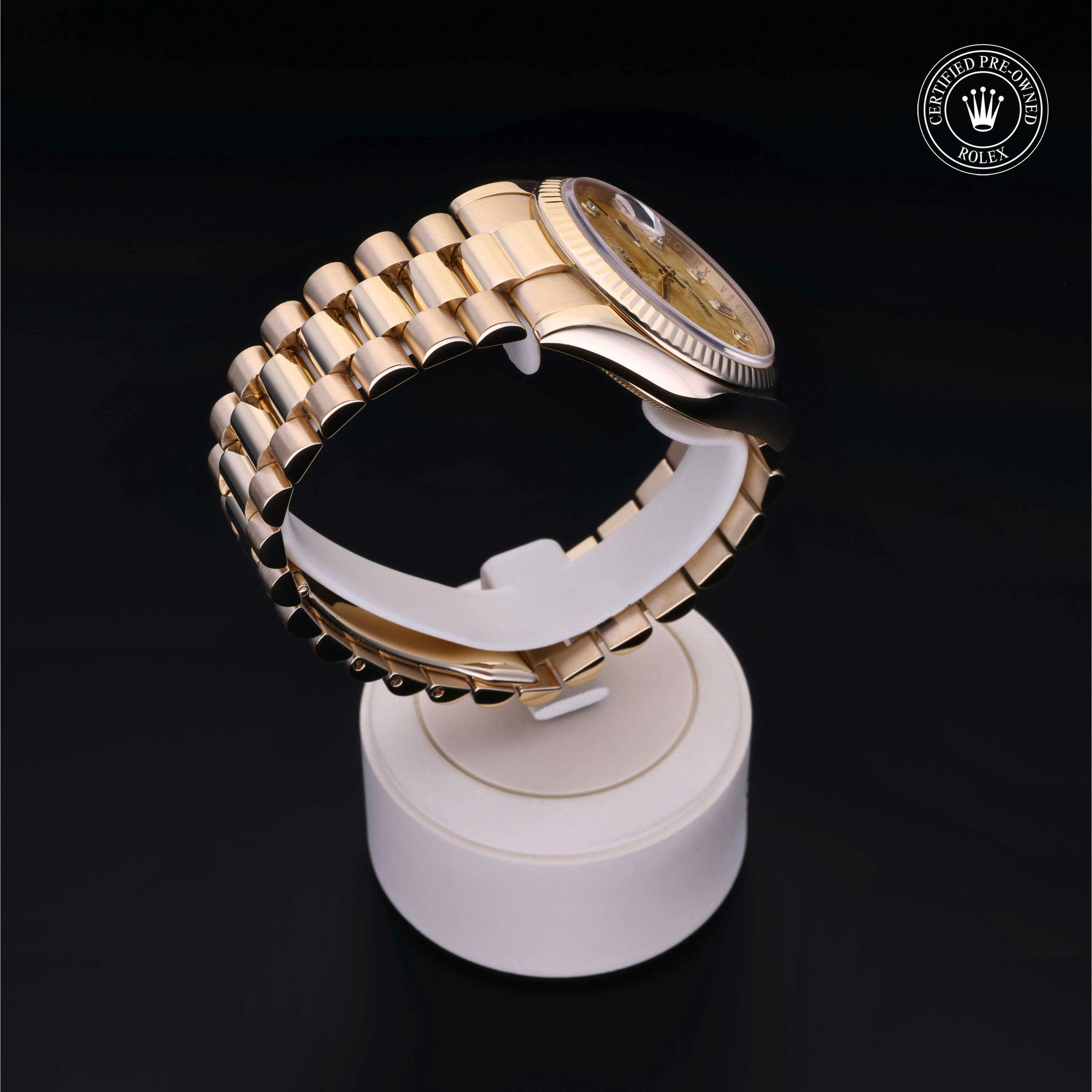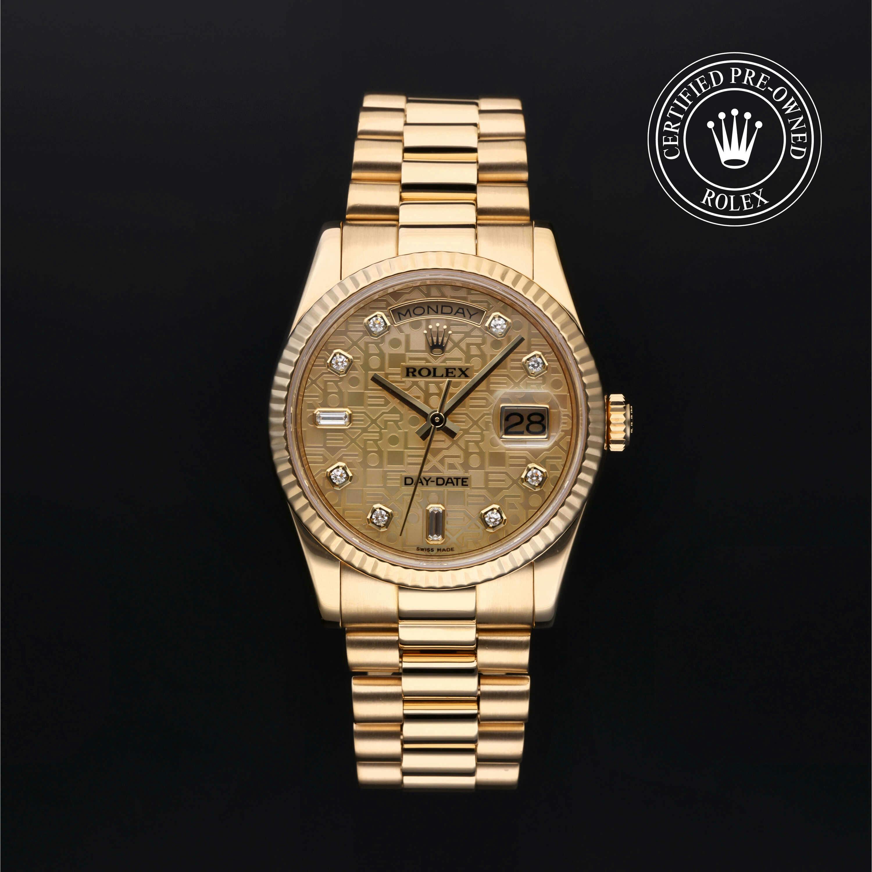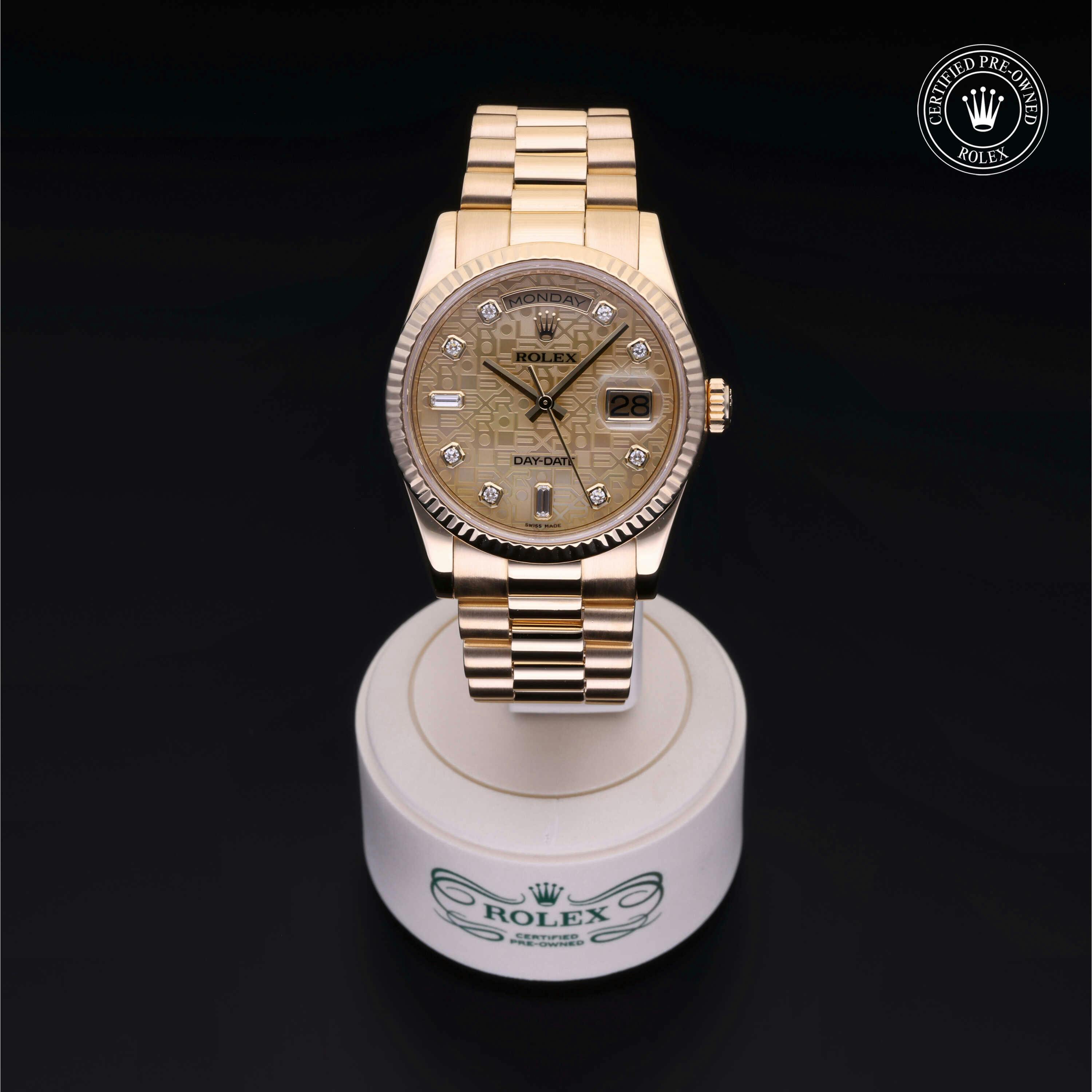Rolex Certified Pre-Owned Day-Date (118238) self - winding automatic watch, features a 36mm 18k yellow gold case and fluted bezel surrounding a gold, mother of pearl diamond set Jubilee dial on an 18k yellow gold president bracelet. Functions include hours, minutes, seconds, date and day. This watch has received Rolex-authorized service and certification. It comes with the original papers, and includes a custom Rolex Certified Pre-Owned hang tag, travel pouch and RCPO international warranty card.