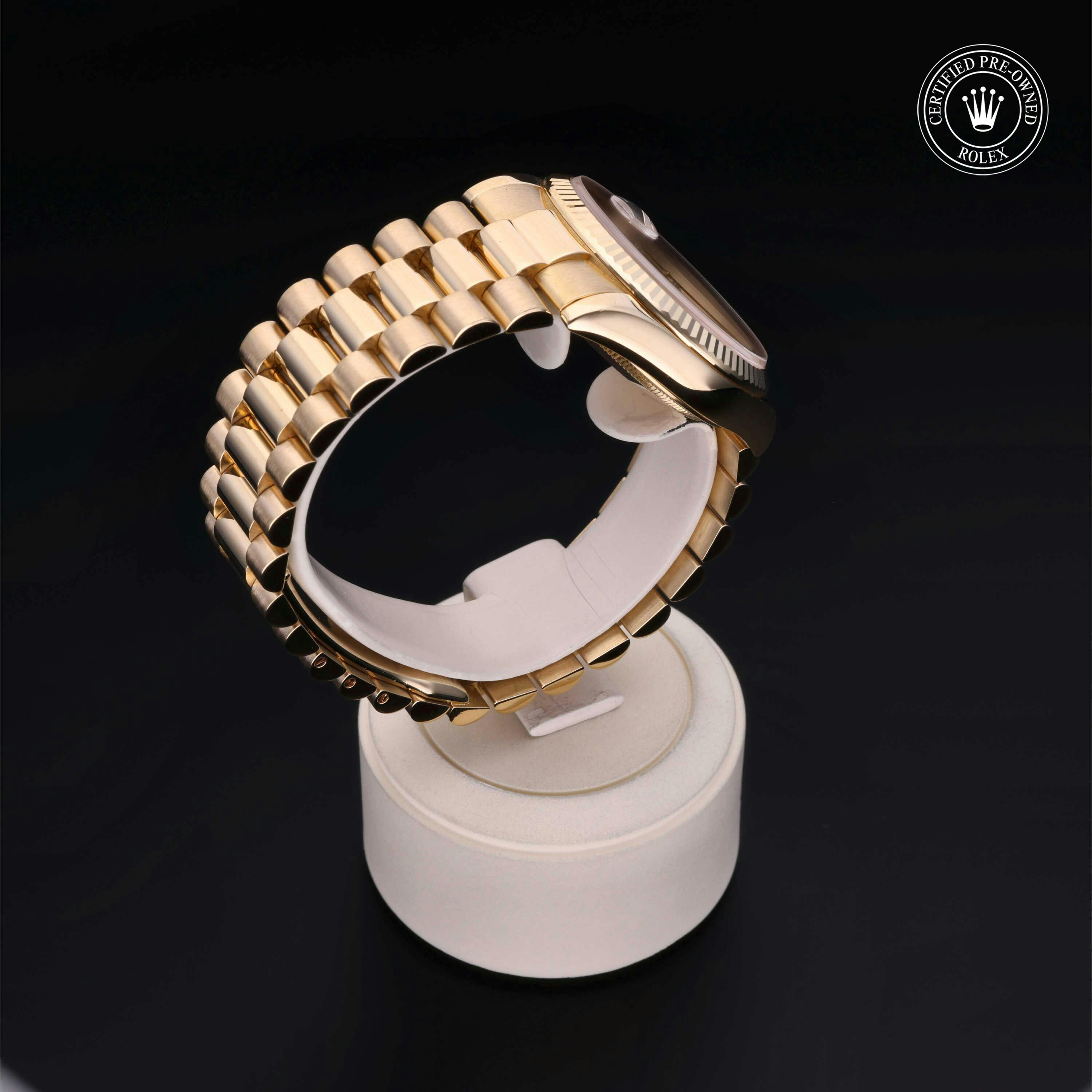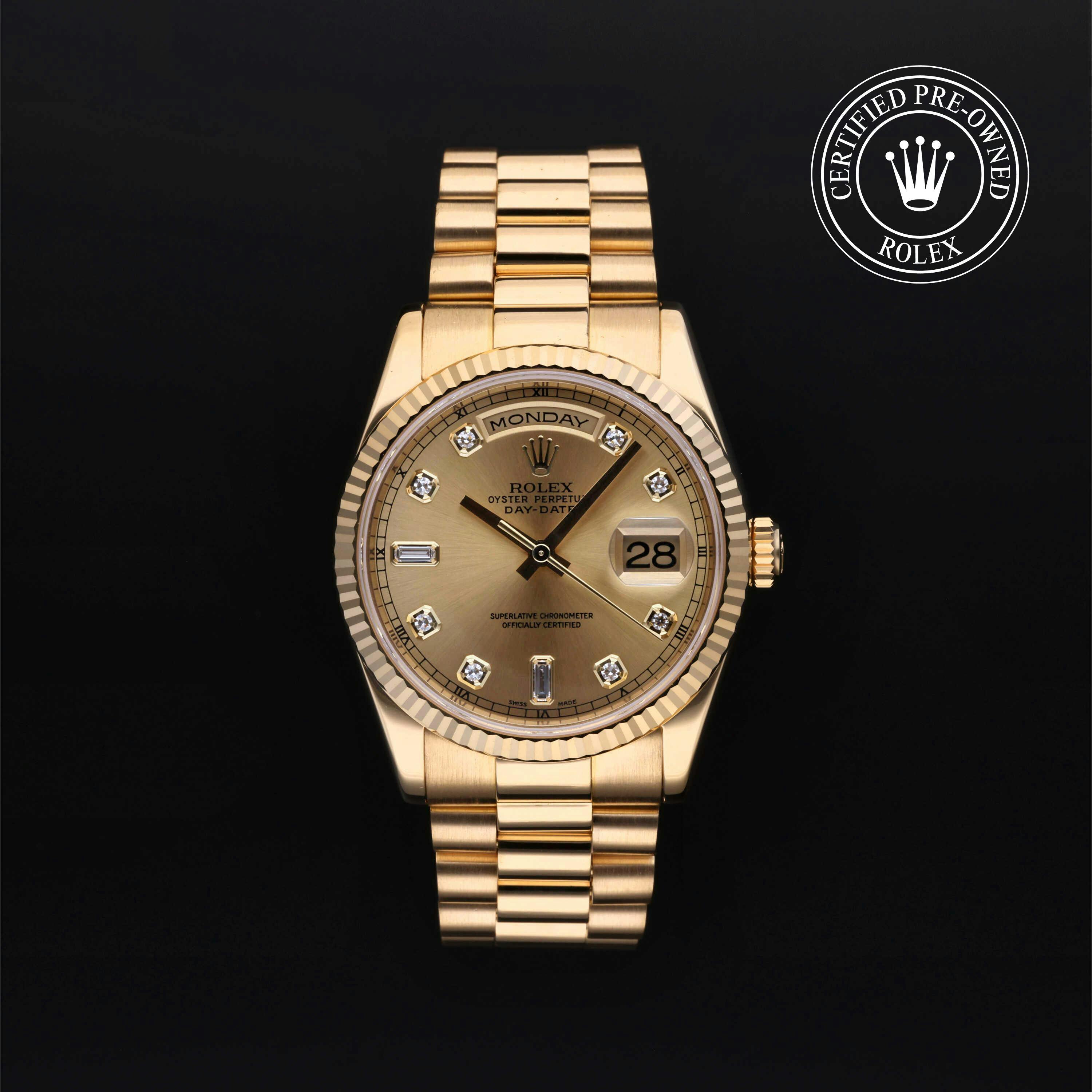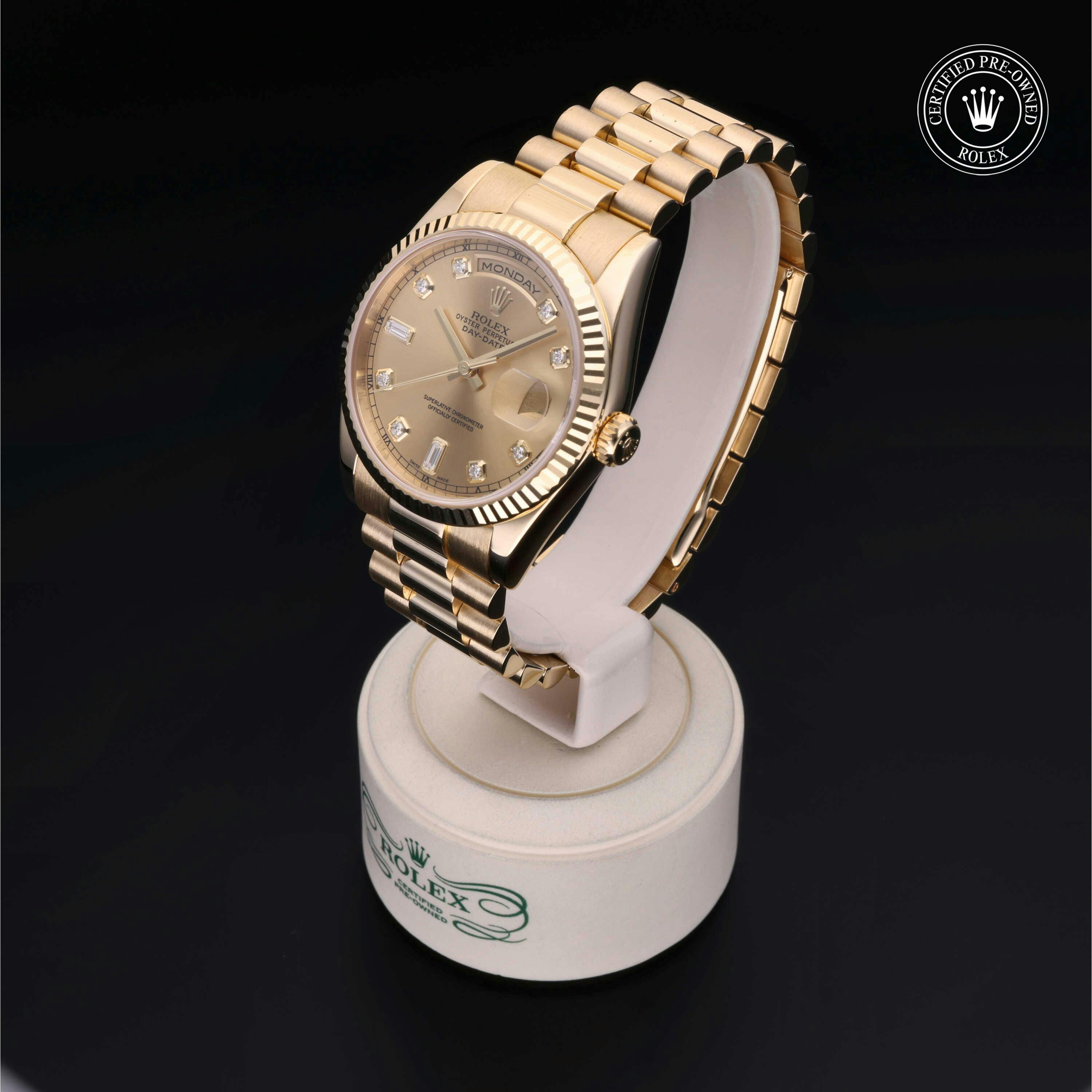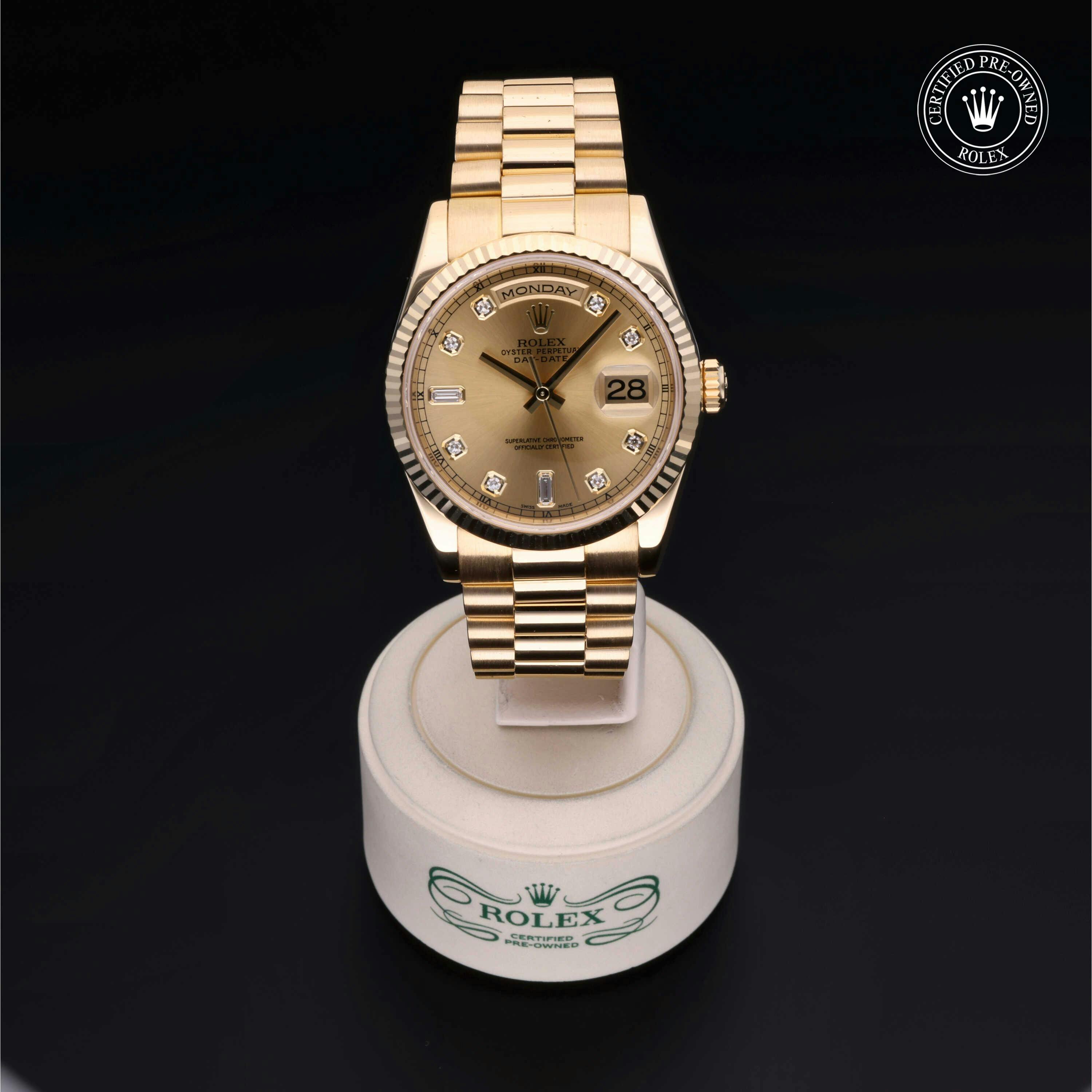 Rolex Certified Pre-Owned Day-Date (118238) self - winding automatic watch, features a 36mm 18k yellow gold case and fluted bezel surrounding a champagne diamond set dial on an 18k yellow gold president bracelet. Functions include hours, minutes, seconds, date and day. This watch has received Rolex-authorized service and certification. It does not come with the original box or papers, but includes a custom Rolex Certified Pre-Owned hang tag, travel pouch and RCPO international warranty card.