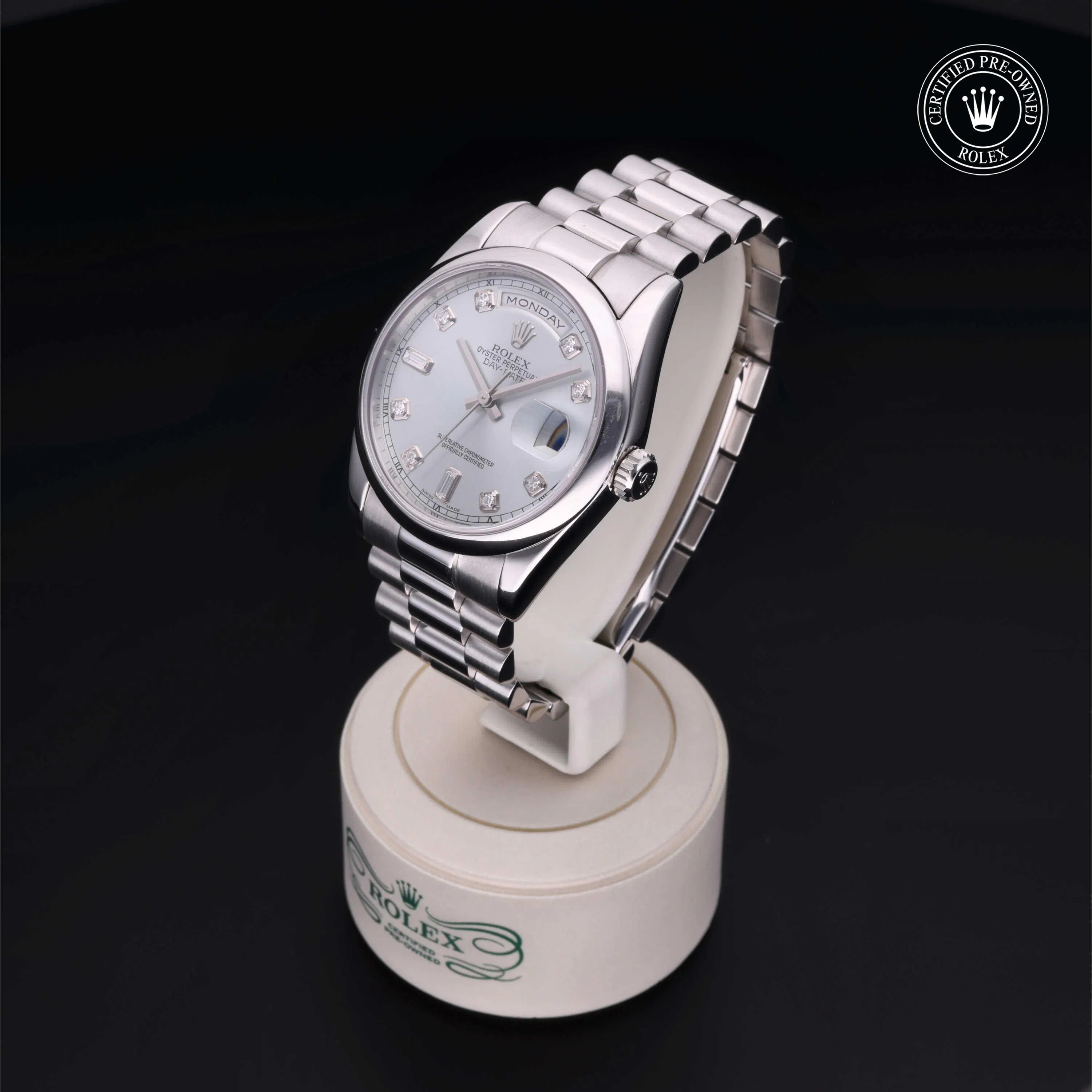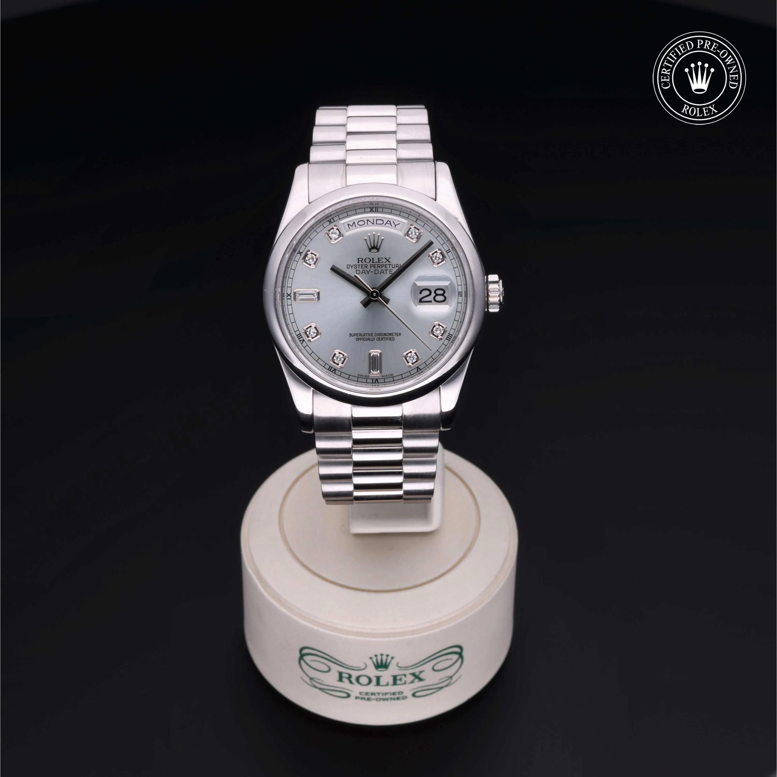 Rolex Certified Pre-Owned Day-Date (118206) self - winding automatic watch, features a 36mm platinum case and domed bezel surrounding an ice blue diamond set dial. The watch is secured on a platinum President bracelet complete with a folding buckle. Functions include hours, minutes, seconds, date and day. This watch has received Rolex-authorized service and certification. It comes with the original box, and includes a custom Rolex Certified Pre-Owned hang tag, travel pouch and RCPO international warranty card.