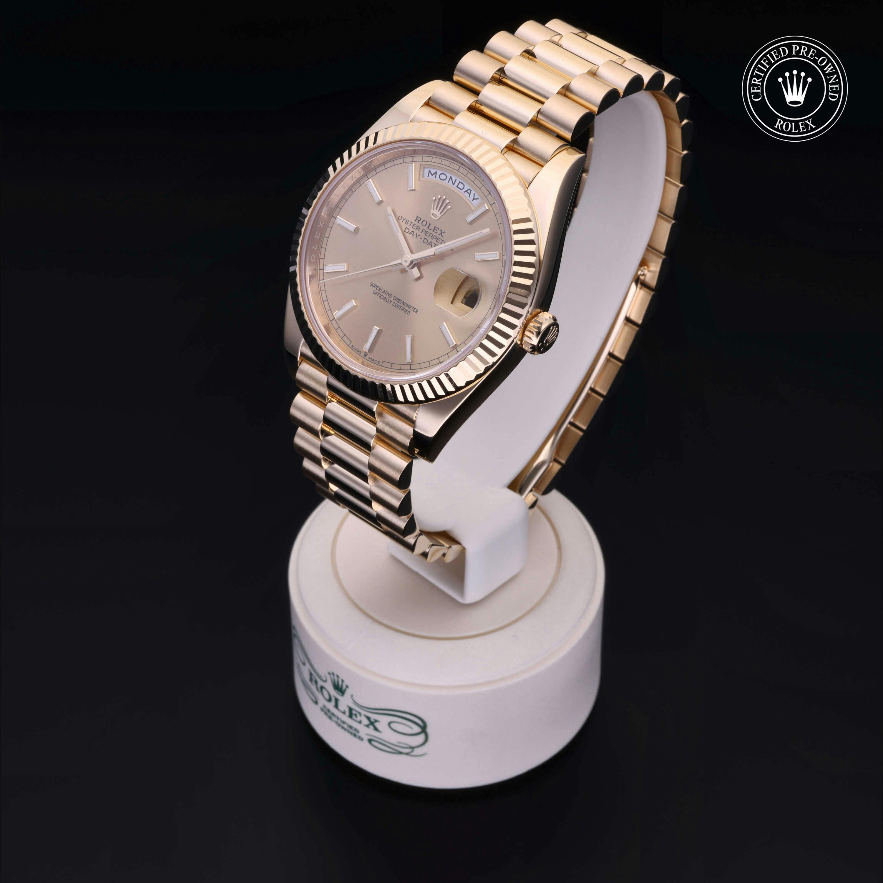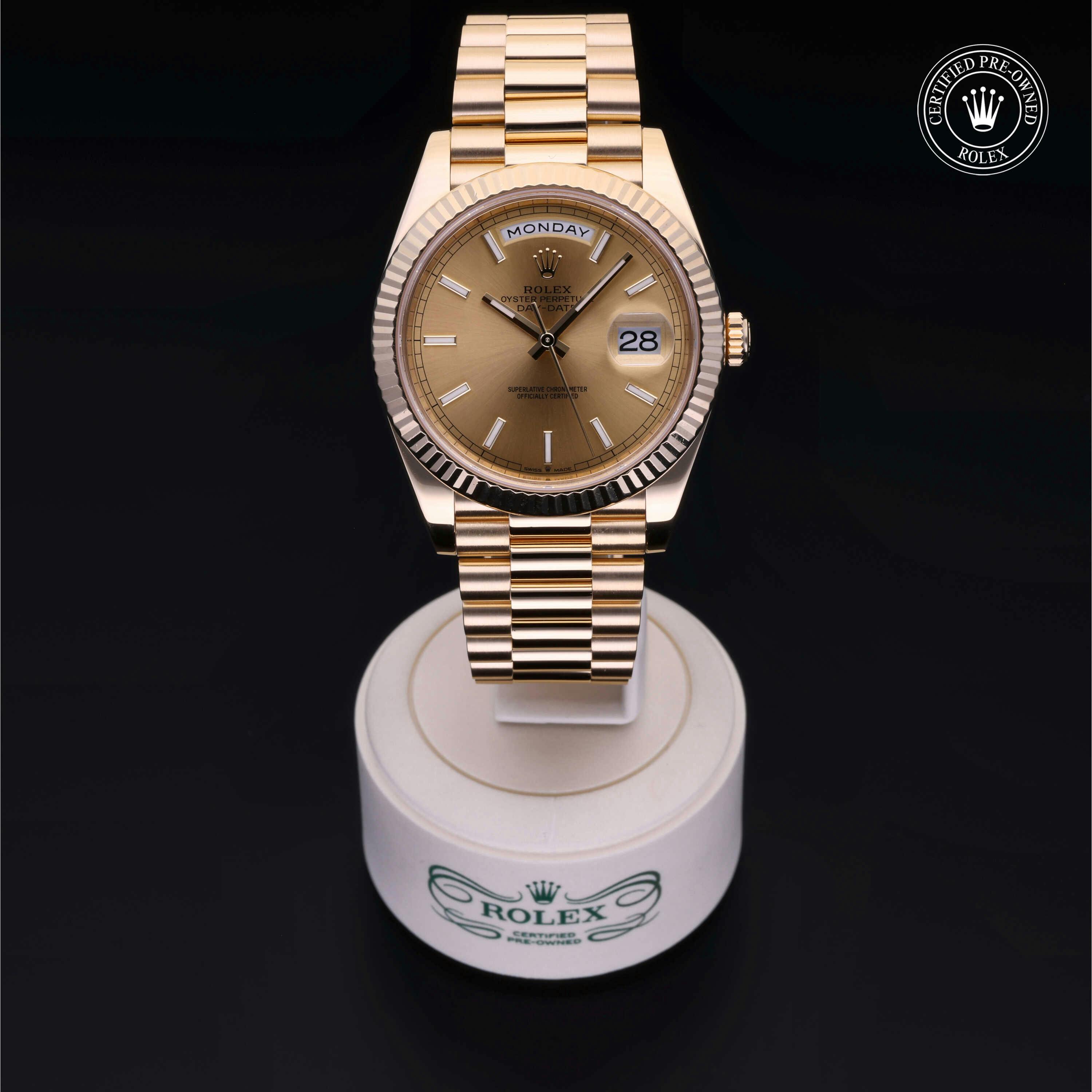 Rolex Certified Pre-Owned Day-Date (228238) self - winding automatic watch, features a 40mm 18k yellow gold case and fluted bezel surrounding a champagne dial on an 18k yellow gold president bracelet. Functions include hours, minutes, seconds, date and day. This watch has received Rolex-authorized service and certification. It comes with the original box, and includes a custom Rolex Certified Pre-Owned hang tag, travel pouch and RCPO international warranty card.