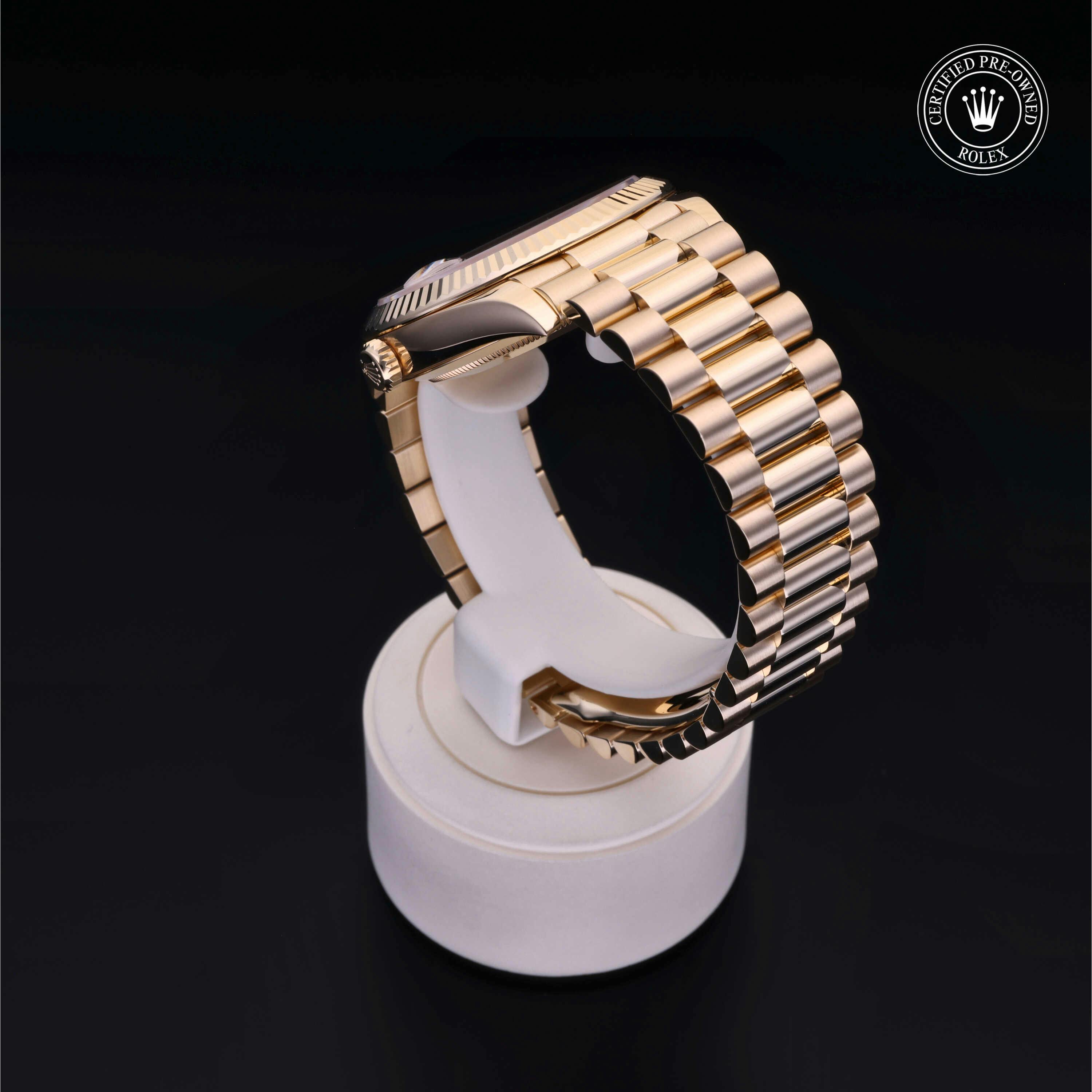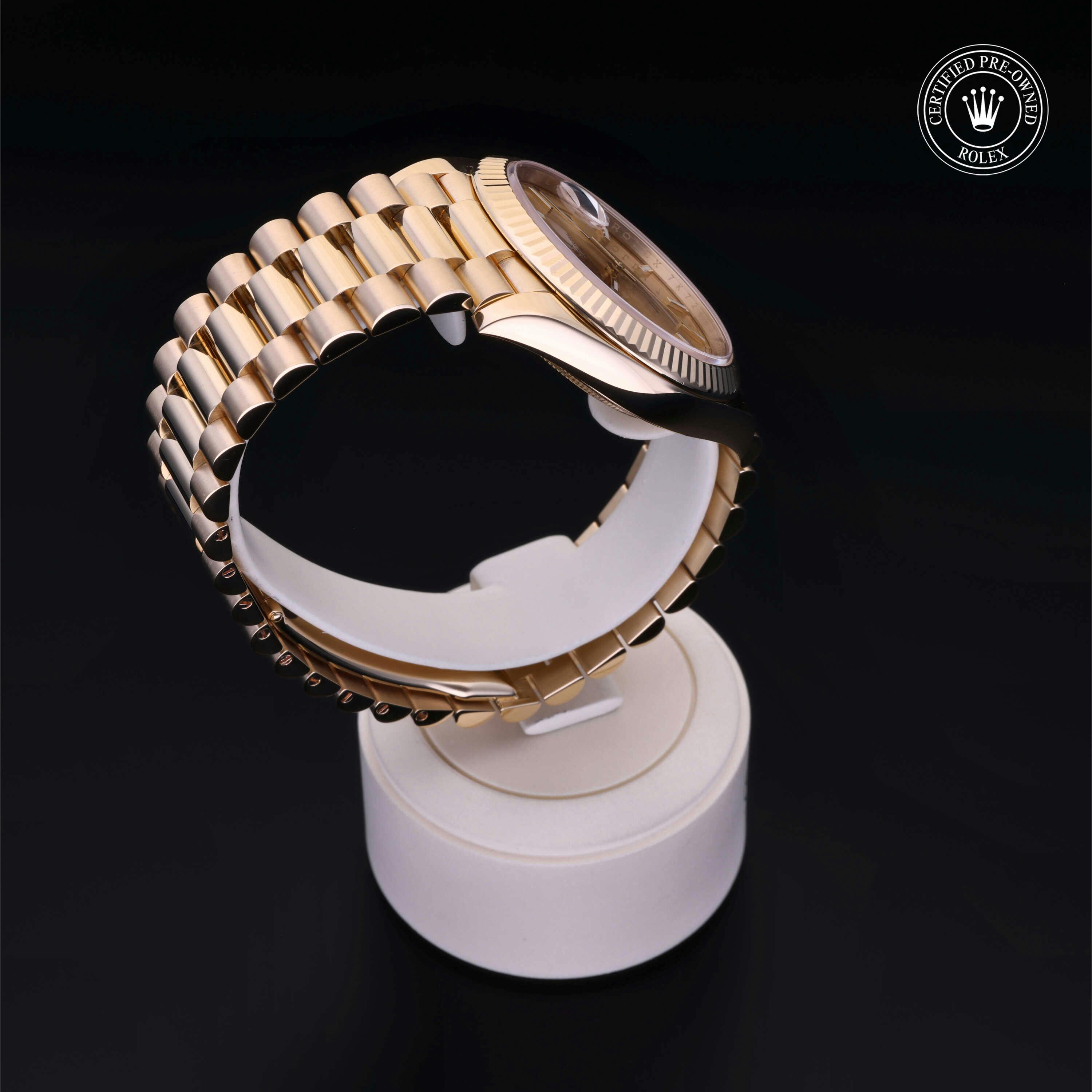 Rolex Certified Pre-Owned Day-Date (228238) self - winding automatic watch, features a 40mm 18k yellow gold case and fluted bezel surrounding a champagne dial on an 18k yellow gold president bracelet. Functions include hours, minutes, seconds, date and day. This watch has received Rolex-authorized service and certification. It comes with the original box, and includes a custom Rolex Certified Pre-Owned hang tag, travel pouch and RCPO international warranty card.