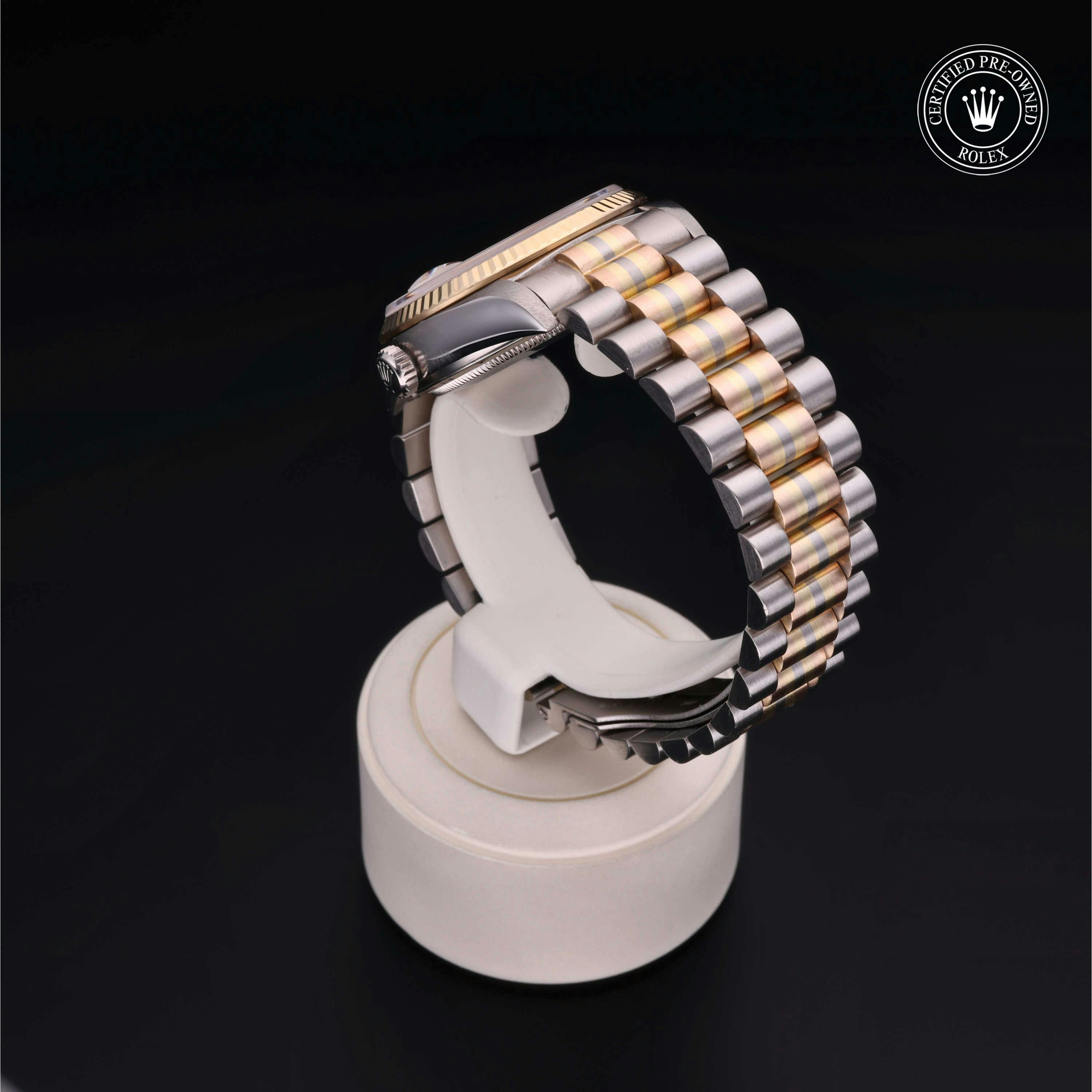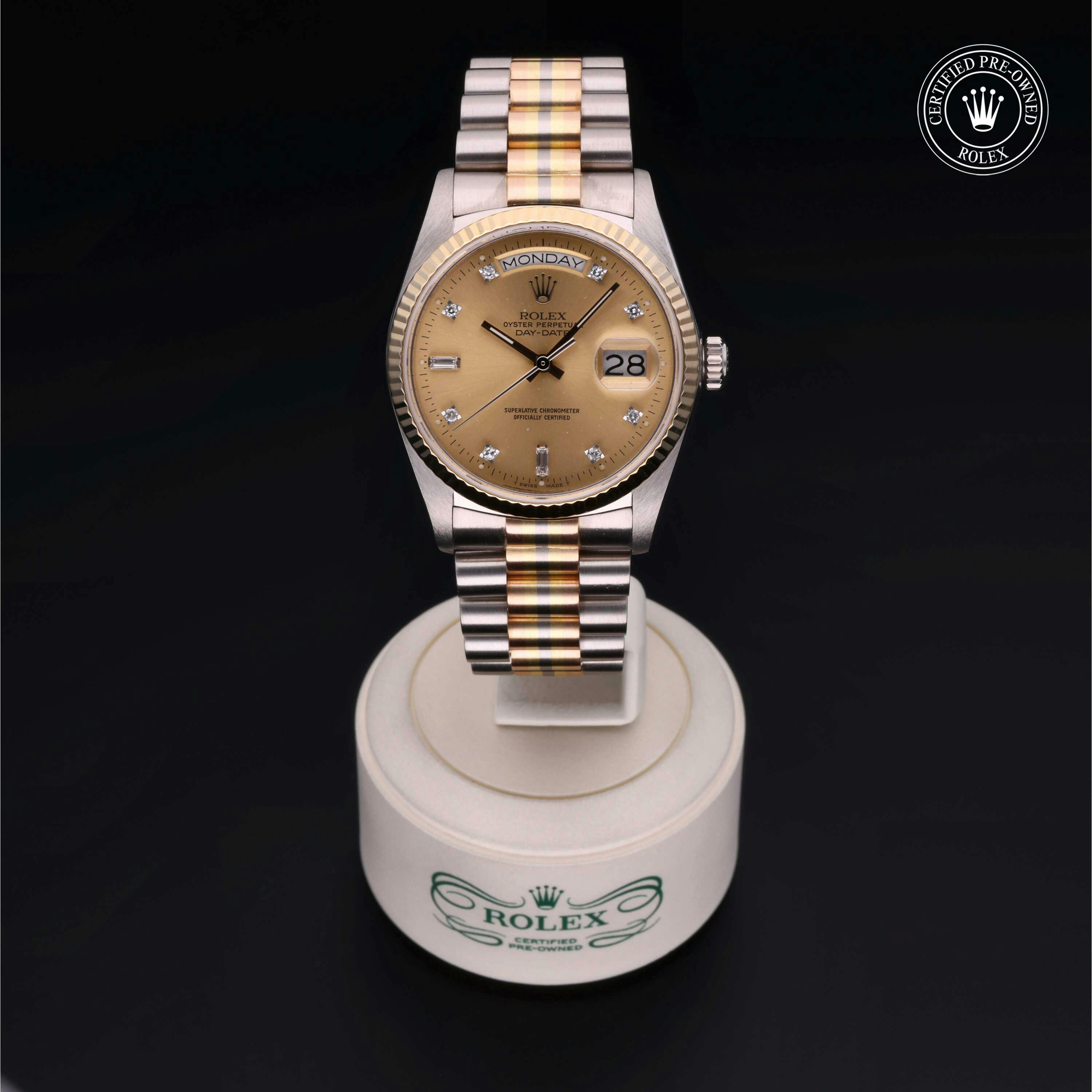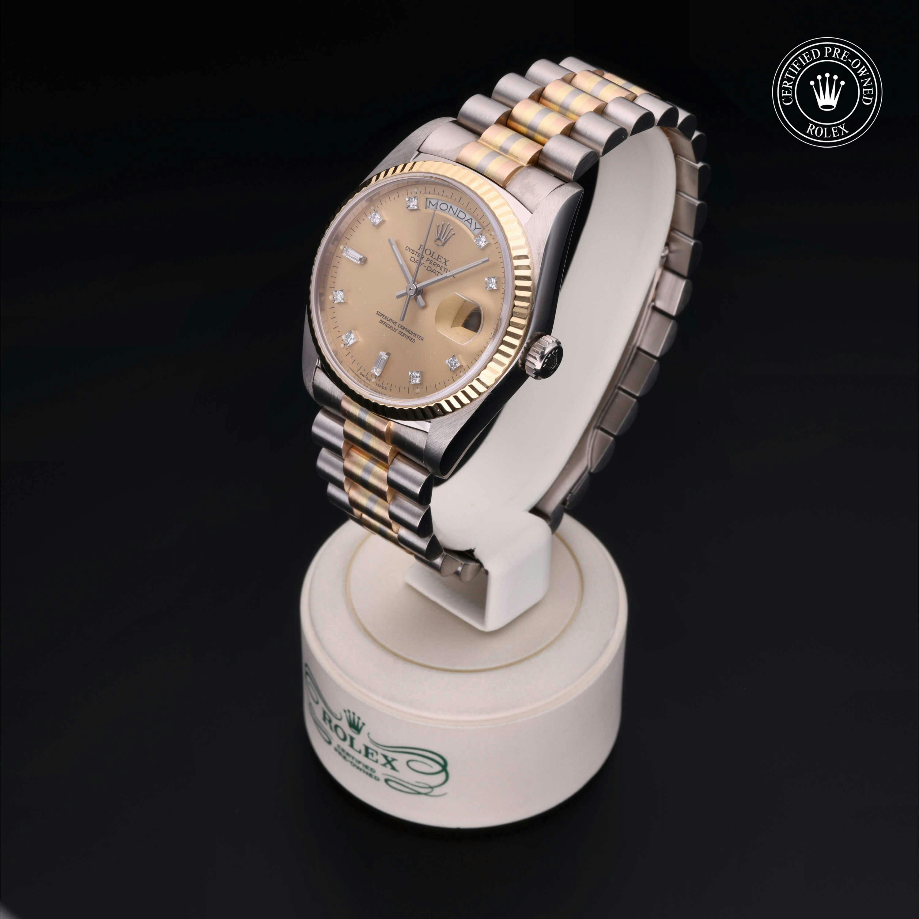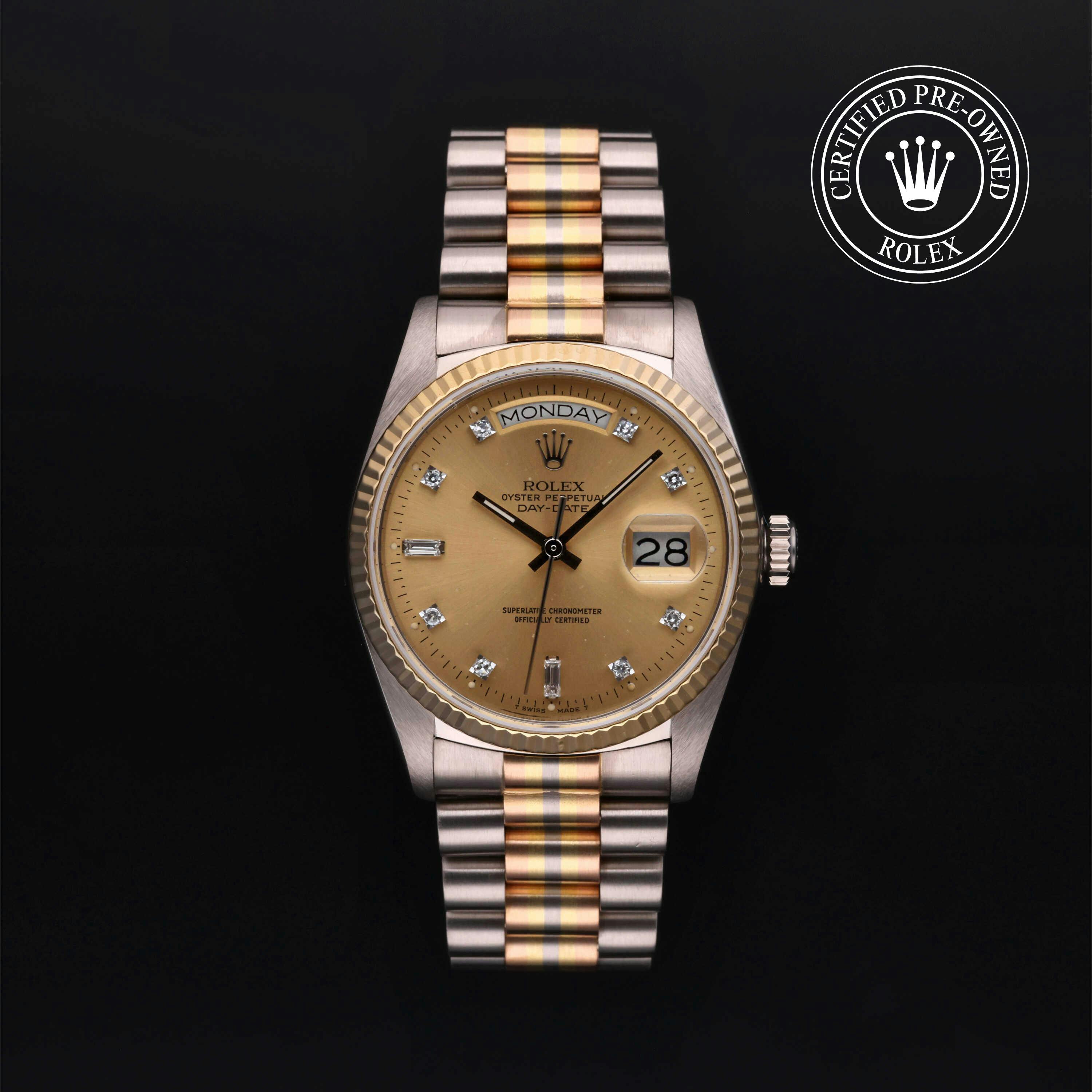 Rolex Certified Pre-Owned Day-Date Tridor (18039BIC) self - winding automatic watch, features a 36mm 18k white gold case with an 18k yellow gold fluted bezel surrounding a champagne diamond set dial on an 18k white, yellow and rose gold president bracelet. Functions include hours, minutes, seconds, date and day. This watch has received Rolex-authorized service and certification. It does not come with the original box or papers, but includes a custom Rolex Certified Pre-Owned hang tag, travel pouch and RCPO international warranty card.