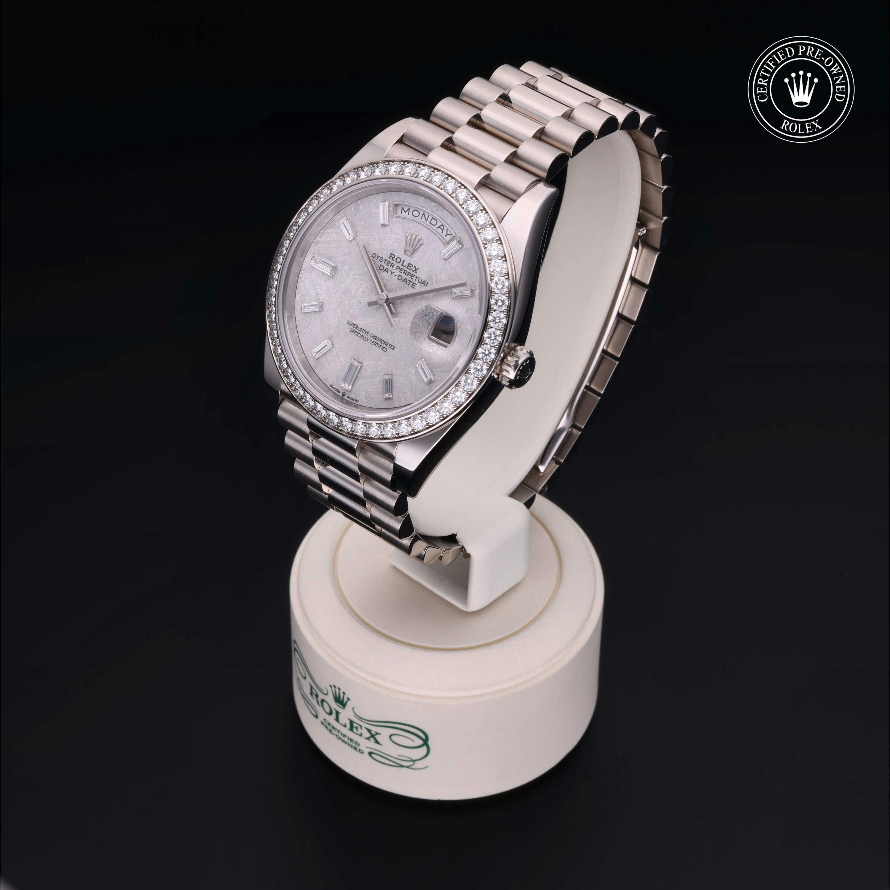 Rolex Certified Pre-Owned Day-Date (228349RBR) self - winding automatic watch, features a 40mm 18k white gold case with a diamond set bezel surrounding a meteorite diamond set dial on an 18k white gold president bracelet. Functions include hours, minutes, seconds, date and day. This watch has received Rolex-authorized service and certification. It comes with the original papers, and includes a custom Rolex Certified Pre-Owned hang tag, travel pouch and RCPO international warranty card.
