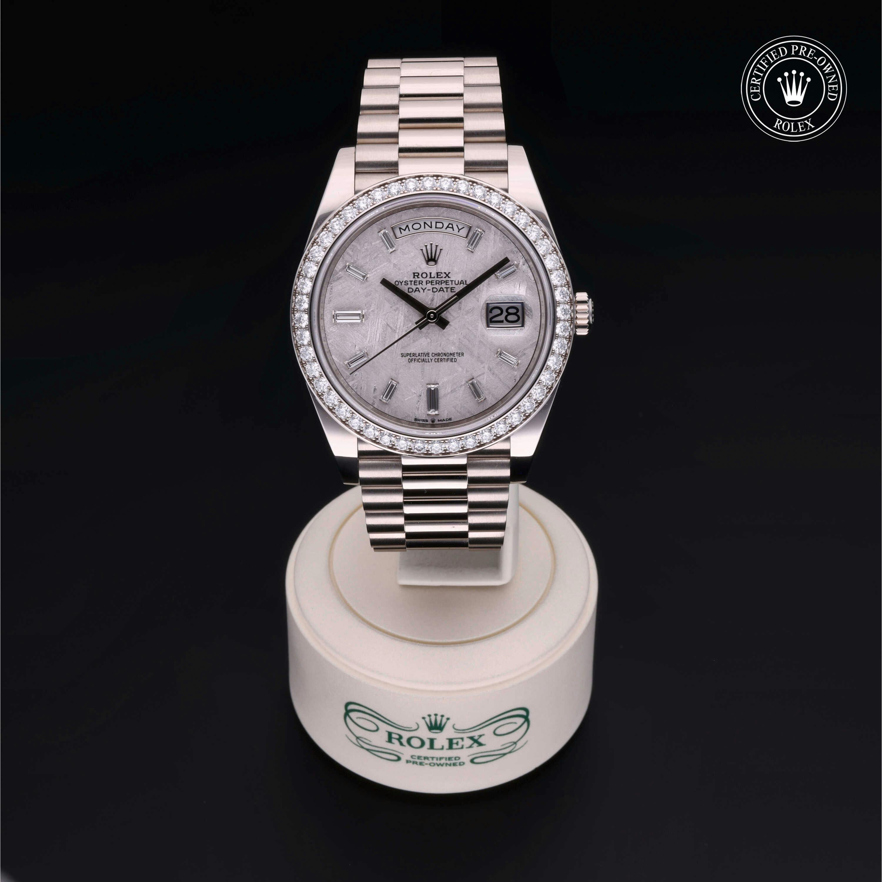 Rolex Certified Pre-Owned Day-Date (228349RBR) self - winding automatic watch, features a 40mm 18k white gold case with a diamond set bezel surrounding a meteorite diamond set dial on an 18k white gold president bracelet. Functions include hours, minutes, seconds, date and day. This watch has received Rolex-authorized service and certification. It comes with the original papers, and includes a custom Rolex Certified Pre-Owned hang tag, travel pouch and RCPO international warranty card.