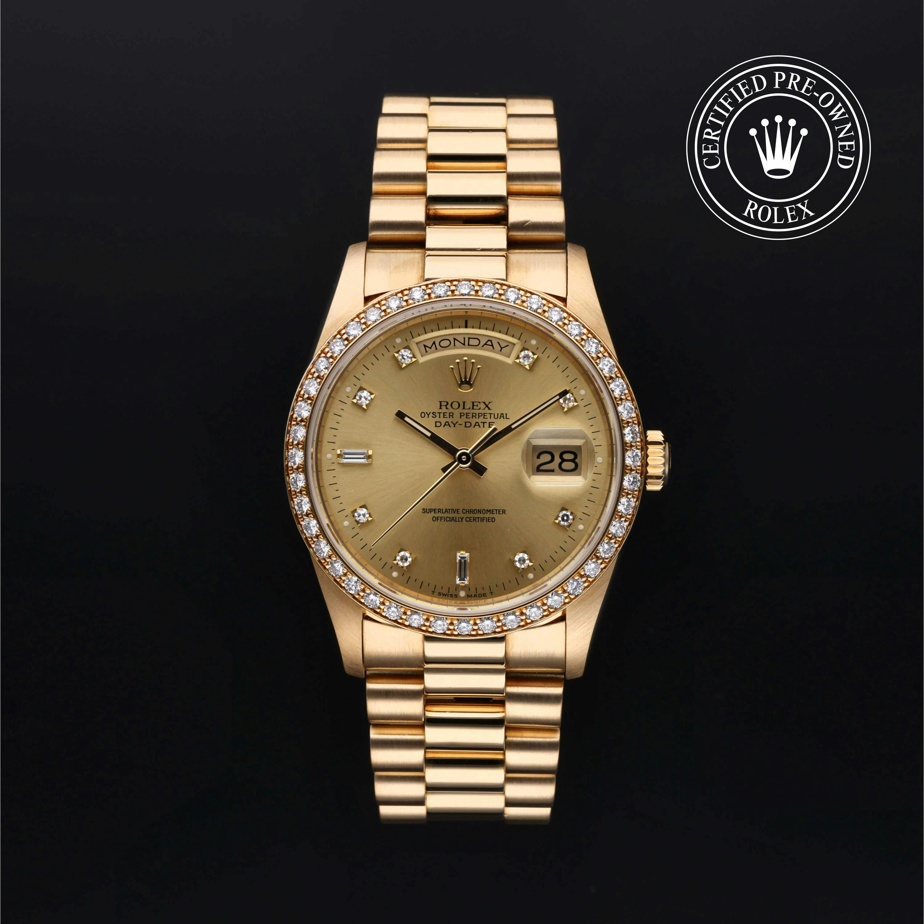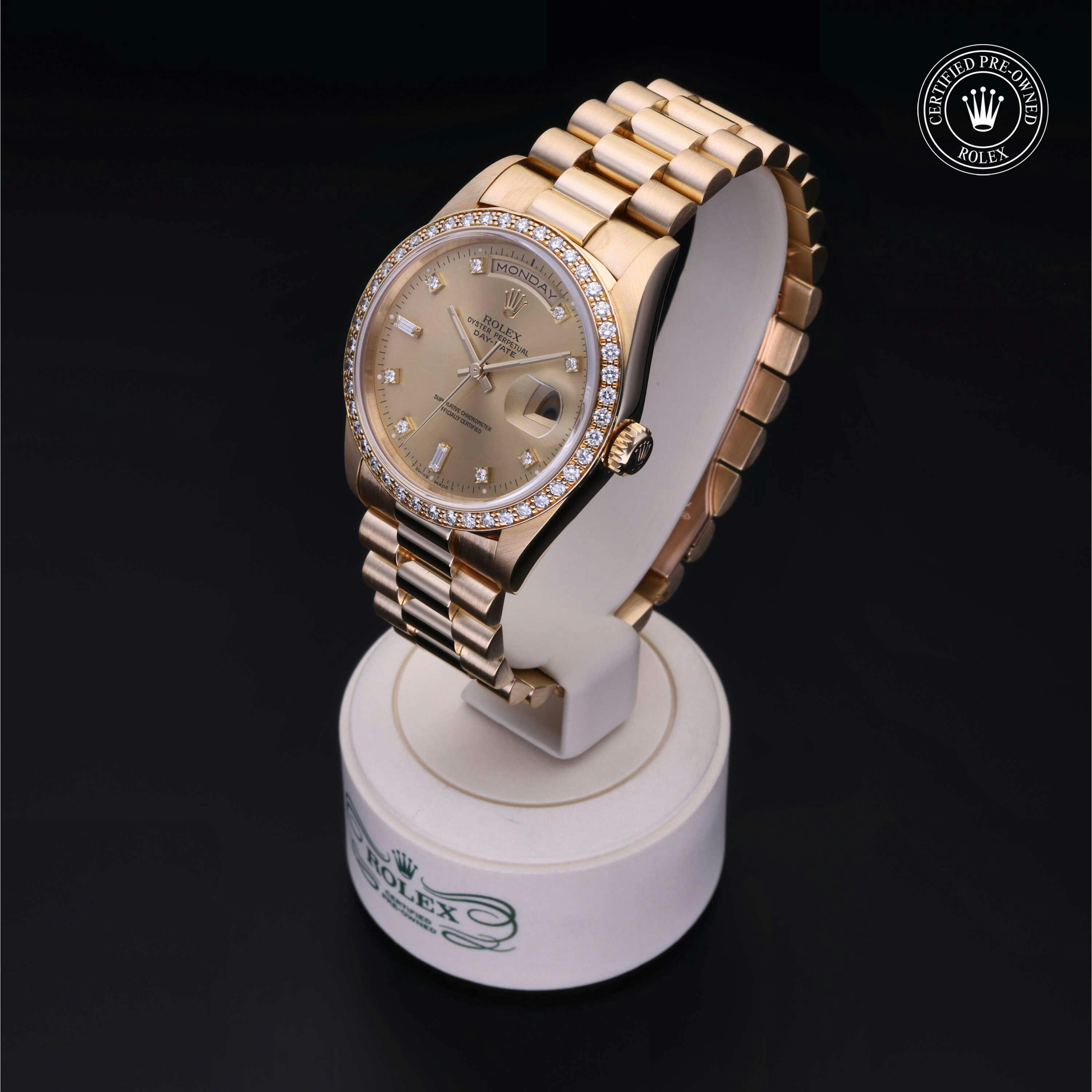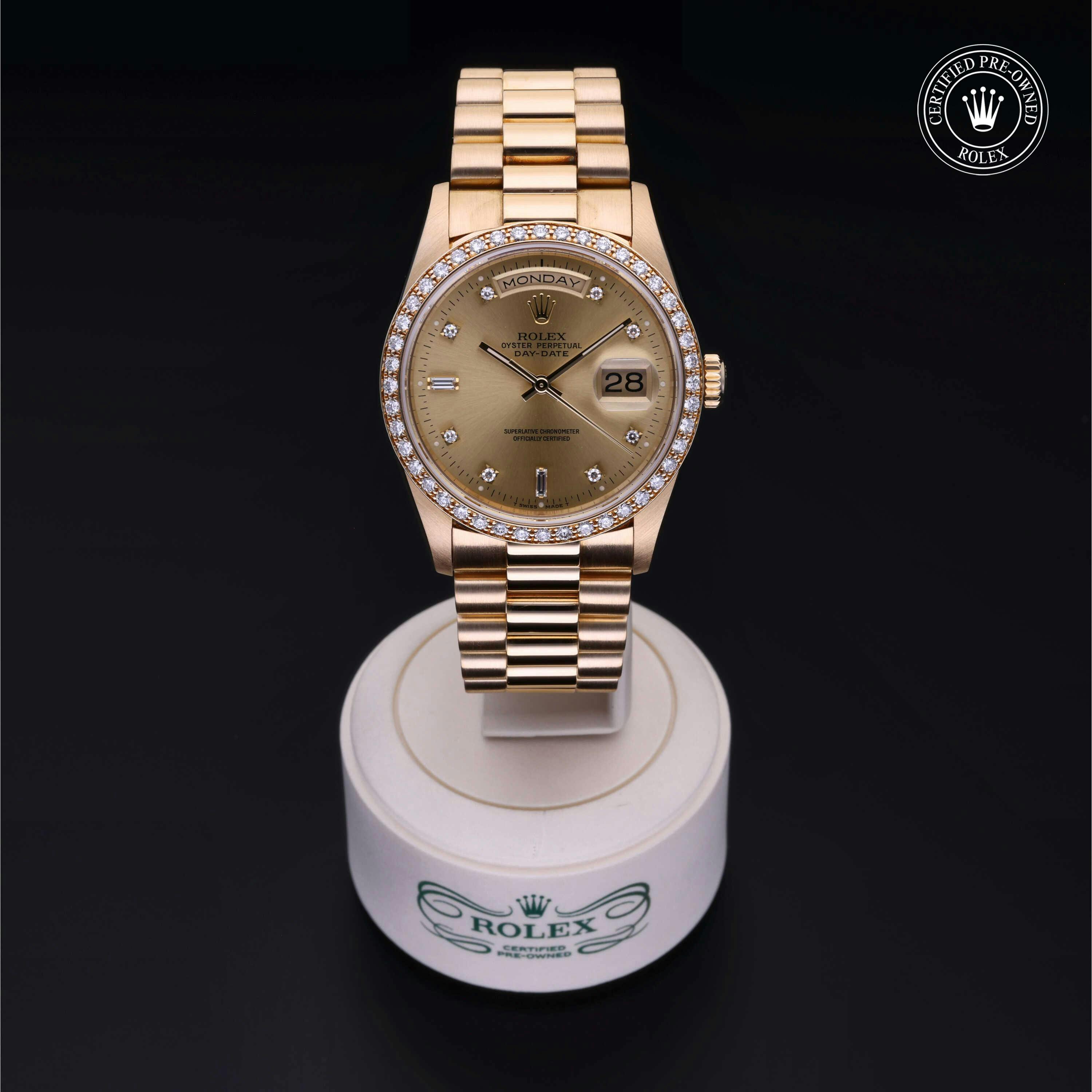 Rolex Certified Pre-Owned Day-Date (18348) self - winding automatic watch, features a 36mm 18k yellow gold case with a diamond set bezel surrounding a champagne diamond set dial on an 18k yellow gold president bracelet. Functions include hours, minutes, seconds, date and day. This watch has received Rolex-authorized service and certification. It does not come with the original box or papers, but includes a custom Rolex Certified Pre-Owned hang tag, travel pouch and RCPO international warranty card.