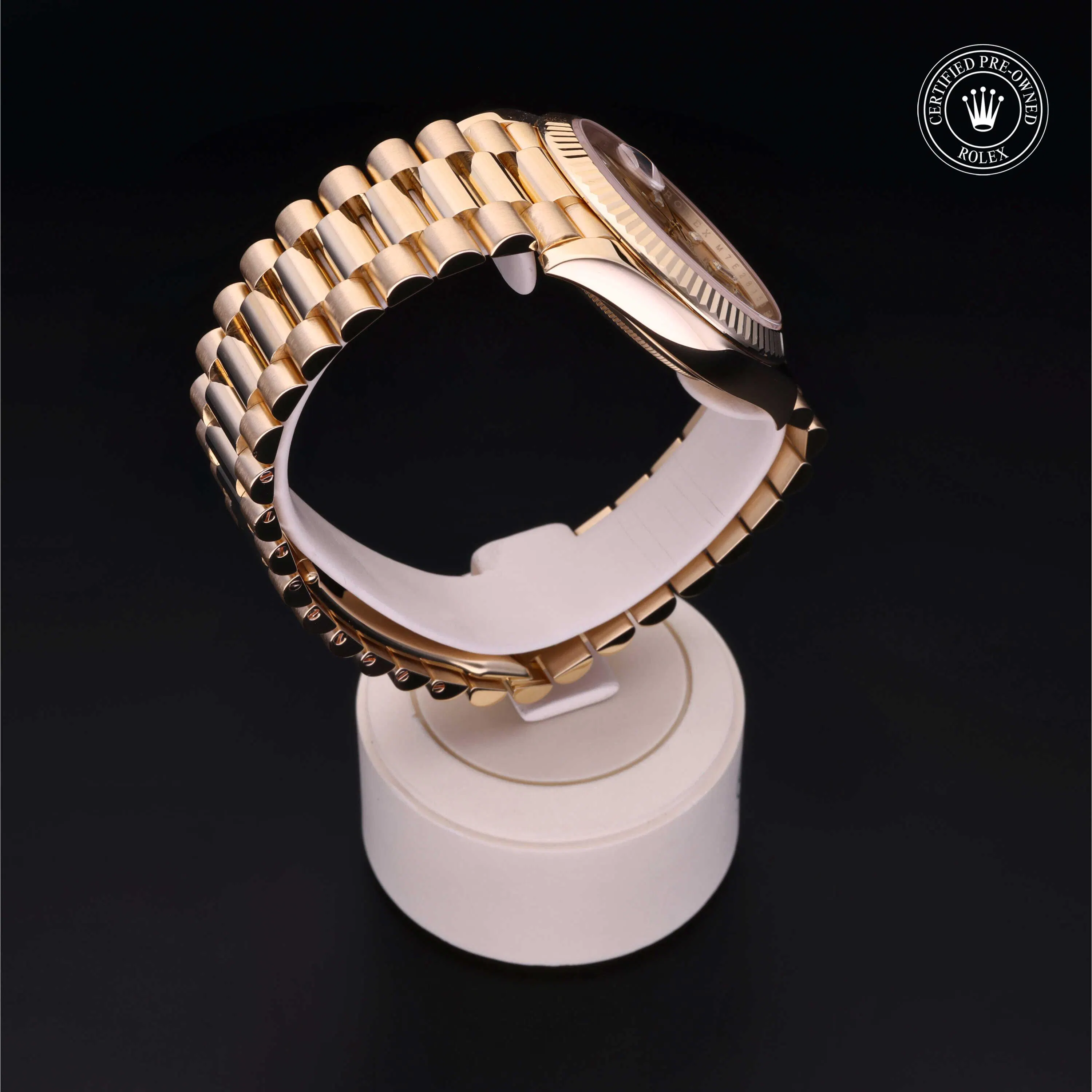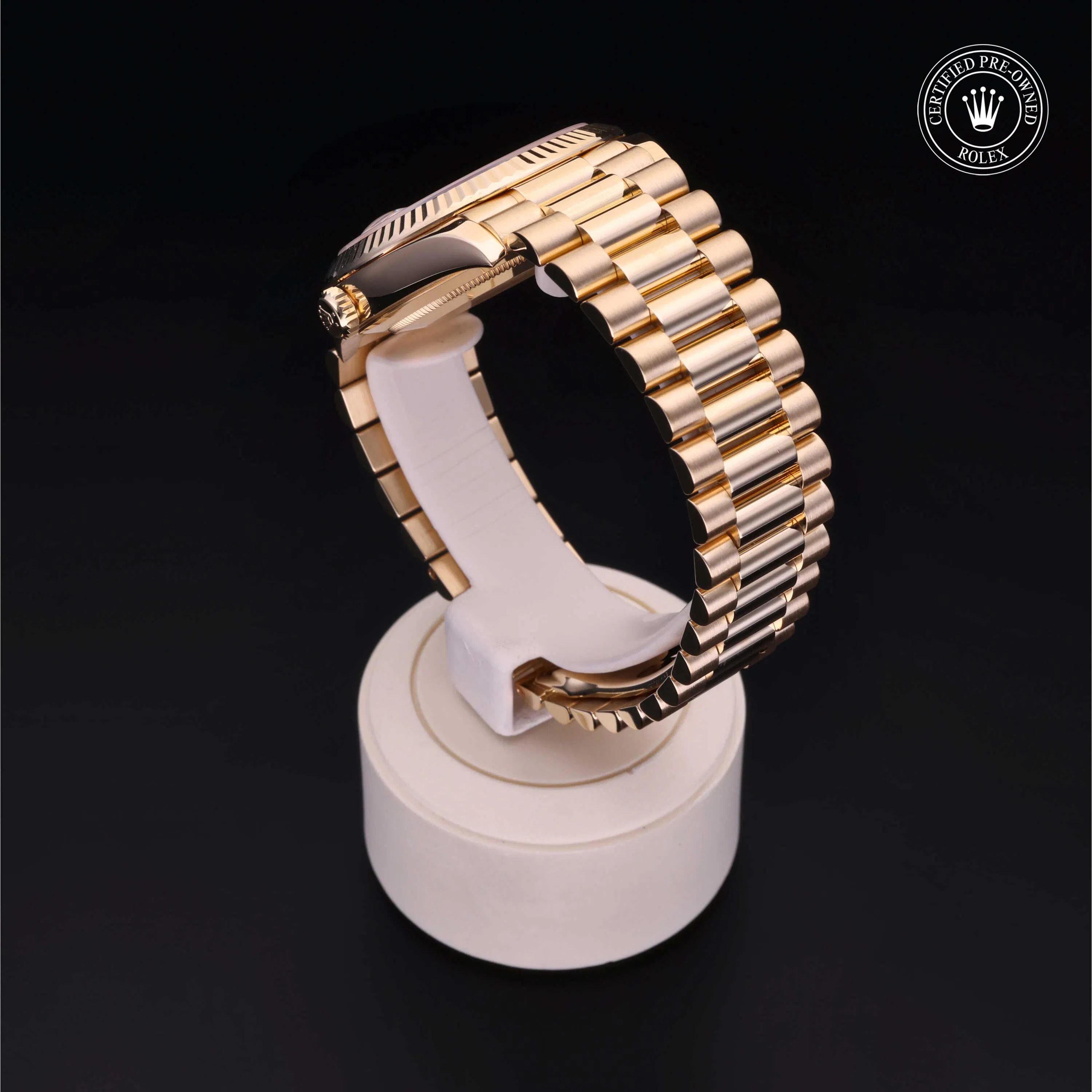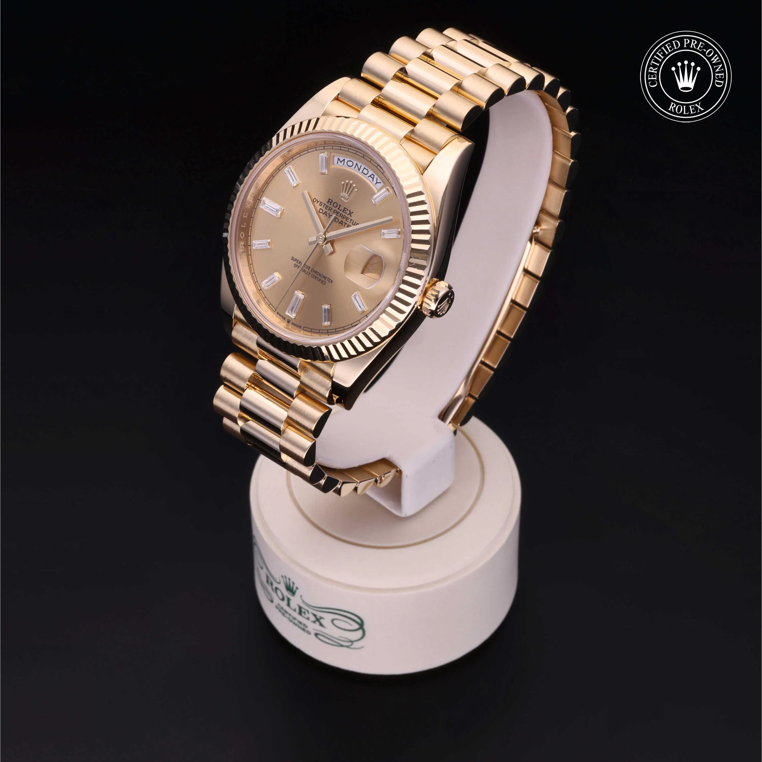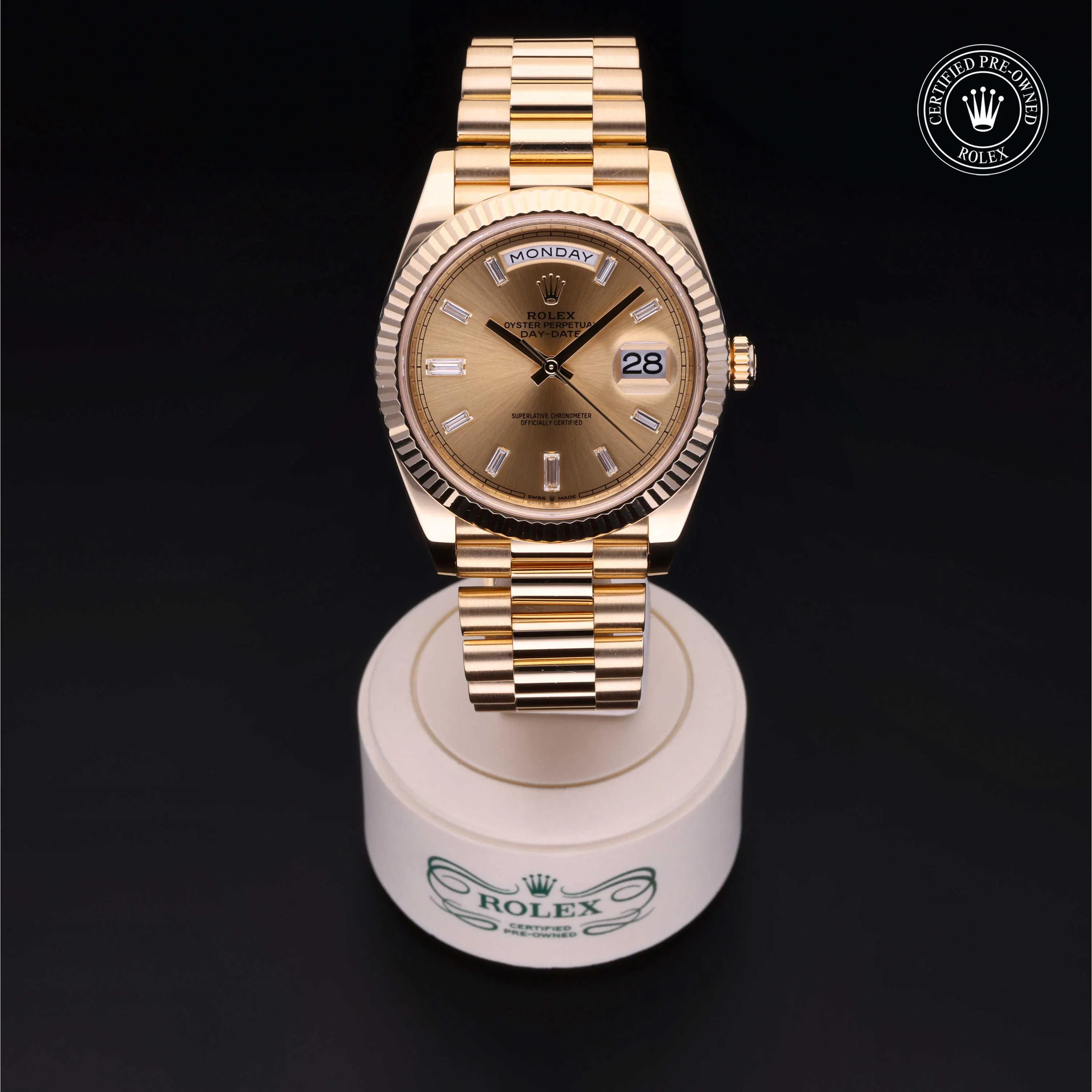 Rolex Certified Pre-Owned Day-Date (228238) self - winding automatic watch, features a 40mm 18k yellow gold case and fluted bezel surrounding a champagne diamond set dial on an 18k yellow gold president bracelet. Functions include hours, minutes, seconds, date and day. This watch has received Rolex-authorized service and certification. It comes with the original box and papers, and includes a custom Rolex Certified Pre-Owned hang tag, travel pouch and RCPO international warranty card.