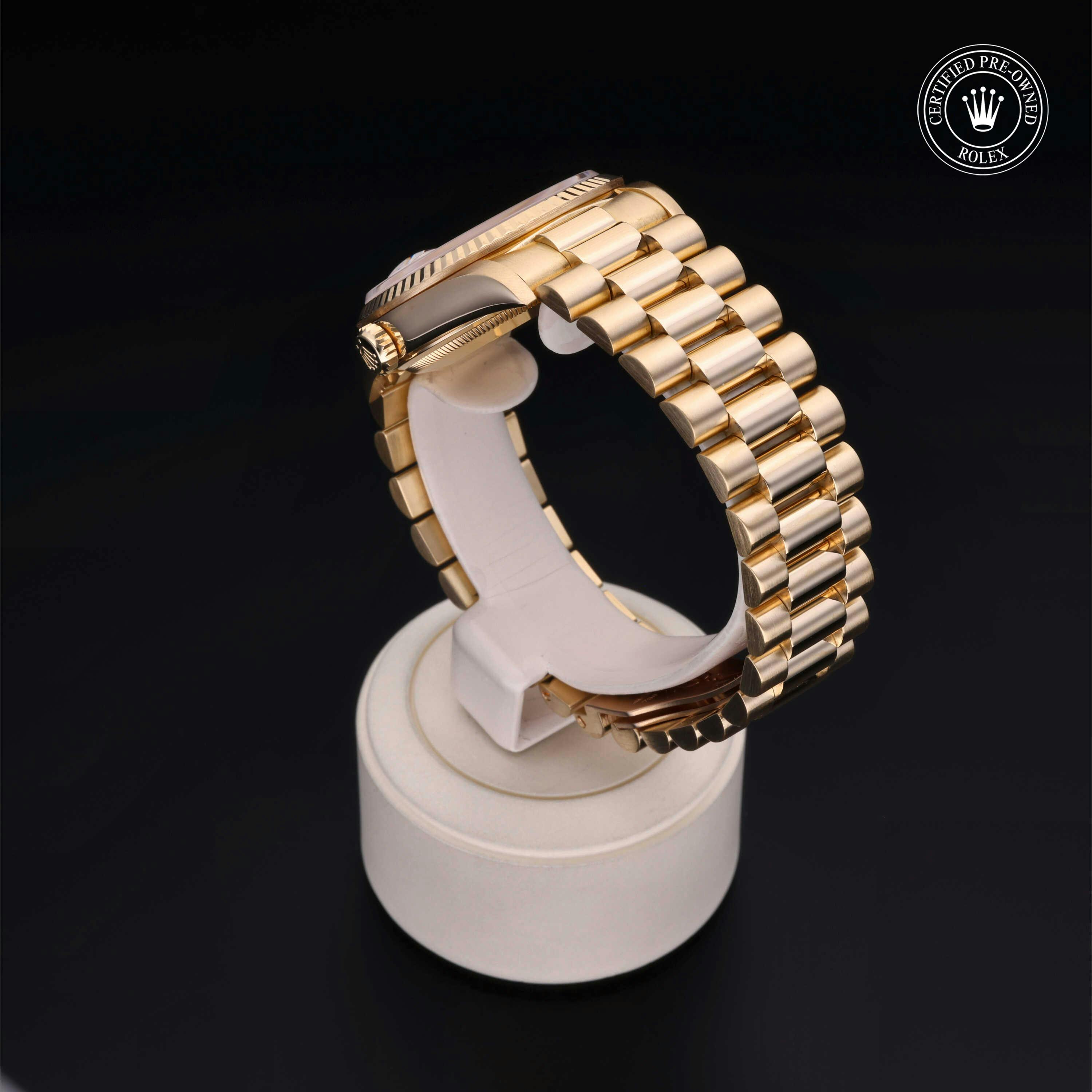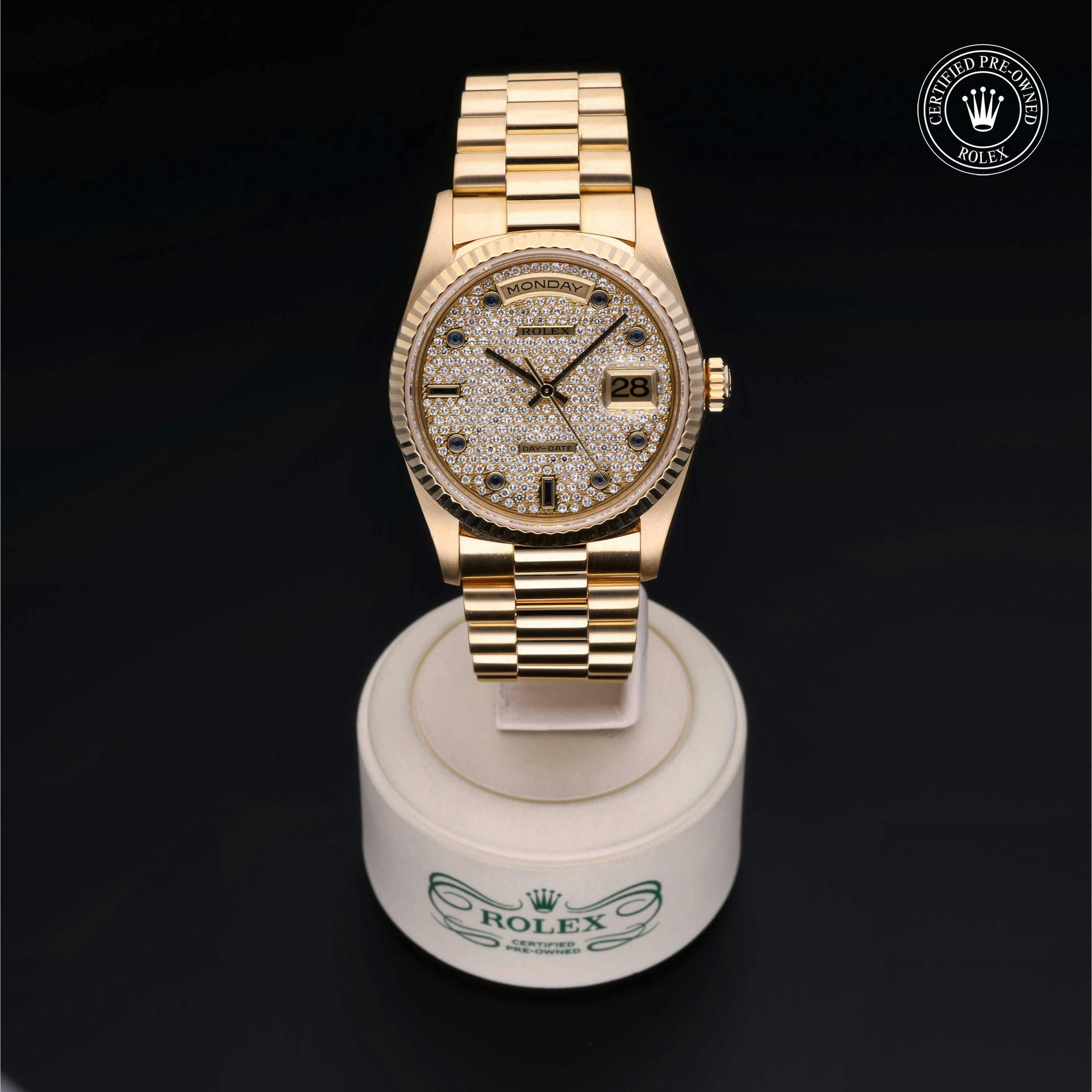 Rolex Certified Pre-Owned Day-Date (18238) self - winding automatic watch, features a 36mm 18k yellow gold case and fluted bezel surrounding a paved diamond and sapphire set dial on an 18k yellow gold president bracelet. Functions include hours, minutes, seconds, date and day. This watch has received Rolex-authorized service and certification. It comes with the original papers, and includes a custom Rolex Certified Pre-Owned hang tag, travel pouch and RCPO international warranty card.
