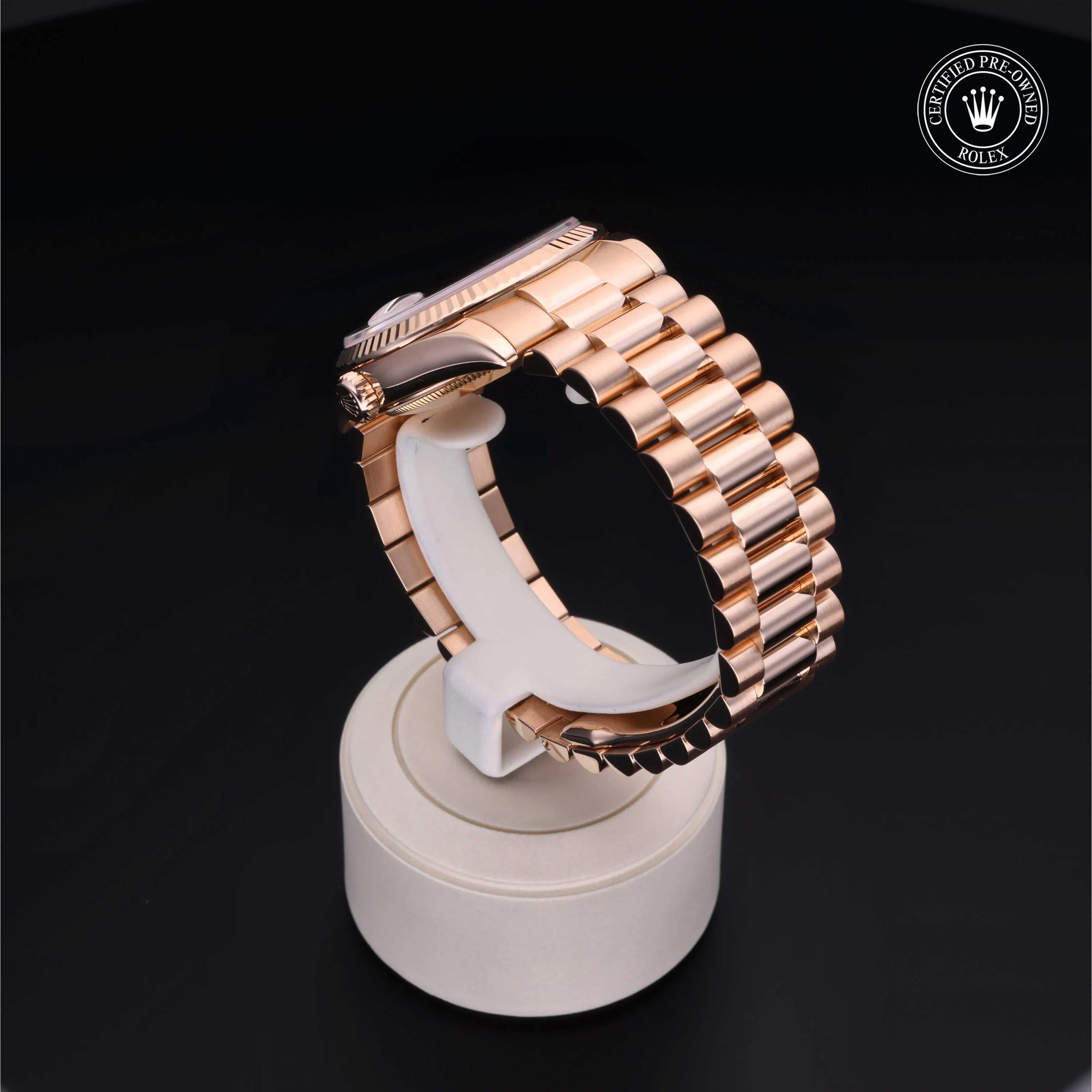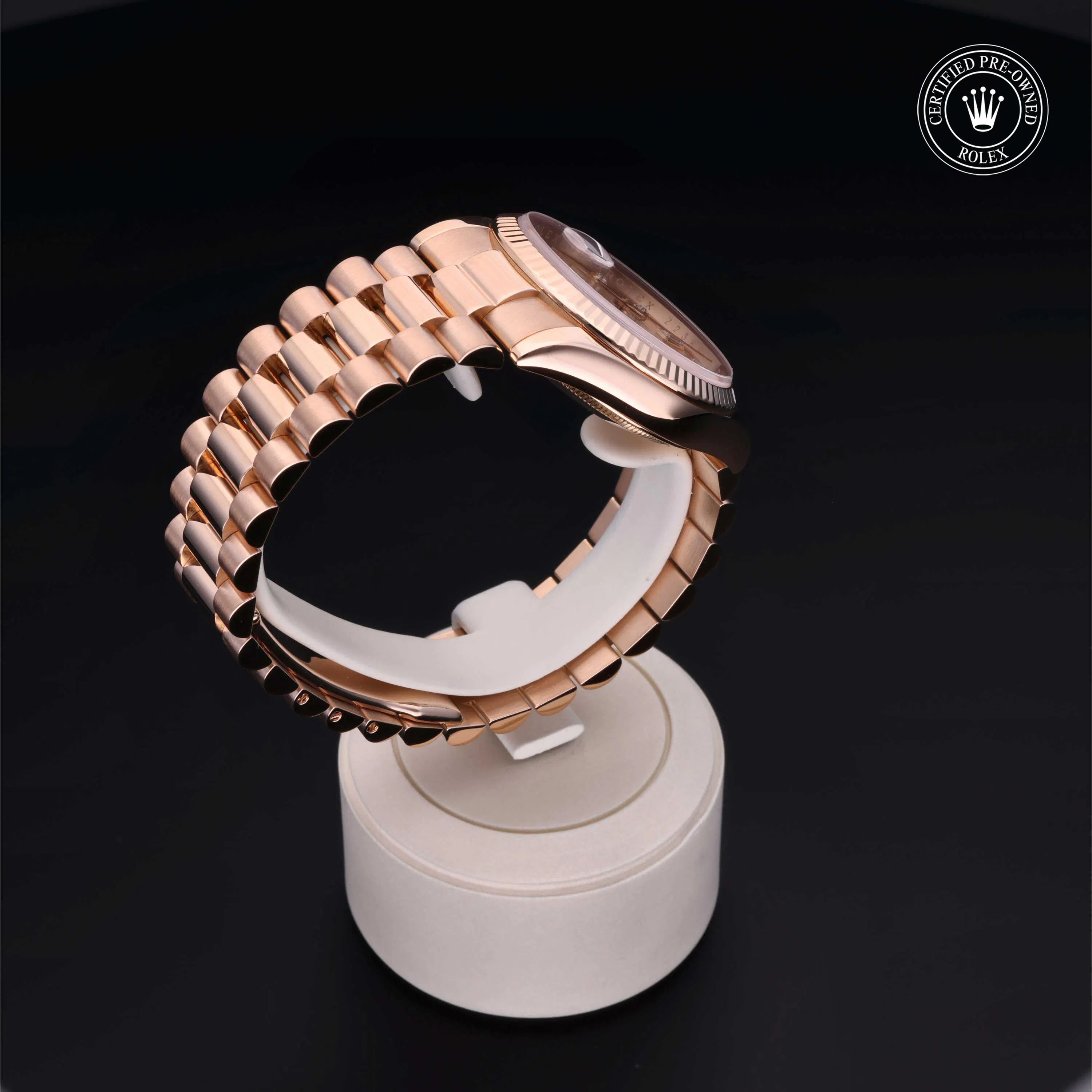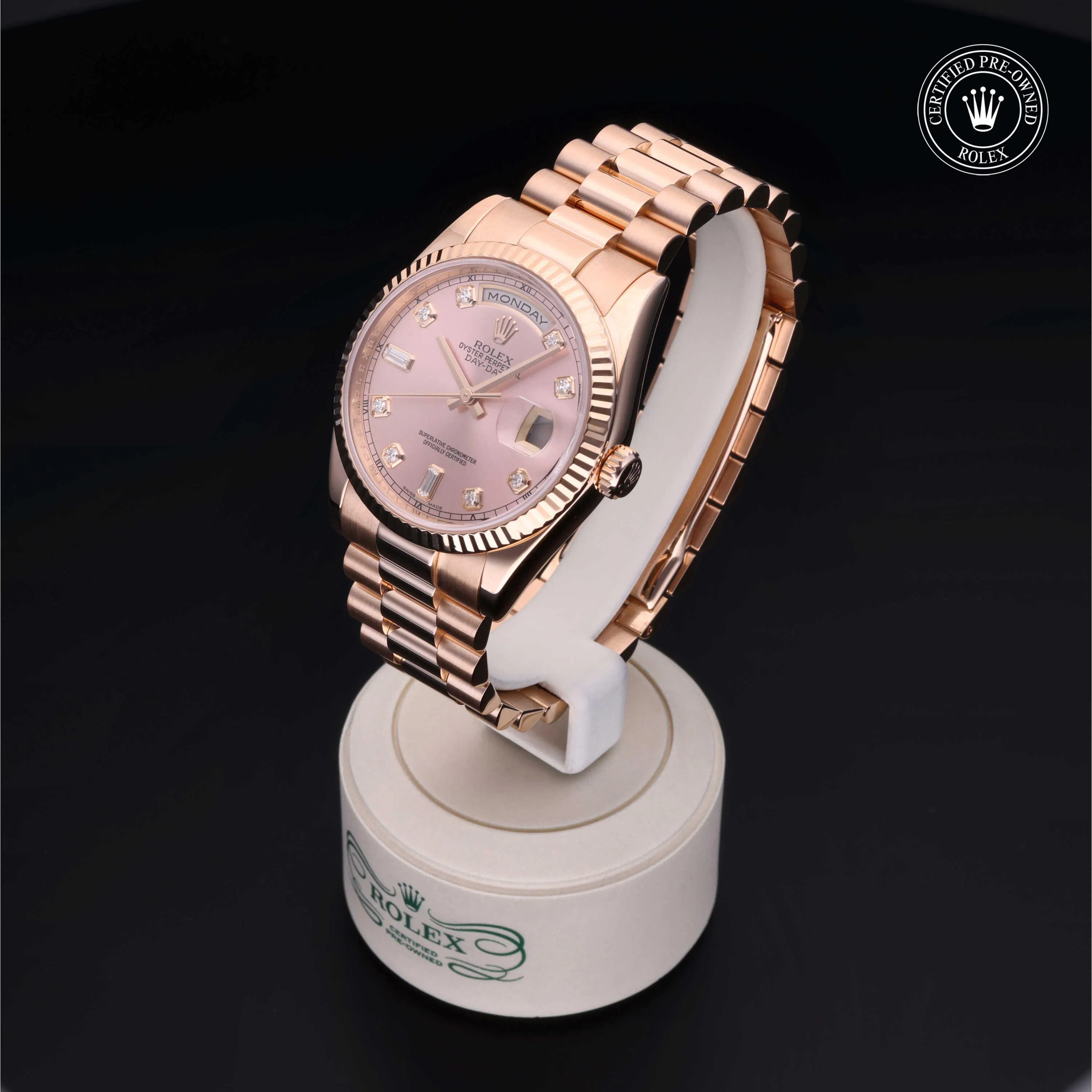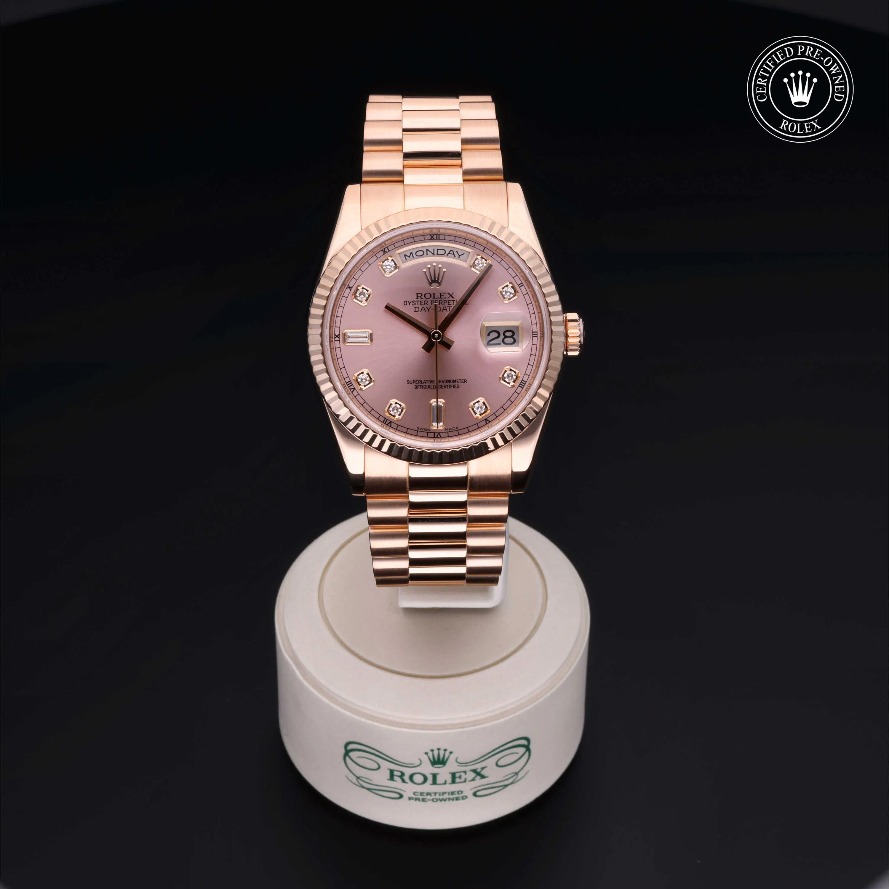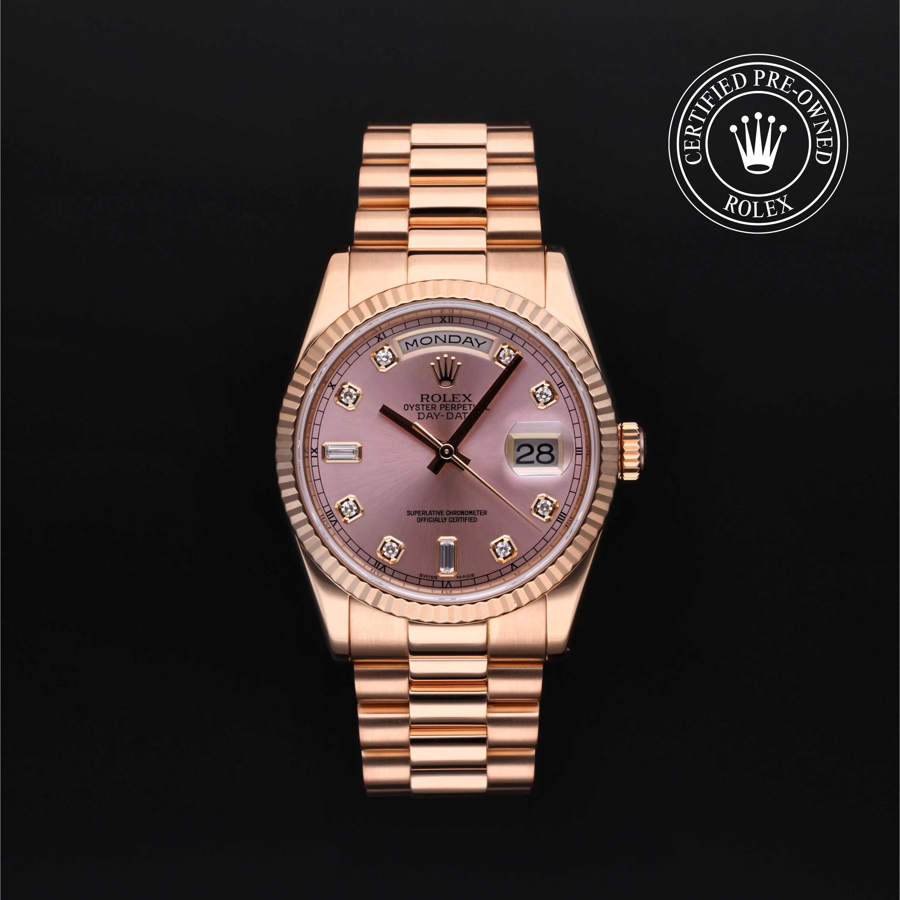 Rolex Certified Pre-Owned Day-Date (118235) self - winding automatic watch, features a 36mm 18k rose gold case and fluted bezel surrounding a pink diamond set dial on an 18k rose gold oyster bracelet. Functions include hours, minutes, seconds, date and day. This watch has received Rolex-authorized service and certification. It comes with the original papers, and incudes a custom Rolex Certified Pre-Owned hang tag, travel pouch and RCPO international warranty card.
