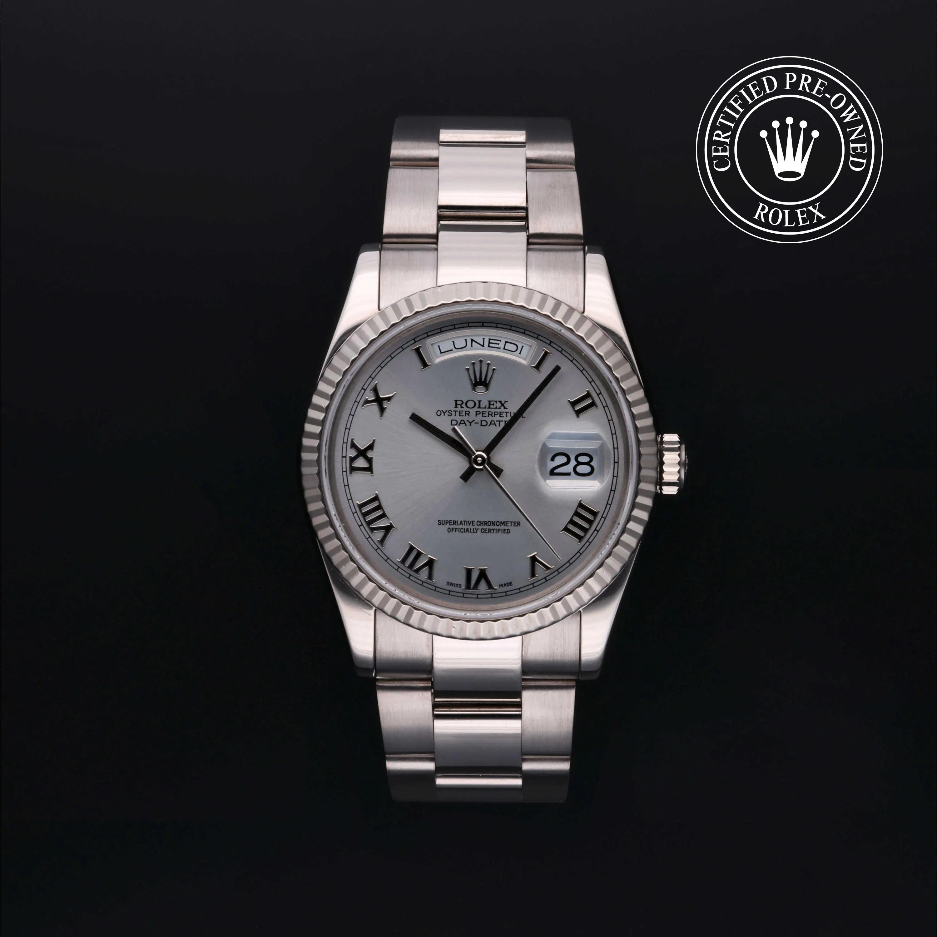Rolex Certified Pre-Owned Day-Date (118239) self - winding automatic watch, features a 36mm 18k white gold case and fluted bezel surrounding a rhodium dial on an 18k white gold Oyster bracelet. Functions include hours, minutes, seconds, date and day. This watch has received Rolex-authorized service and certification. It does not come with the original box or papers, but includes a custom Rolex Certified Pre-Owned hang tag, travel pouch and RCPO international warranty card.