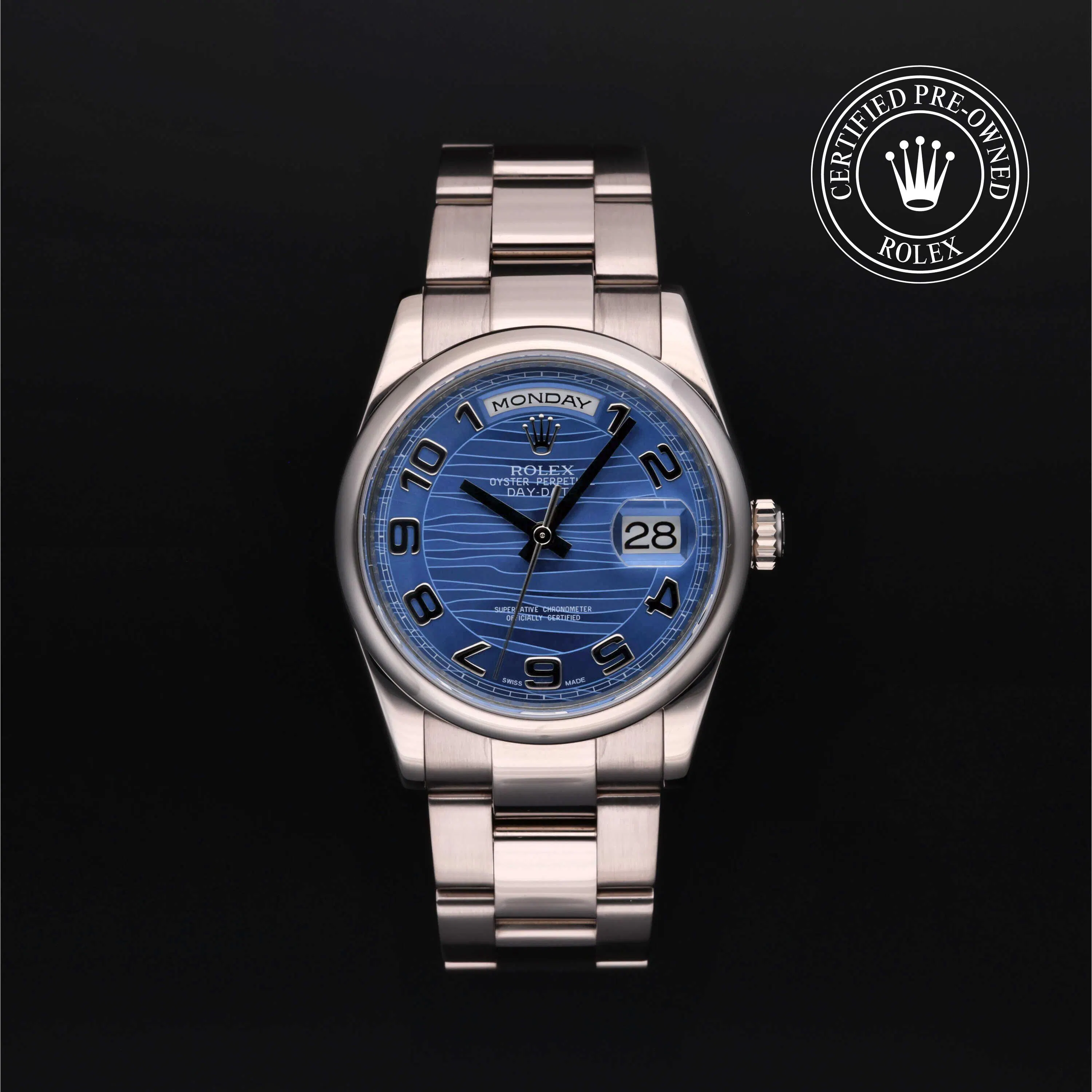 Rolex Certified Pre-Owned Day-Date (118209) self - winding automatic watch, features a 36mm 18k white gold case and domed bezel surrounding a blue Wave dial on an 18k white gold Oyster bracelet. Functions include hours, minutes and seconds. This watch has received Rolex-authorized service and certification. It comes with the original papers, and includes a custom Rolex Certified Pre-Owned hang tag, travel pouch and RCPO international warranty card.