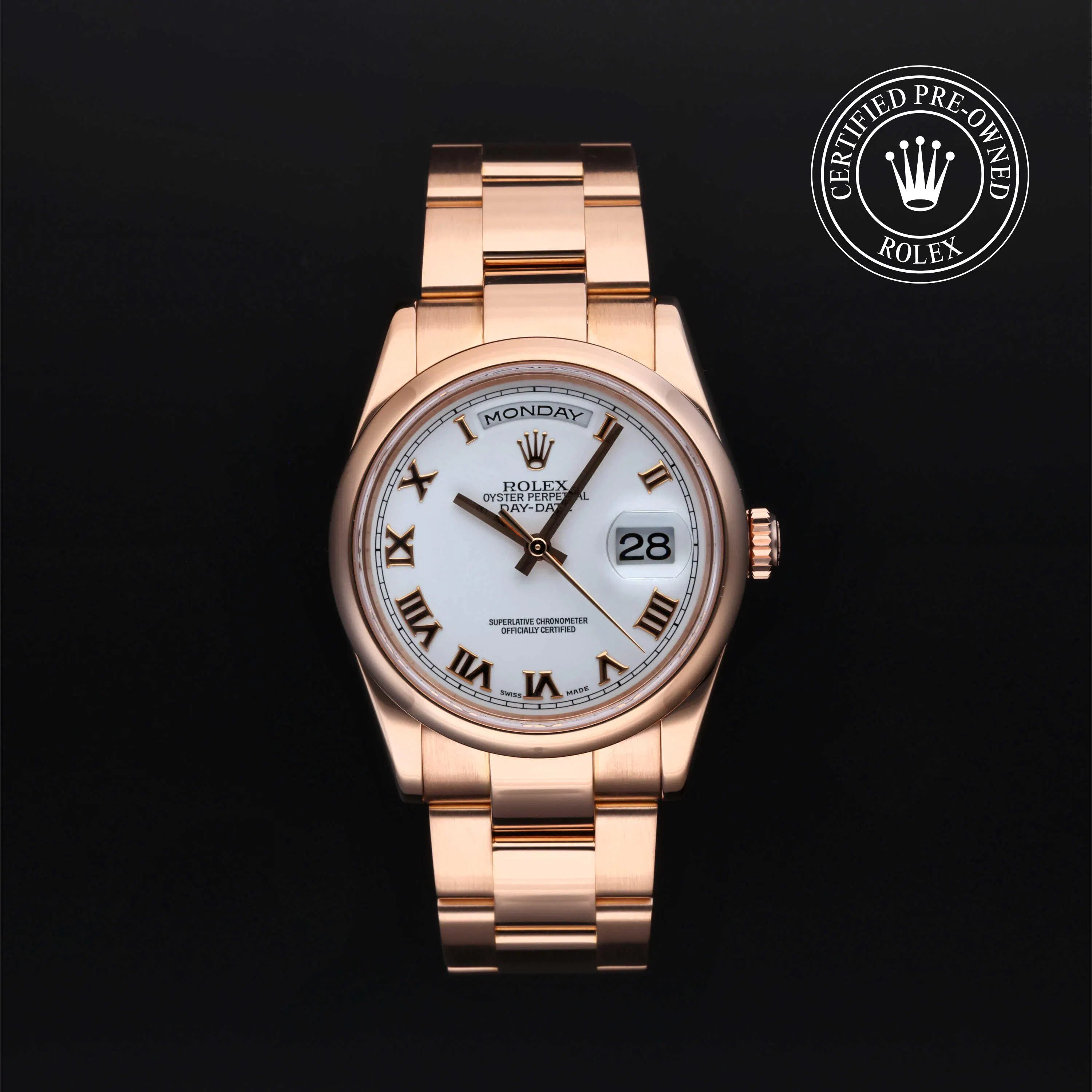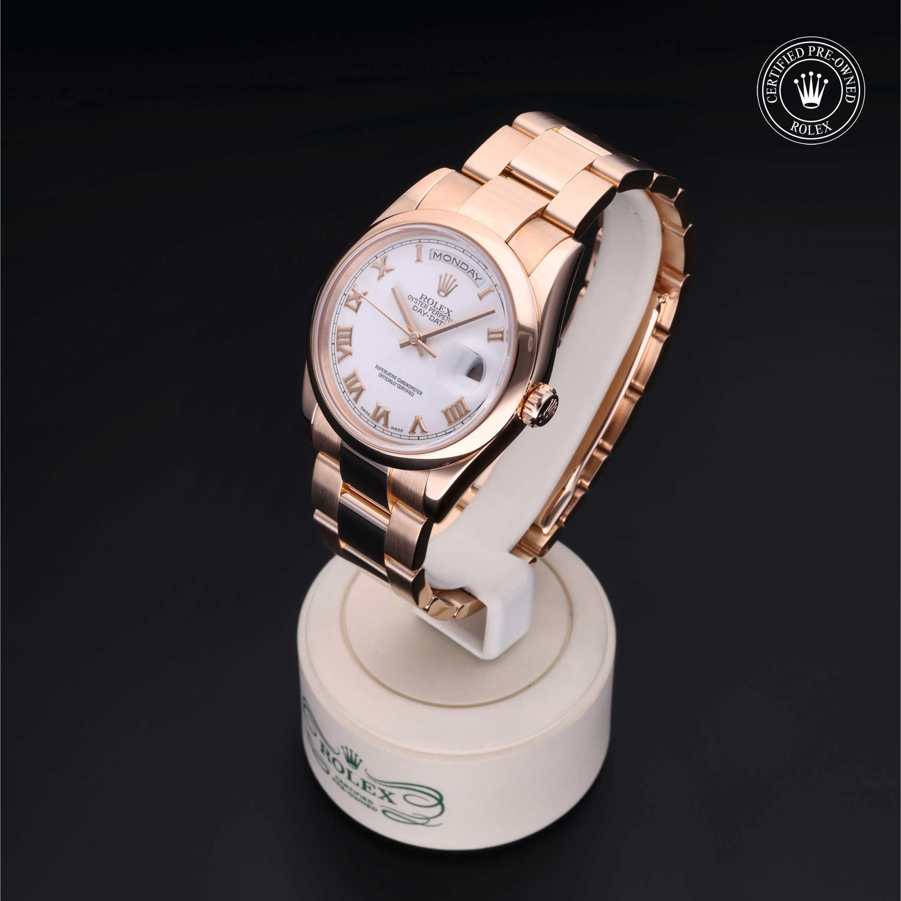 Rolex Certified Pre-Owned Day-Date (118205) self - winding automatic watch, features a 36mm 18k rose gold case and domed bezel surrounding a white dial on an 18k rose gold Oyster bracelet. Functions include hours, minutes, date and day. This watch has received Rolex-authorized service and certification. It does not come with the original box or papers, but includes a custom Rolex Certified Pre-Owned hang tag, travel pouch and RCPO international warranty card.