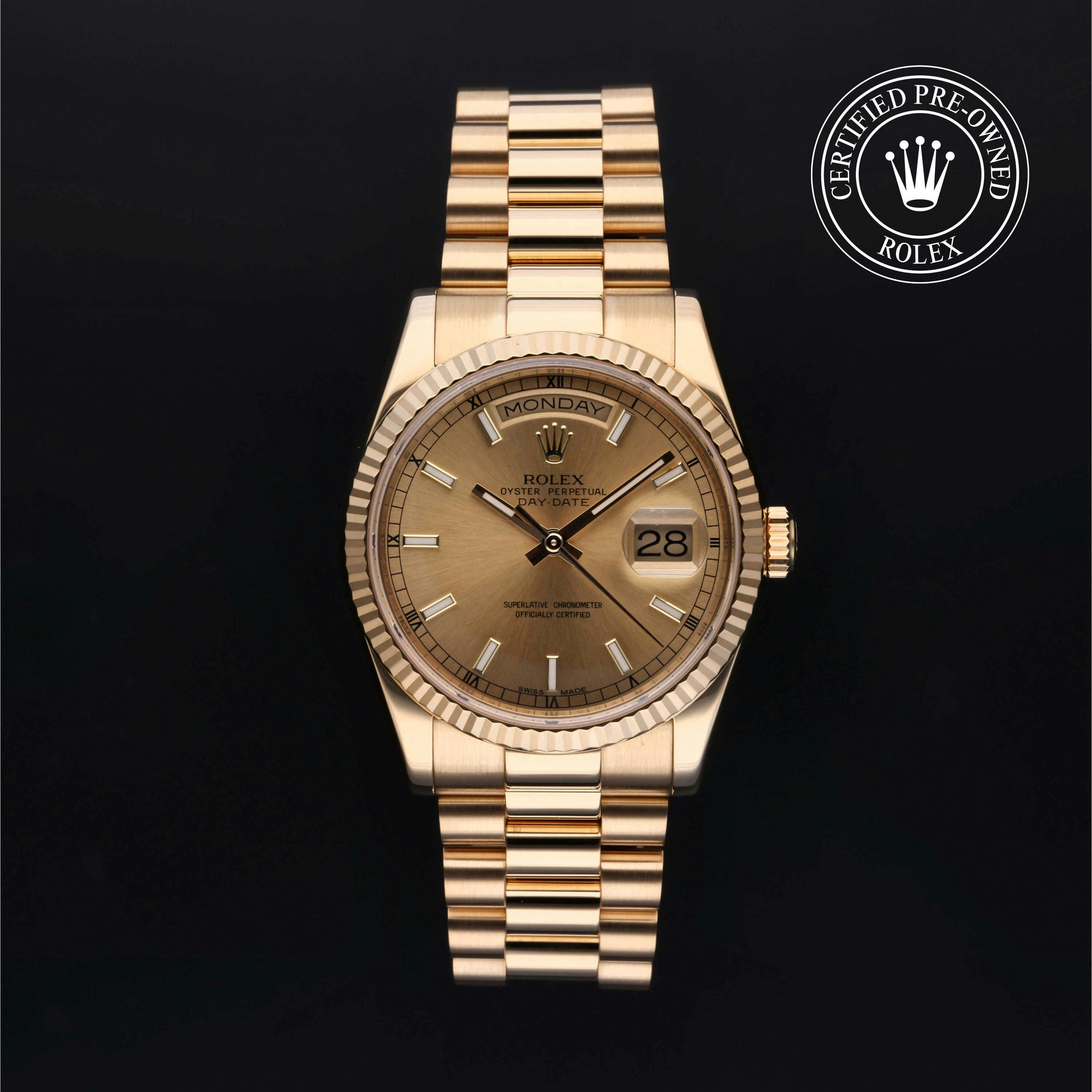 Shop our selection of Rolex Certified Pre-Owned Day-Date watches — including sought-after used Rolex President models in yellow gold, white gold, and platinum. Explore popular 36mm and 40mm Day-Date references available online and in-store. Among the many outstanding watches in the Rolex catalogue, the Day-Date is the watch that celebrates achievement. There are a few characteristics of this piece that set it apart from the rest of the line-up. First and foremost is the "day" indication at 12 o'clock.