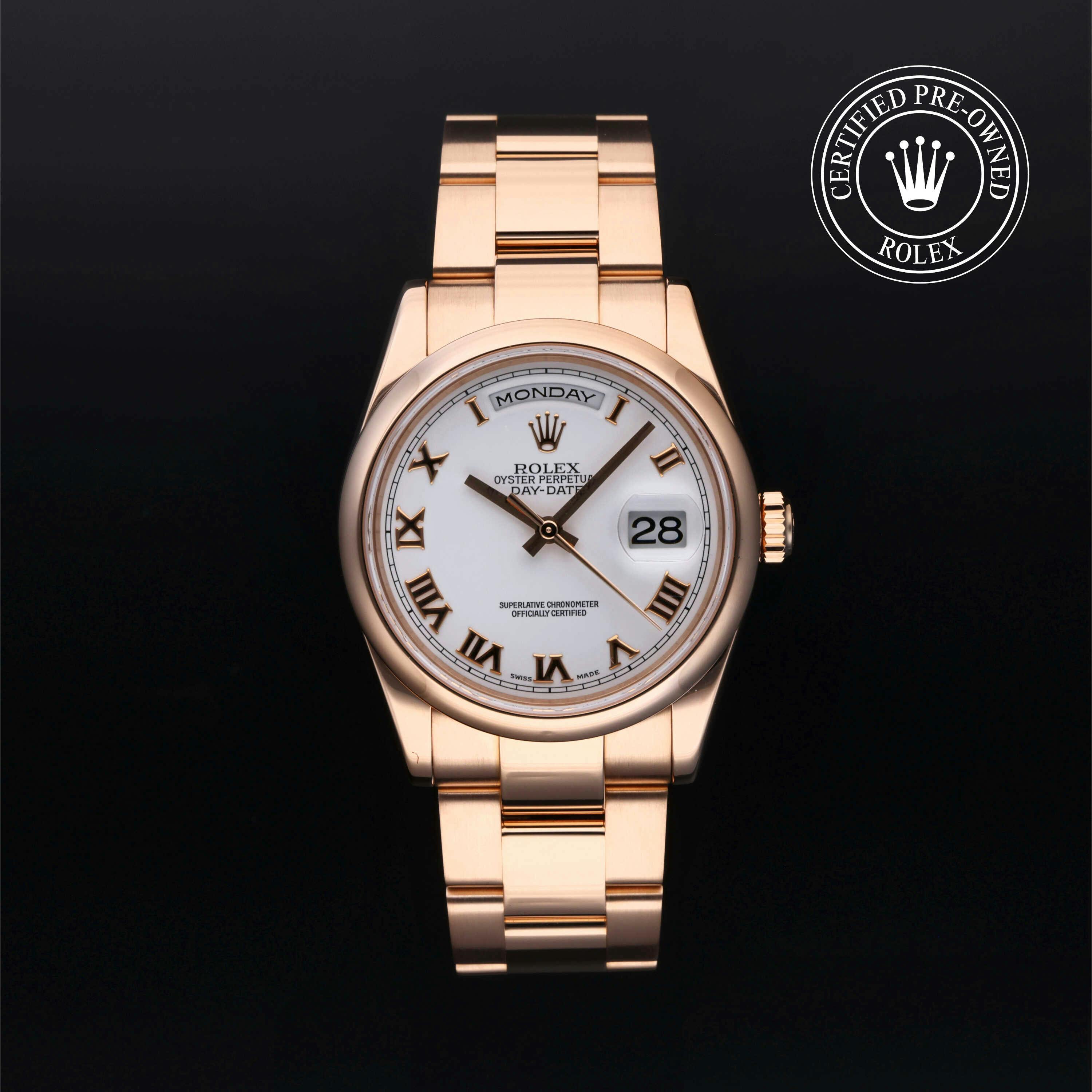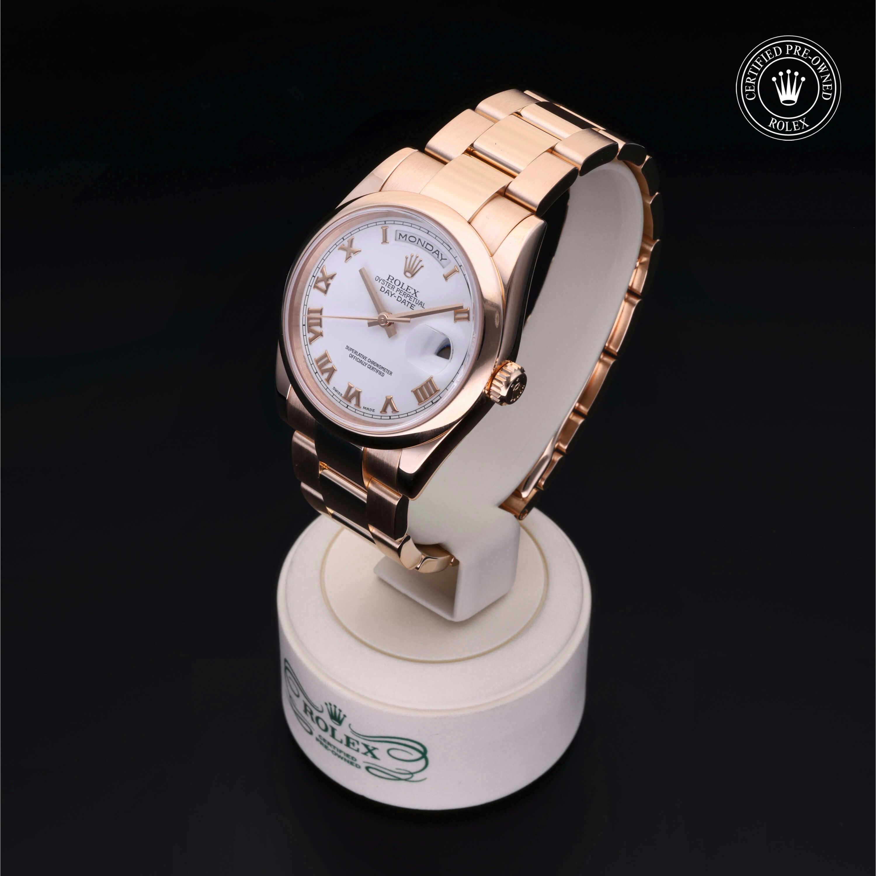 Pre-Owned Rolex Day-Date (118205) self - winding automatic watch, features a 36mm 18k rose gold case surrounding a white dial on a strap. Functions include hours, minutes, date, day This watch has been serviced and does not come with box or papers. Time remaining on the Manufacturer's service warranty! This watch will be ready to ship in 5-7 days!