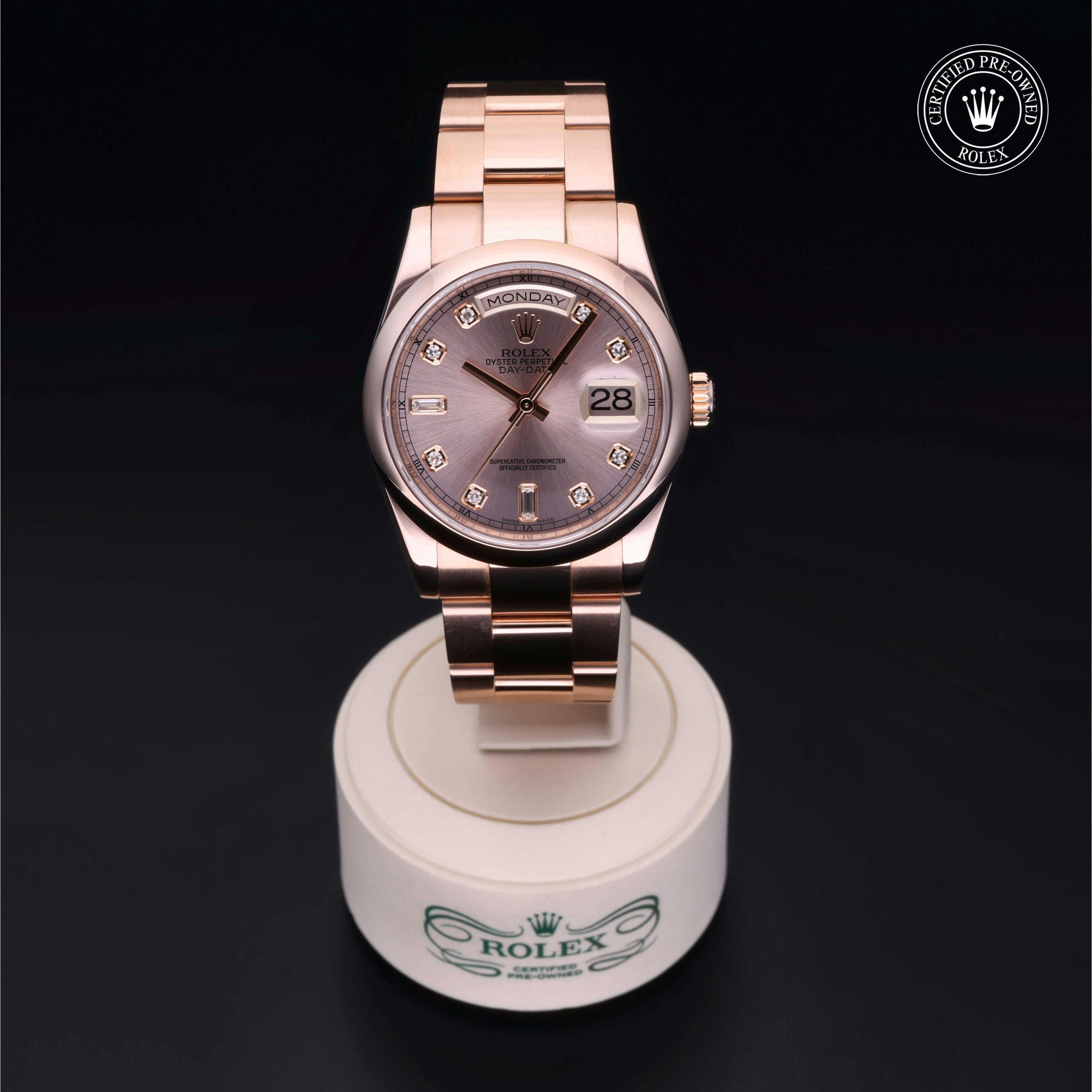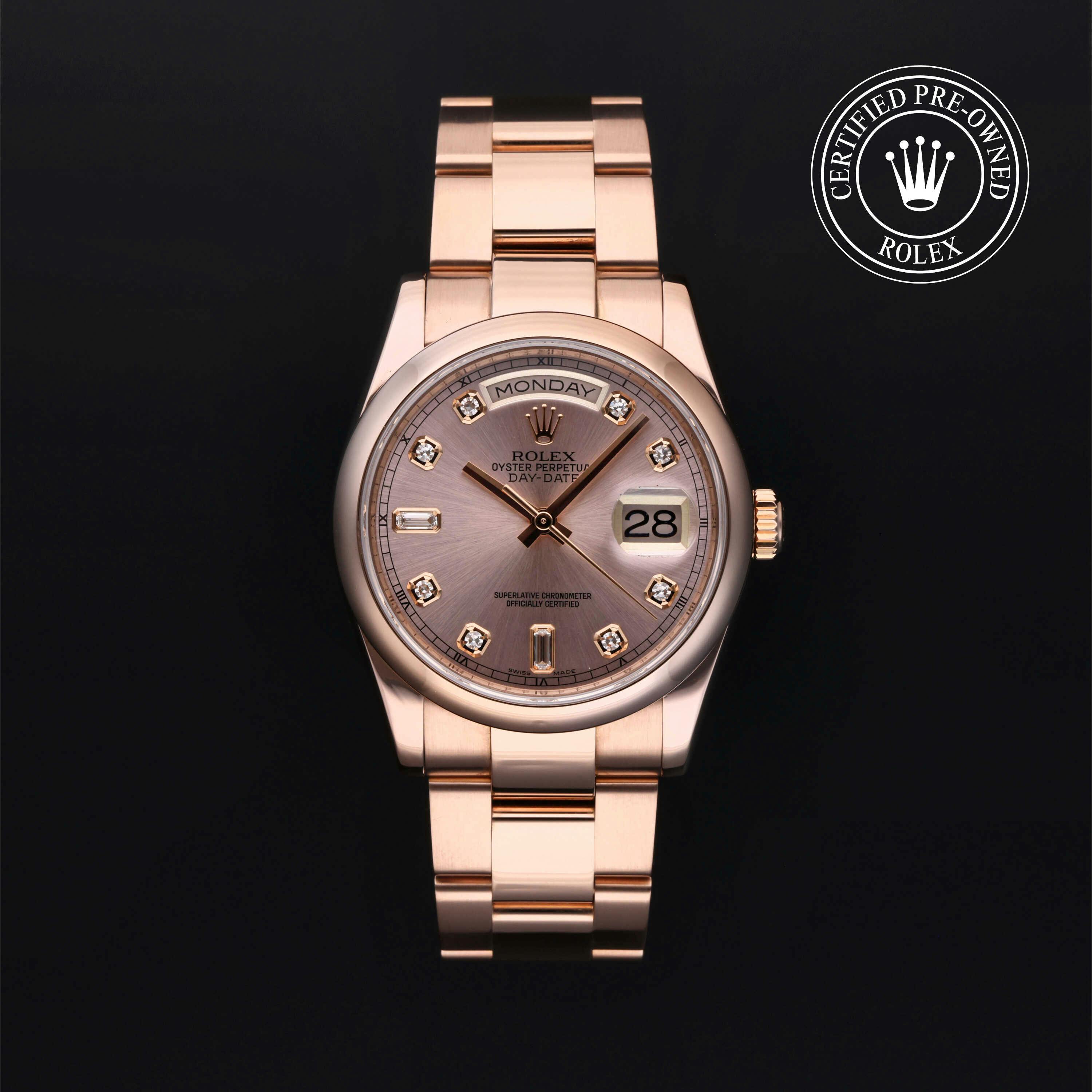 Pre-Owned Rolex Day-Date (118205F) self - winding automatic watch, features a 36mm 18k rose gold case surrounding a pink dial on a bracelet with folding buckle. Functions include hours, minutes, seconds, date, day This watch has been serviced and comes with the original box. Time remaining on the Manufacturer's service warranty!